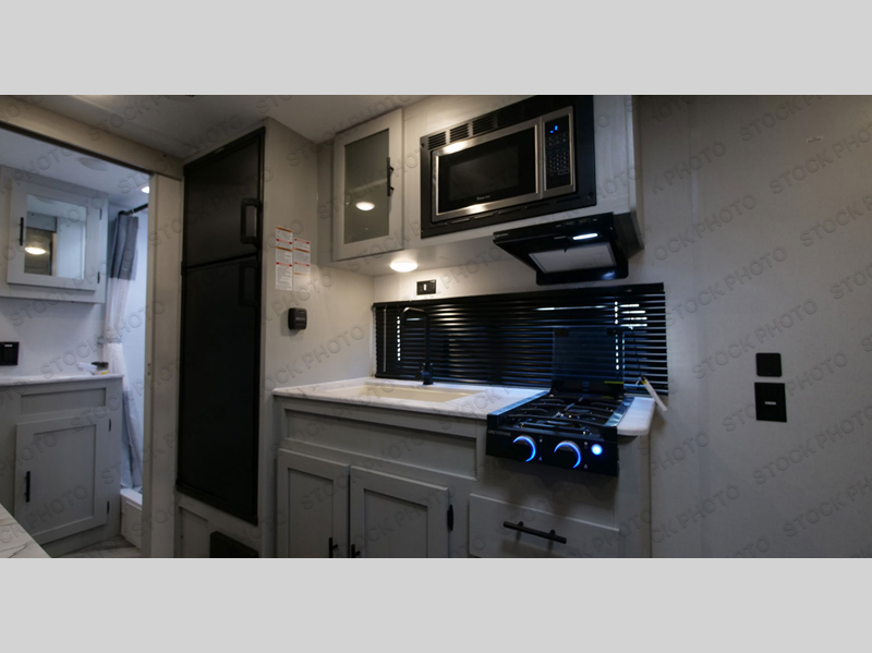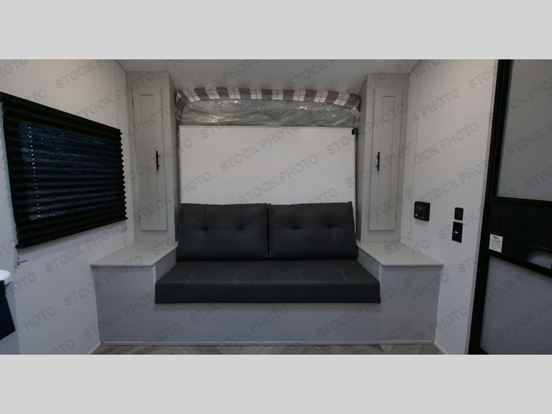 This travel trailer with a full rear bath and versatile sleeping space is your ticket to fun and adventure. While you're putting out the 12' power awning, you can grab a cold drink from the outdoor refrigerator and grab the lawn chairs from the full pass-through storage. There is a two burner cooktop and a microwave oven to prepare your meals in, and a booth dinette to dine at. You'll love the RV queen Murphy bed to sleep on at night, and the sofa with storage to relax on during the day!