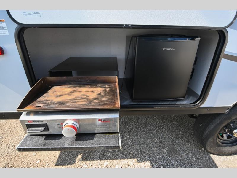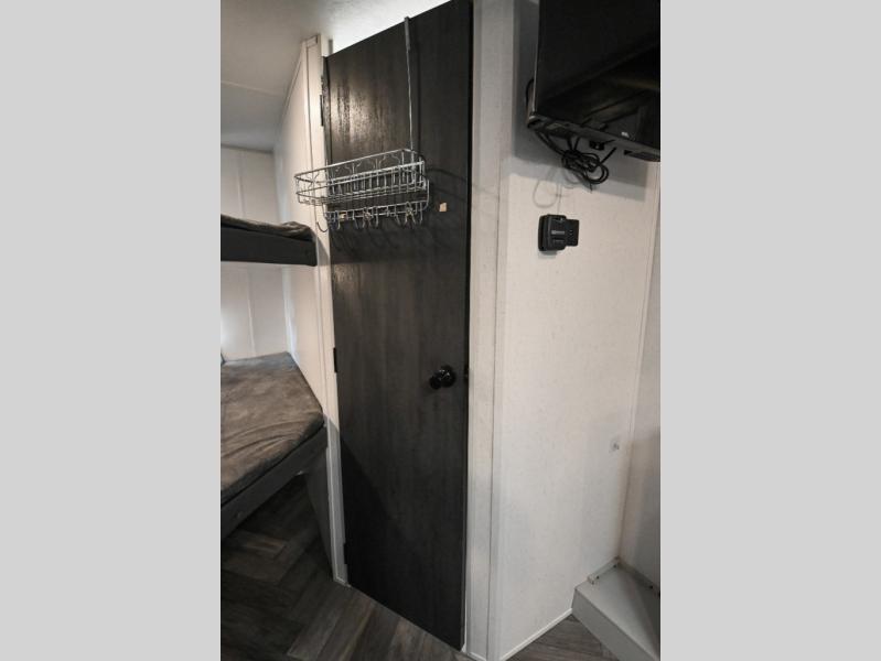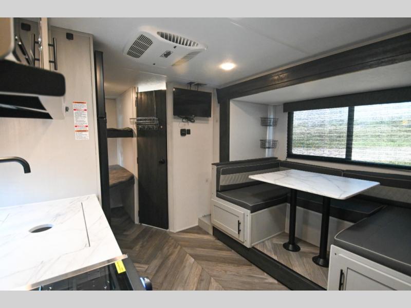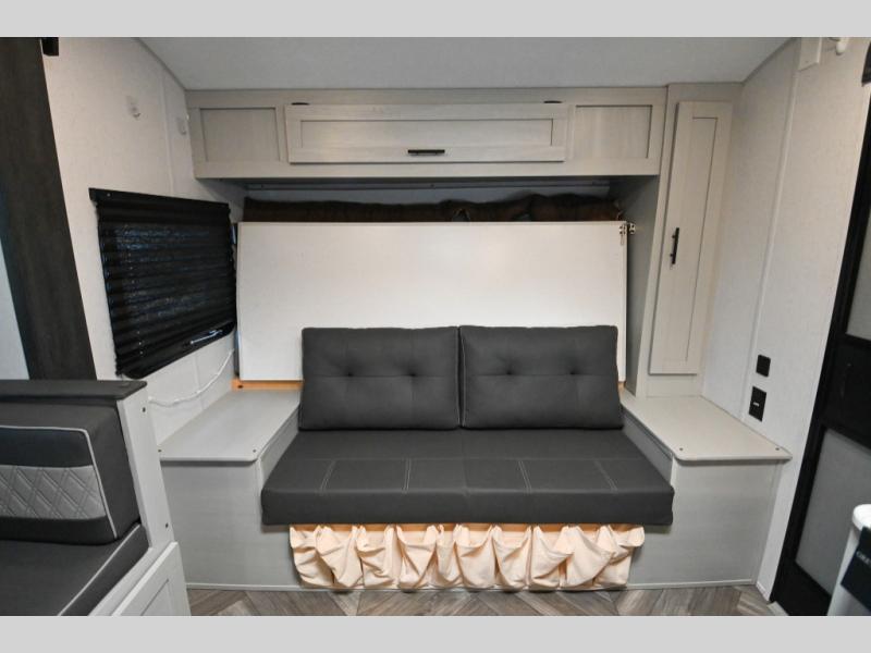 Bring your whole crew along for trips in this roomy travel trailer that can sleep eight people each night. Once you've set up the 14' power awning with LED lights, make lunch on the outdoor LP griddle, and there is an outdoor refrigerator for cold drinks. Explore some trails or take your fishing poles down to the river, then head back to the trailer to clean up in the full bath. The kids may want to rest on the double-size bunks, while the adults play a game around the U-shaped dinette. This model also includes a sofa with storage access, plus a Murphy bed that lowers over the sofa when you're ready for bed. Don't let this travel trailer slip away!