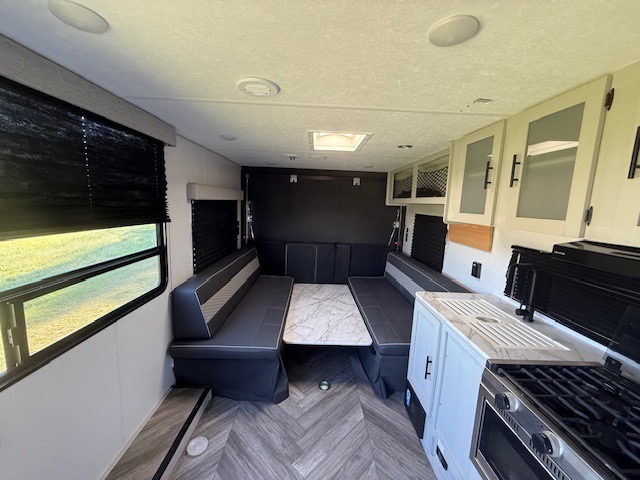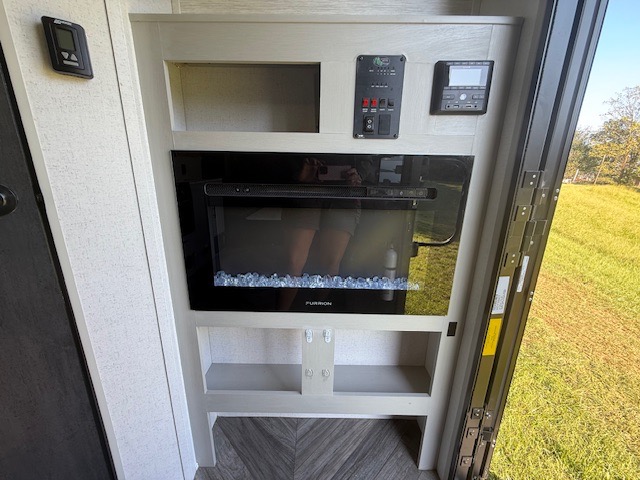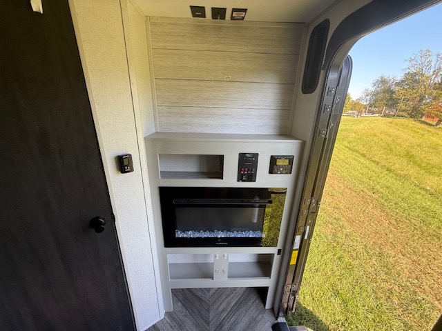 You can't go wrong with this lightweight toy hauler, so pack up and head out! The 3,000 lb. ramp door will make unloading easier than ever, plus this area converts to a 1,500 lb. patio to entertain guests. You can enjoy lunch at the sofas with a table, or sit outdoors under the 15' power awning with LED lights. After you've hit the trails, clean up in the walk-through bath before heading off to bed on the queen bed. This model also includes a fireplace in the main living area that will make it feel a little more like home.