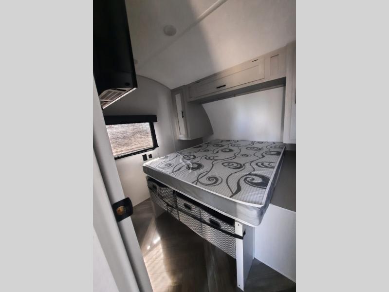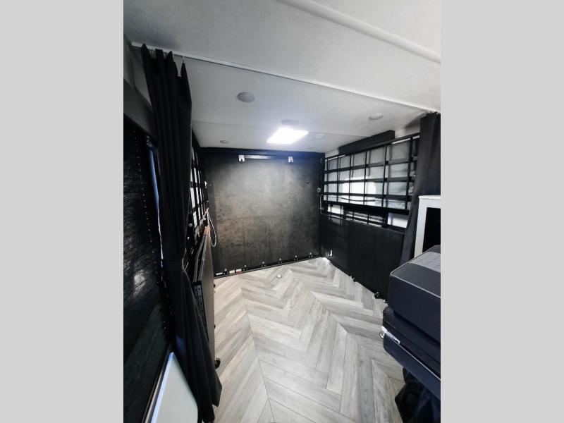 This model includes two sofa sleepers with a table, or you can choose the optional quad bunk system to sleep even more friends. The main living area will feel more like home with a fireplace, and the full kitchen will allow you to prepare meals for your whole group. If you enjoy cooking outdoors then you will love the outdoor griddle and refrigerator, plus there is an 18' power awning here for shade. After dinner is cleaned up, head to the front private bedroom for a great night's rest and plan to do it all over again tomorrow!