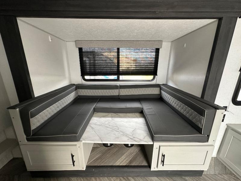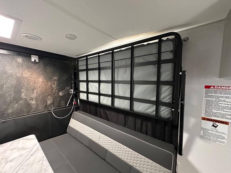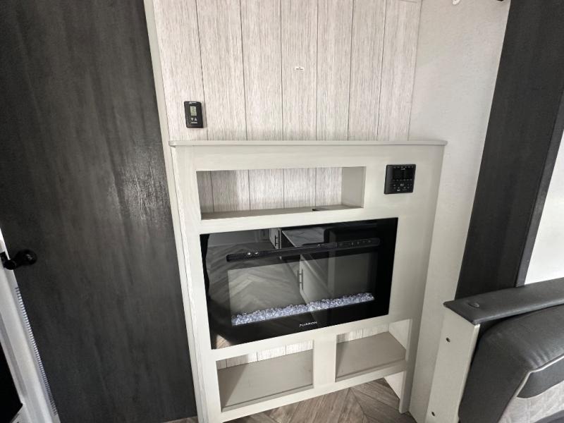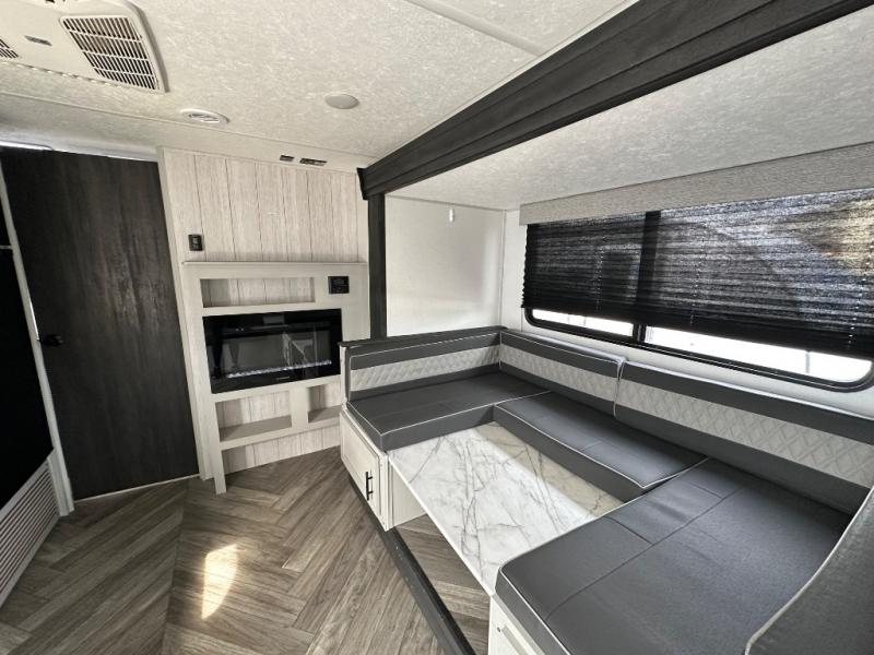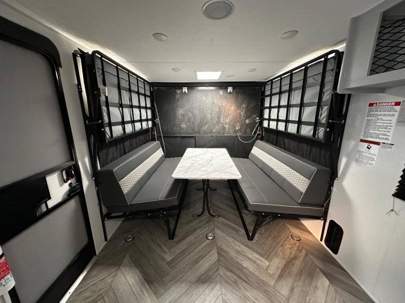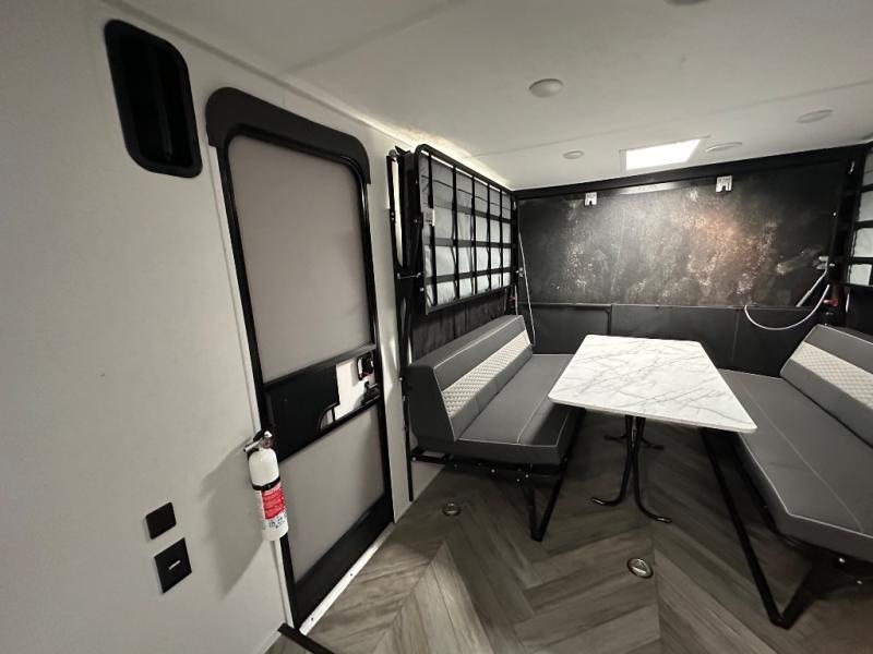 Hit the trails in this single slide out toy hauler for six! You can choose the optional quad bunk system in place of the two sofa sleepers for even more sleeping space. Enjoy the 1,500 lb. patio after you've unloaded your toys from the 11' 3" separate garage, and the walk-through bath will be convenient for everyone. Meals can be prepared on the three burner cooktop, and you can dine around the U-shaped dinette by the fireplace. This model also includes a front RV queen Murphy bed so you can enjoy sleeping space at night and seating space during the day!