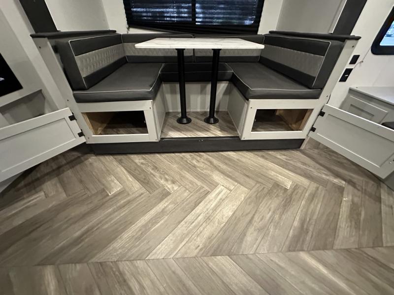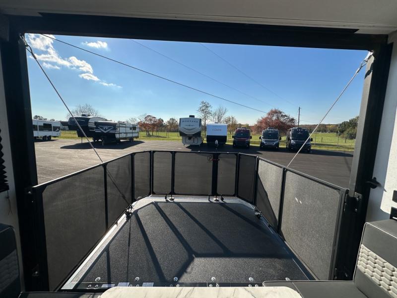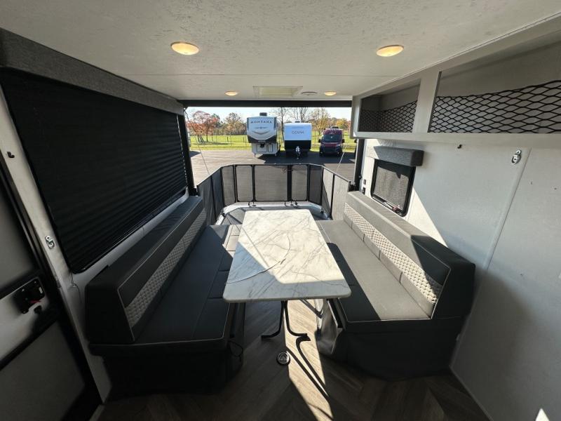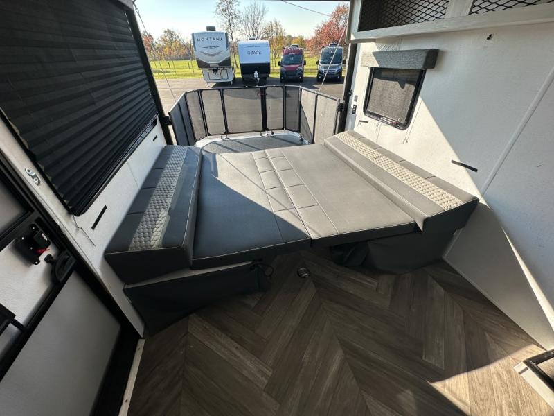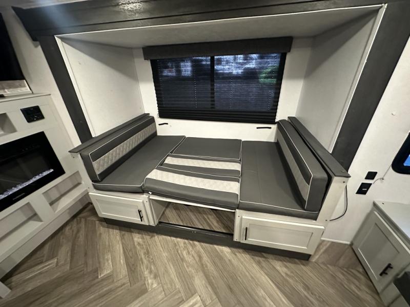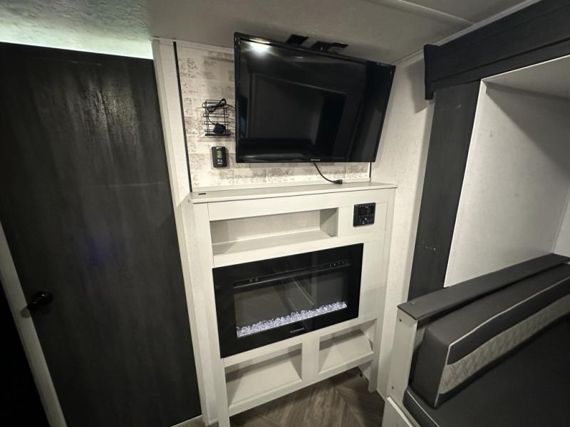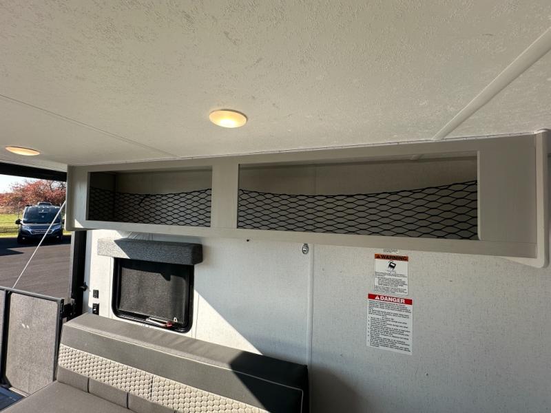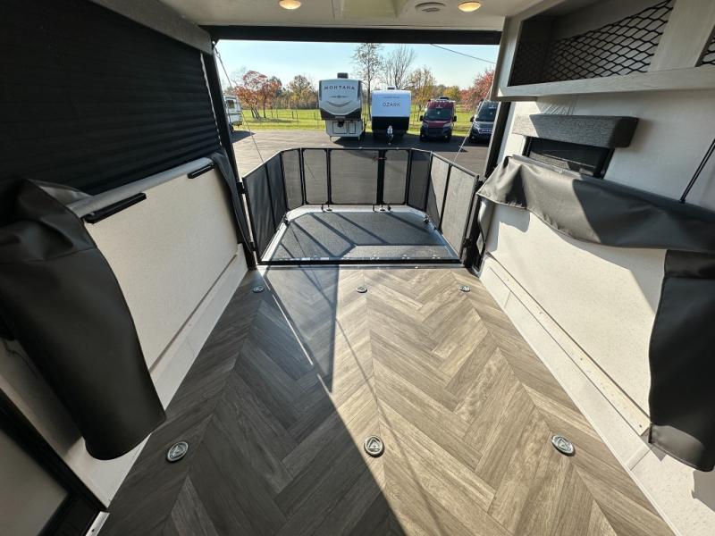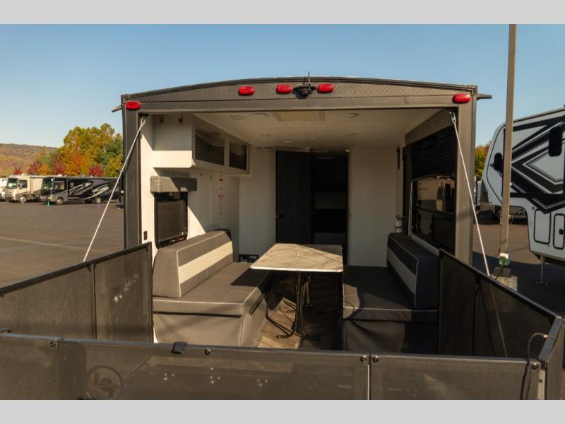 Hit the trails in this single slide out toy hauler for six! You can choose the optional quad bunk system in place of the two sofa sleepers for even more sleeping space. Enjoy the 1,500 lb. patio after you've unloaded your toys from the 11' 3" separate garage, and the walk-through bath will be convenient for everyone. Meals can be prepared on the three burner cooktop, and you can dine around the U-shaped dinette by the fireplace. This model also includes a front RV queen Murphy bed so you can enjoy sleeping space at night and seating space during the day!