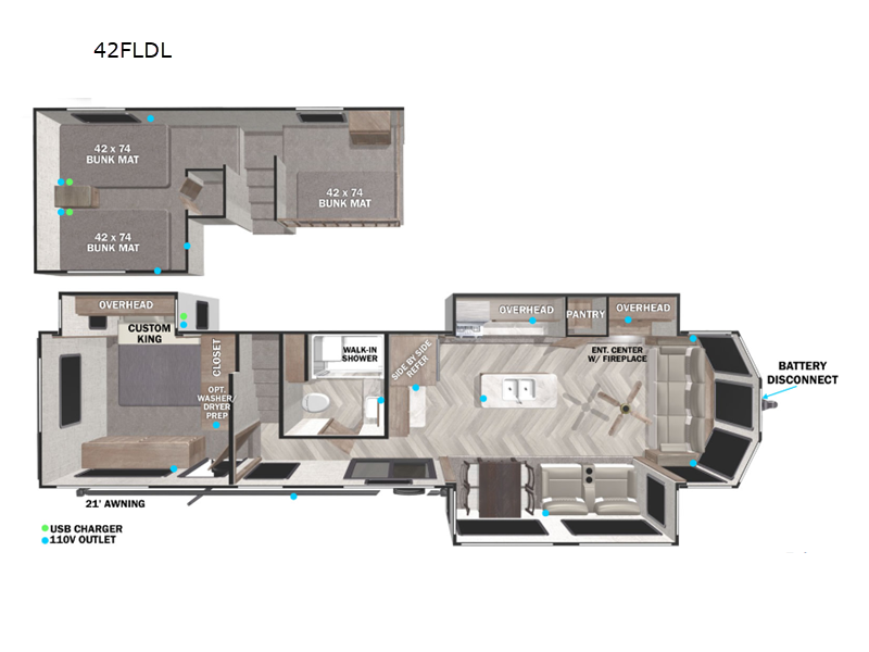 Keep your family happy by providing them with plenty of space and accommodations in this Wildwood Grand Lodge destination trailer! The living area is such a gorgeous feature in this unit because of the panoramic front windows that allow you to feel as if you're right in the heart of your surroundings, and as you sit on the sofa next to the fireplace, you'll appreciate the ambiance it brings to this space. If you've decided to stay up late outside underneath the 21' awning, you can rest assured that you'll be able to get back inside quietly without waking anyone up because the second entry door leads directly into the rear private bedroom for your convenience so you can quickly fall asleep on your own custom king bed. And the kids will love the double loft with three bunk mats and extra floor space to play.