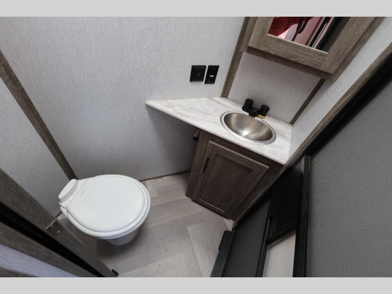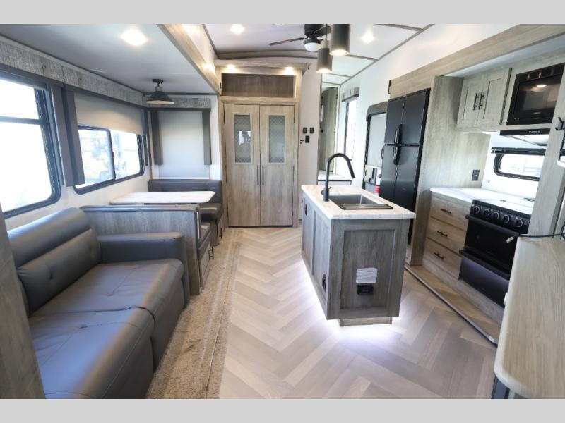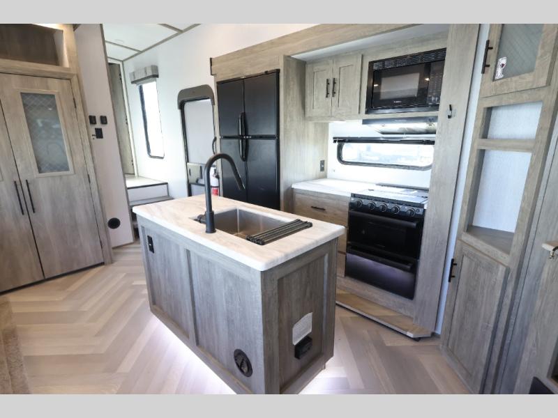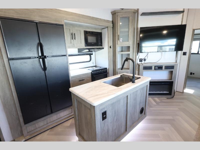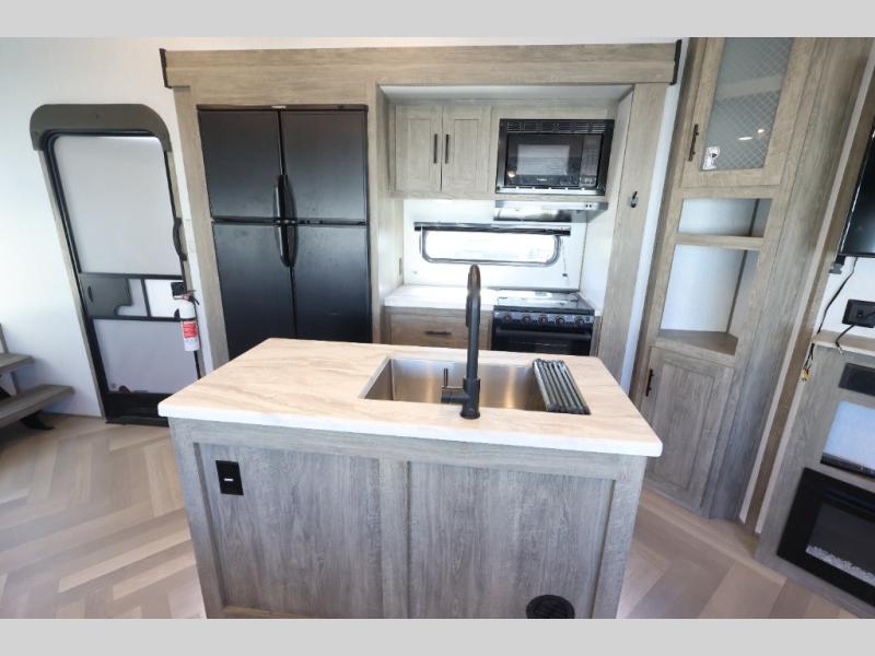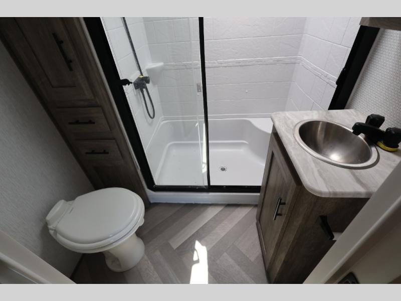 With any Wildwood Heritage Glen travel trailer and fifth wheel by Forest River, the quality construction and attention to detail and design along with a bright and welcoming interior allows you to relax in comfort with conveniences while exploring outdoors. The herringbone Designer's Choice Congoleum flooring is unique, beautiful and durable, and the Hudson wood agreeable grain cabinetry with matte black cabinet hardware and hidden hinges on the cabinet doors is stylish and beautiful. More features that provide convenience include the power stabilizer jacks, the Texas-Size pass-through storage, and the central switch center plus the back-up camera and roof mounted solar panel prep give you choices. There are many more features included whether you choose a travel trailer or fifth wheel!