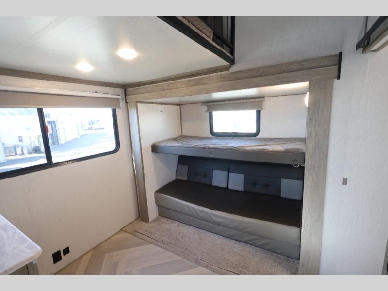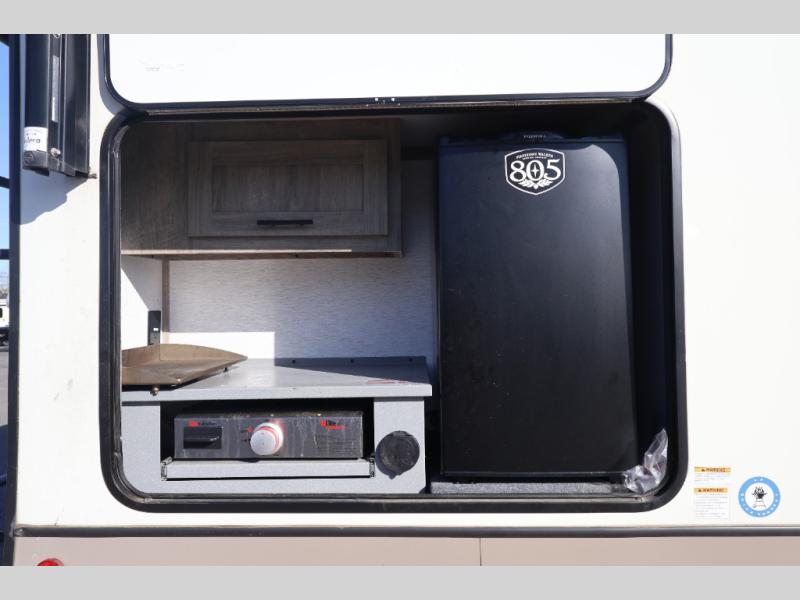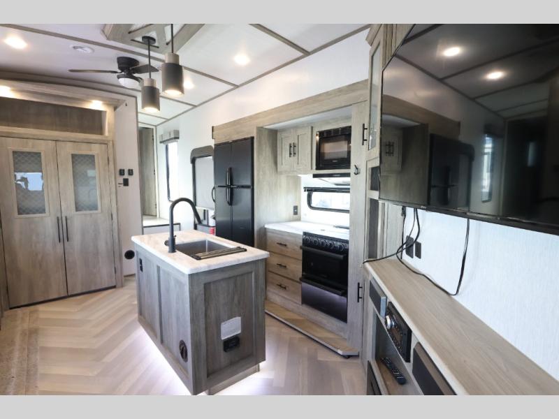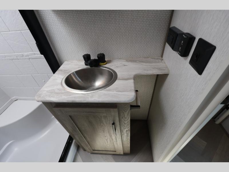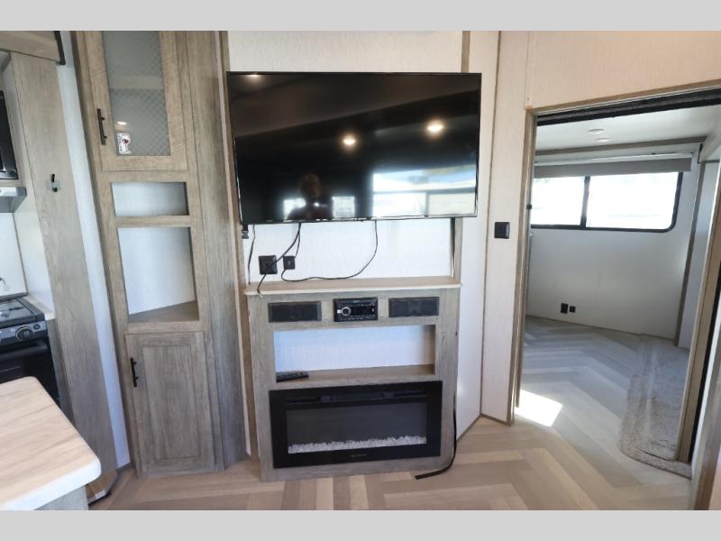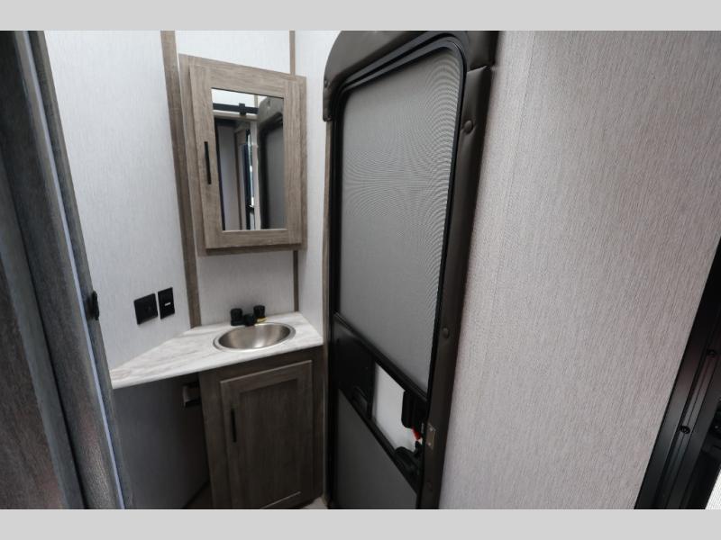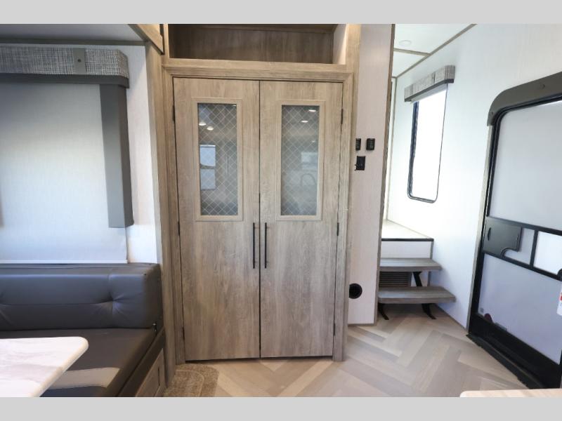 With any Wildwood Heritage Glen travel trailer and fifth wheel by Forest River, the quality construction and attention to detail and design along with a bright and welcoming interior allows you to relax in comfort with conveniences while exploring outdoors. The herringbone Designer's Choice Congoleum flooring is unique, beautiful and durable, and the Hudson wood agreeable grain cabinetry with matte black cabinet hardware and hidden hinges on the cabinet doors is stylish and beautiful. More features that provide convenience include the power stabilizer jacks, the Texas-Size pass-through storage, and the central switch center plus the back-up camera and roof mounted solar panel prep give you choices. There are many more features included whether you choose a travel trailer or fifth wheel!