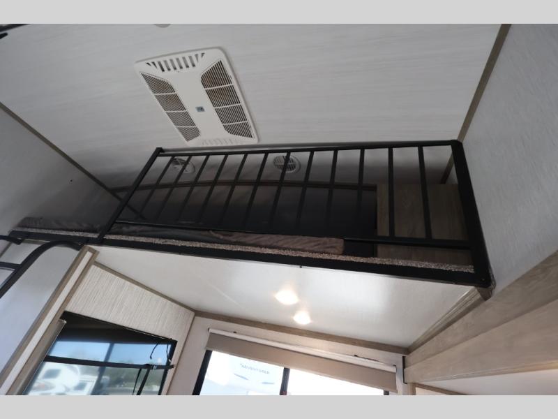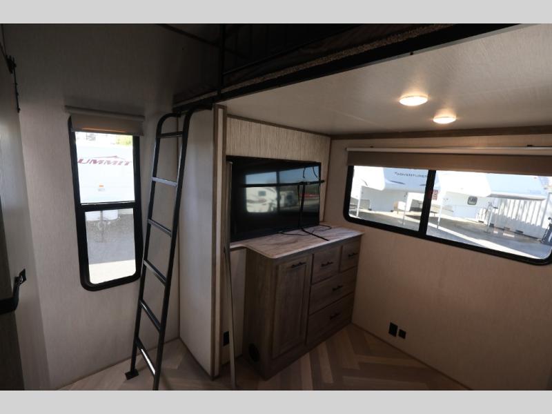 Camping has never been easier than with this Wildwood Heritage Glen fifth wheel! There is a bunkhouse suite that can be used for entertaining guests or housing the kids, and you can have your very own space up front in the private bedroom with your own custom king bed and plenty of storage. Store all of your goodies in the deluxe French door pantry, and use the French door refrigerator for keeping your perishables chilled. As you relax on the tri-fold sofa, you'll enjoy the entertainment that comes from the 50" LED TV and fireplace, and the two exterior awnings are going to give you an outdoor party area for summer nights. There is so more to love about this spacious and loaded fifth wheel, you might never return home!