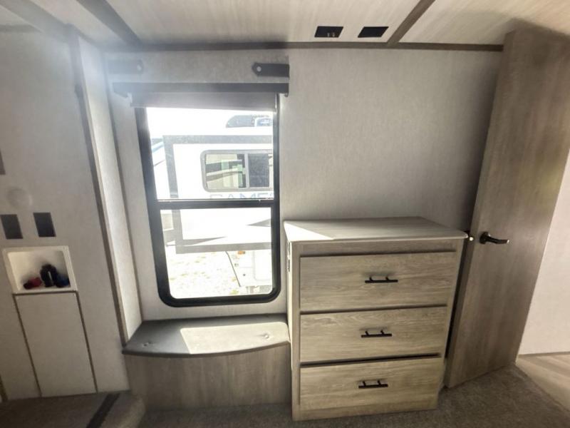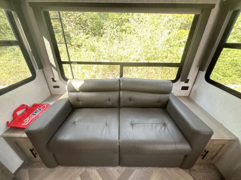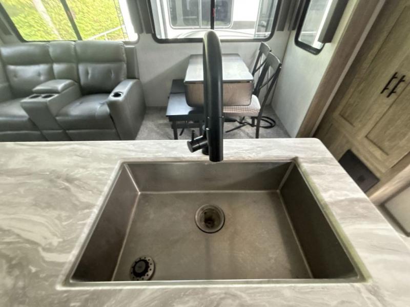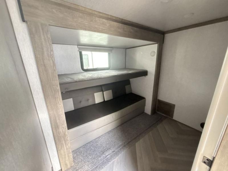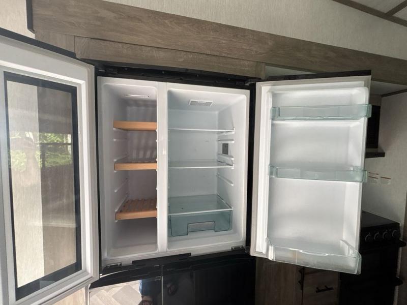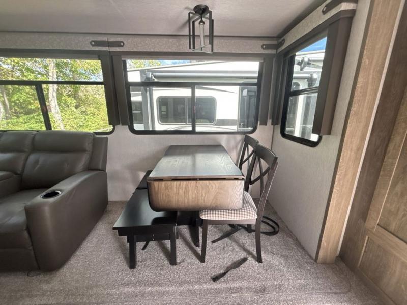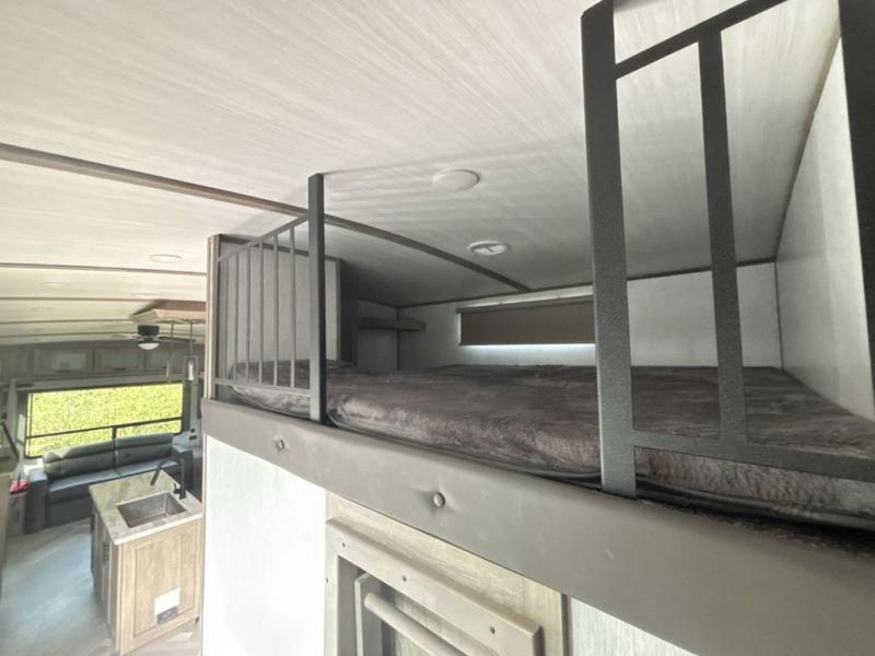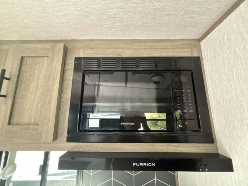 Your kiddos or friends will be able to choose to sleep in the loft or the middle bunkhouse which includes a bunk bed over a convertible sofa bed, a wardrobe, and a dresser. In this Wildwood Heritage Glen fifth wheel, the master bedroom comes complete with an 66" x 80" king bed slide, a full-width wardrobe with shelves, a prepped space for an optional washer/dryer, and a dresser. The bench near the dresser will come in handy to place your daily clothes on, or while you sit to put on your socks and shoes in the morning. The chef will love all the appliances in a spacious kitchen which includes a large kitchen island with sink, and a 14 cubic foot refrigerator. There is plenty of seating between the tri-fold sofa and theatre seating for relaxing or watching a movie. There is also a booth dinette to enjoy your meals at, and two panoramic windows so you beautiful view comes inside when you do. Don't forget about the outside kitchen/bar and awning which offers an outdoor living area and cooking space that you are sure to enjoy as well.