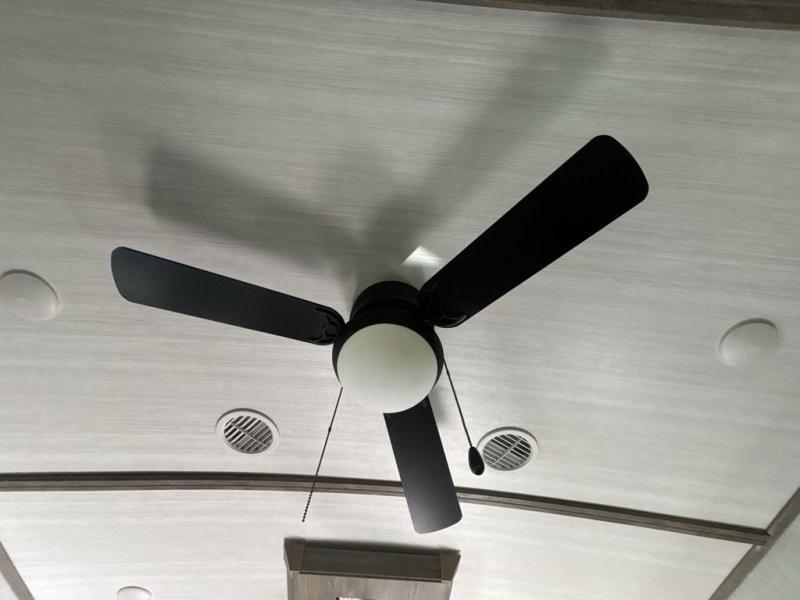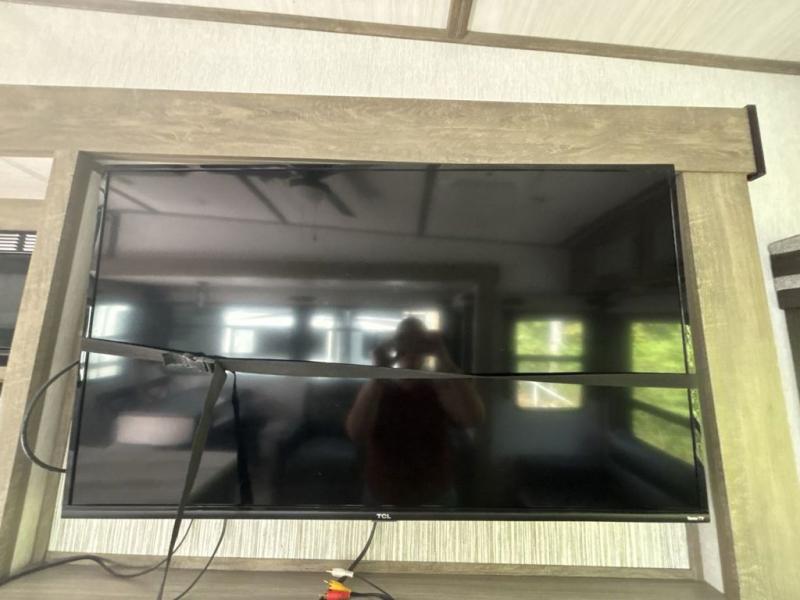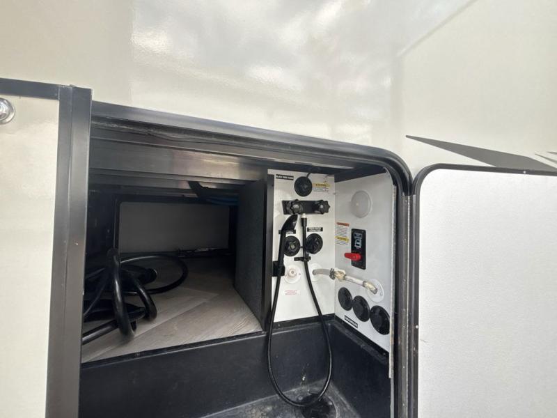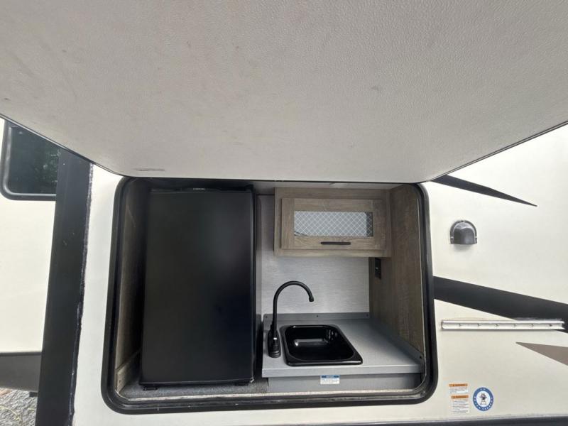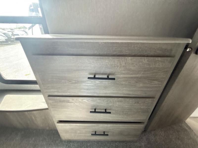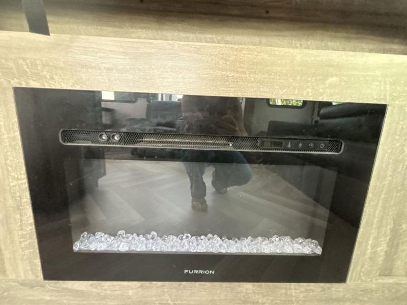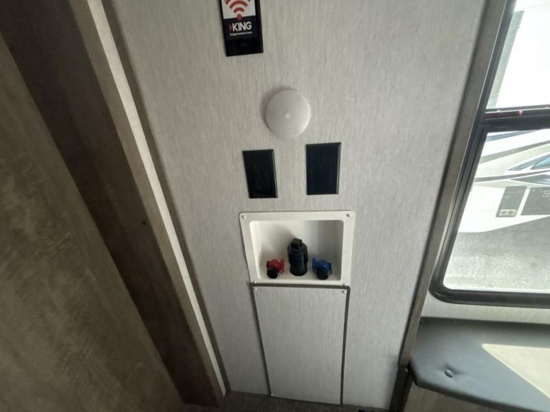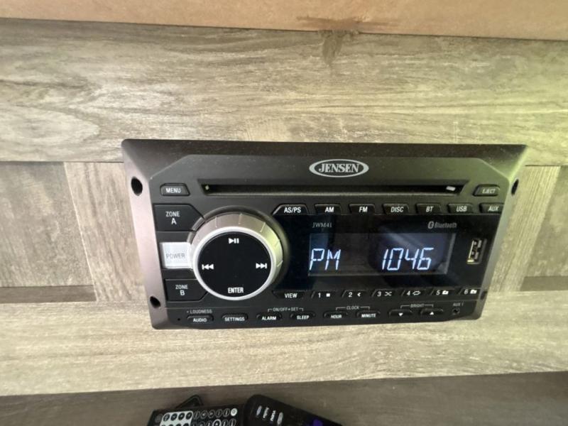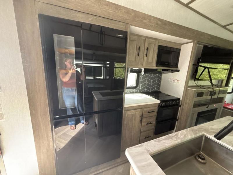 Your kiddos or friends will be able to choose to sleep in the loft or the middle bunkhouse which includes a bunk bed over a convertible sofa bed, a wardrobe, and a dresser. In this Wildwood Heritage Glen fifth wheel, the master bedroom comes complete with an 66" x 80" king bed slide, a full-width wardrobe with shelves, a prepped space for an optional washer/dryer, and a dresser. The bench near the dresser will come in handy to place your daily clothes on, or while you sit to put on your socks and shoes in the morning. The chef will love all the appliances in a spacious kitchen which includes a large kitchen island with sink, and a 14 cubic foot refrigerator. There is plenty of seating between the tri-fold sofa and theatre seating for relaxing or watching a movie. There is also a booth dinette to enjoy your meals at, and two panoramic windows so you beautiful view comes inside when you do. Don't forget about the outside kitchen/bar and awning which offers an outdoor living area and cooking space that you are sure to enjoy as well.