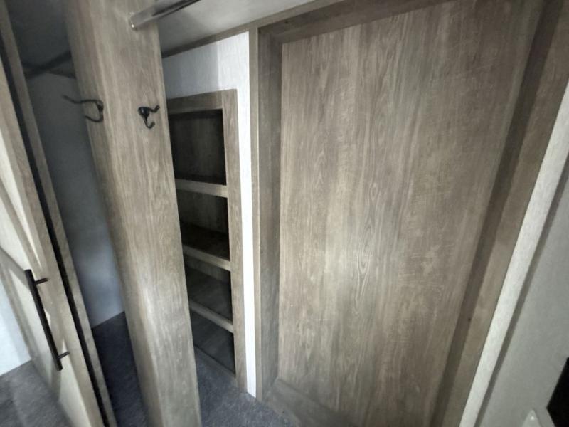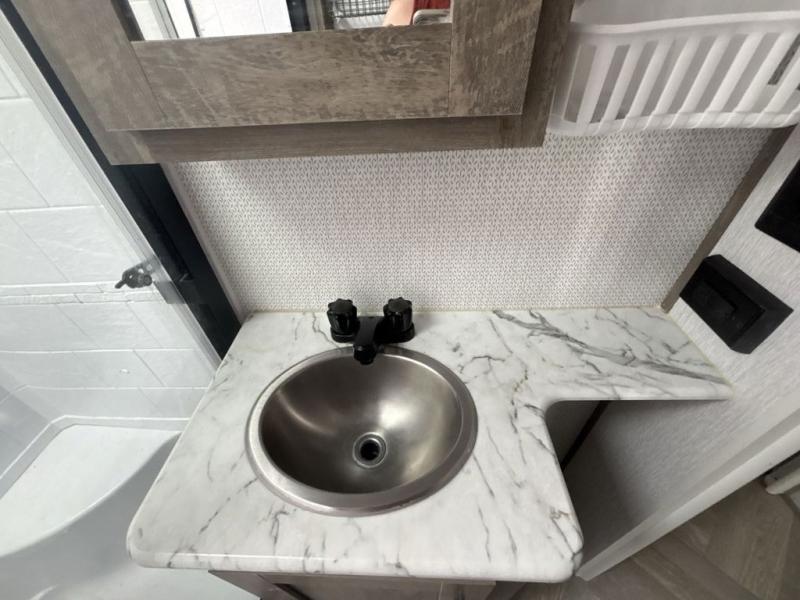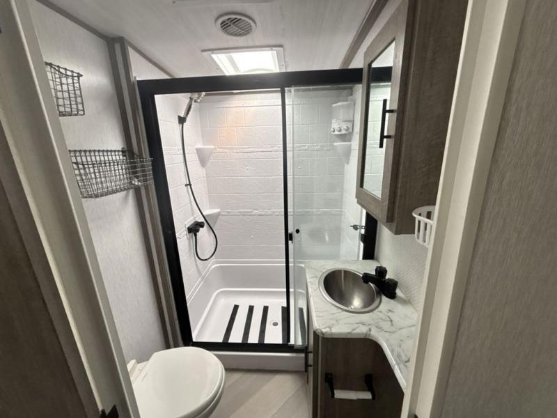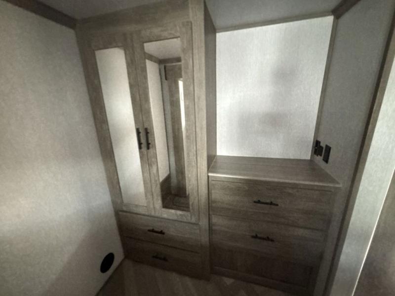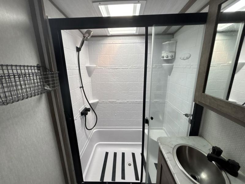 With any Wildwood Heritage Glen travel trailer and fifth wheel by Forest River, the quality construction and attention to detail and design along with a bright and welcoming interior allows you to relax in comfort with conveniences while exploring outdoors. The herringbone Designer's Choice Congoleum flooring is unique, beautiful and durable, and the Hudson wood agreeable grain cabinetry with matte black cabinet hardware and hidden hinges on the cabinet doors is stylish and beautiful. More features that provide convenience include the power stabilizer jacks, the Texas-Size pass-through storage, and the central switch center plus the back-up camera and roof mounted solar panel prep give you choices. There are many more features included whether you choose a travel trailer or fifth wheel!