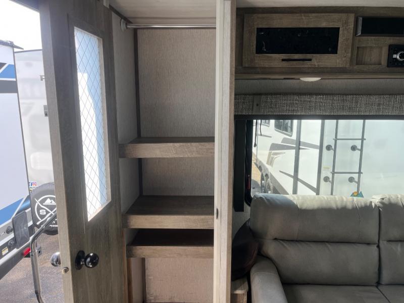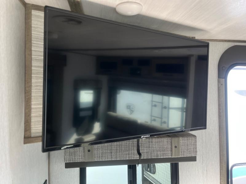 Everyone enjoys some privacy now and then, and the front bedroom can give you just that! You can choose your own side of the walk-around queen bed with dual mirrored wardrobes and have easy access to the walk-through bath with a large walk-in shower with a skylight and a linen closet for toiletries and such. After making a meal in the L-shaped kitchen which also includes a large pantry and residential refrigerator, you can head to the family-sized U-shaped dinette to dine inside while looking out the panoramic widows. You might like to watch a show on the 32" LED TV with the fireplace on and even recline in the sofa before heading outside for a hike or walk around the campgrounds.