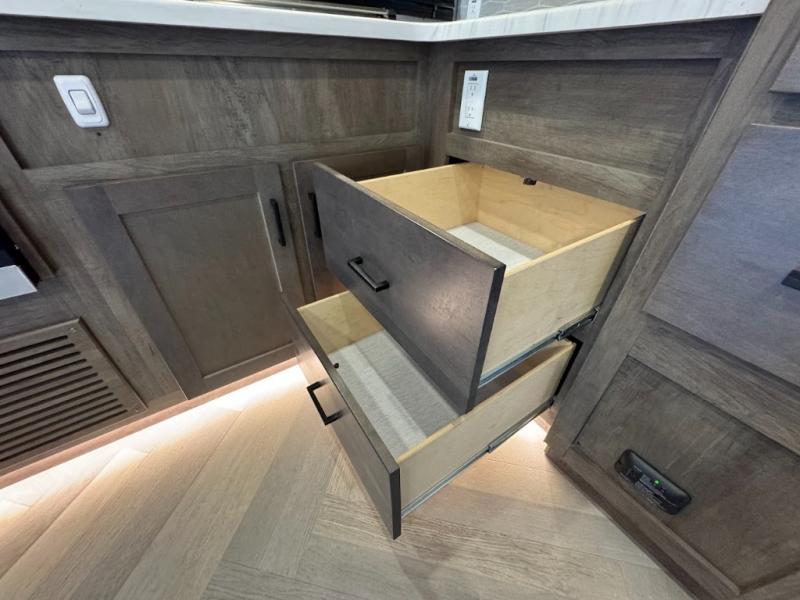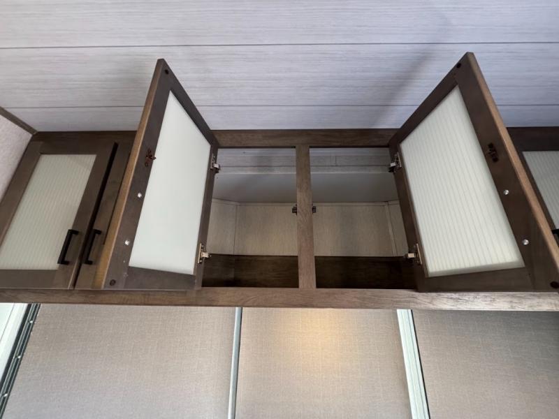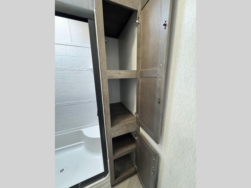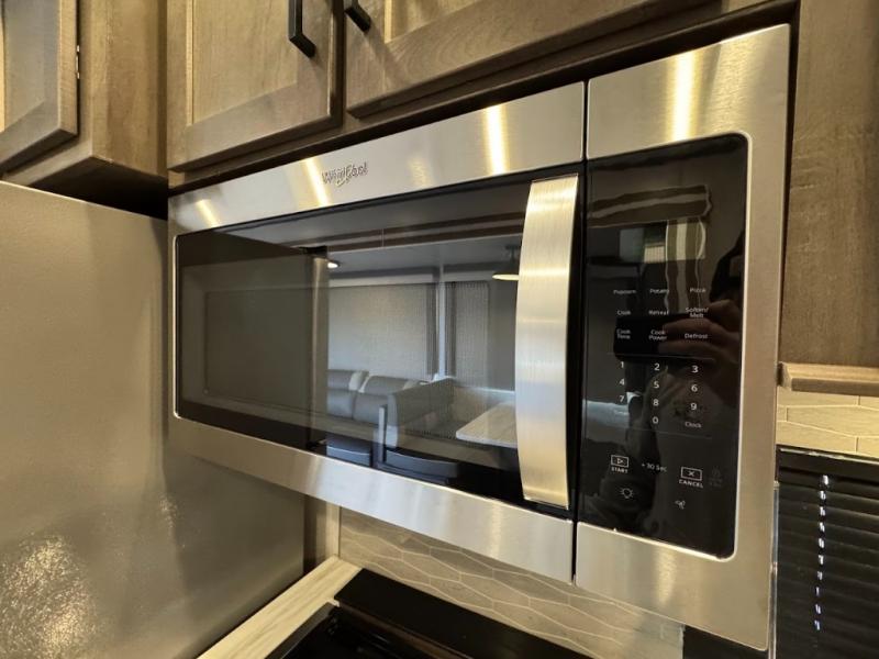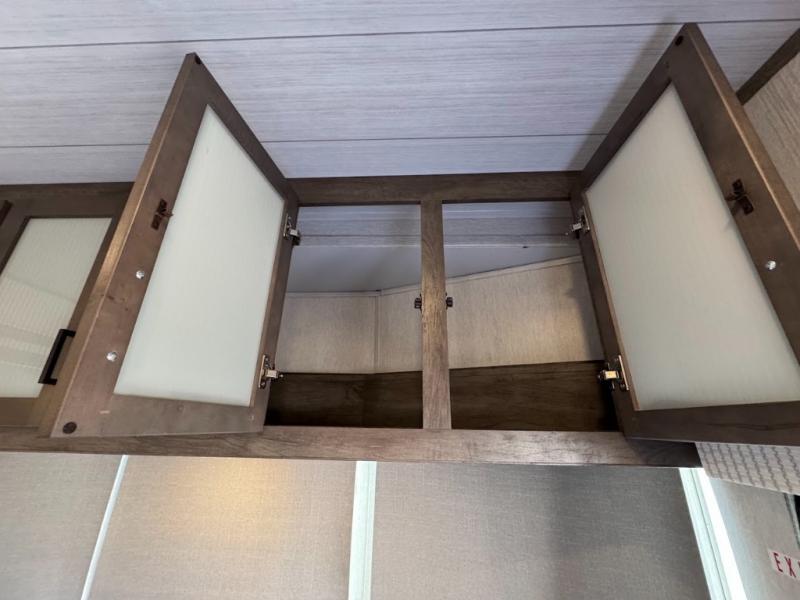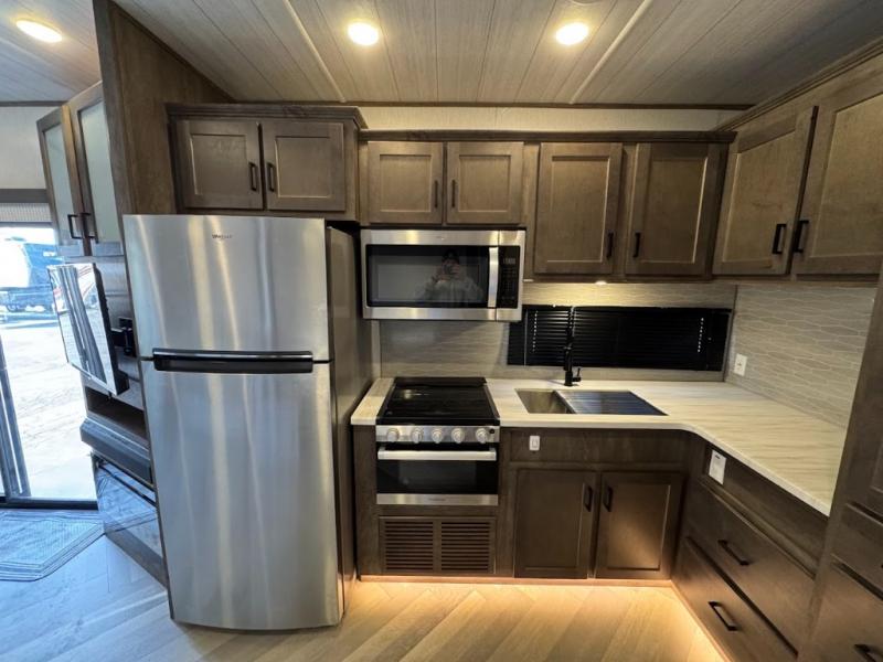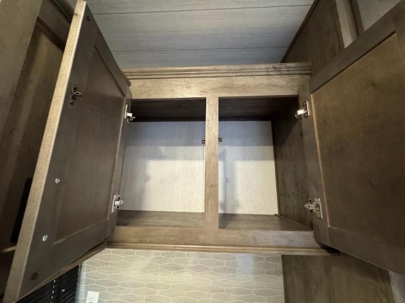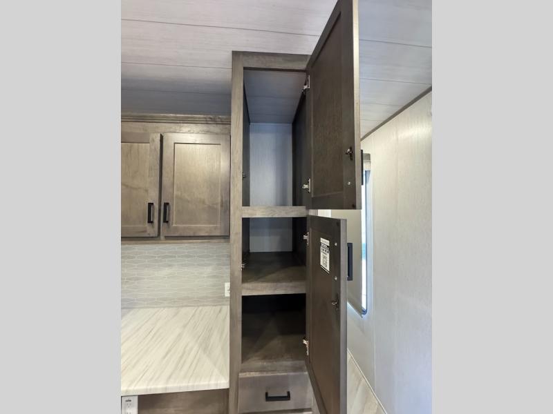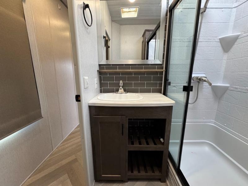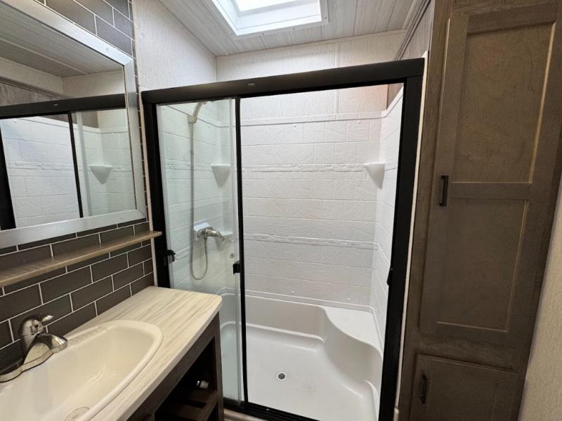 With plenty of space to stretch out and make memories, this Wildwood Lodge destination trailer is just what you need! The full bathroom is loaded with helpful amenities, like a 50" walk-in shower, skylight, residential-inspired vanity, and linen closet, and the bedroom is also filled with convenience as it contains a king bed slide, USB ports, a large closet, and the second exterior entry door. Out in the kitchen you will find everything that you need to create family-style dinners, and the large slide is going to allow you to have plenty of space to work freely in the kitchen.