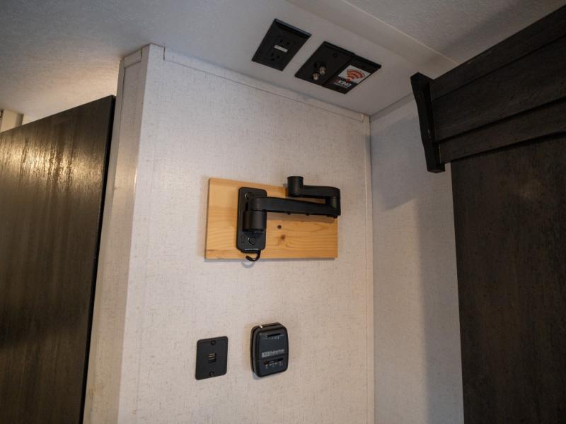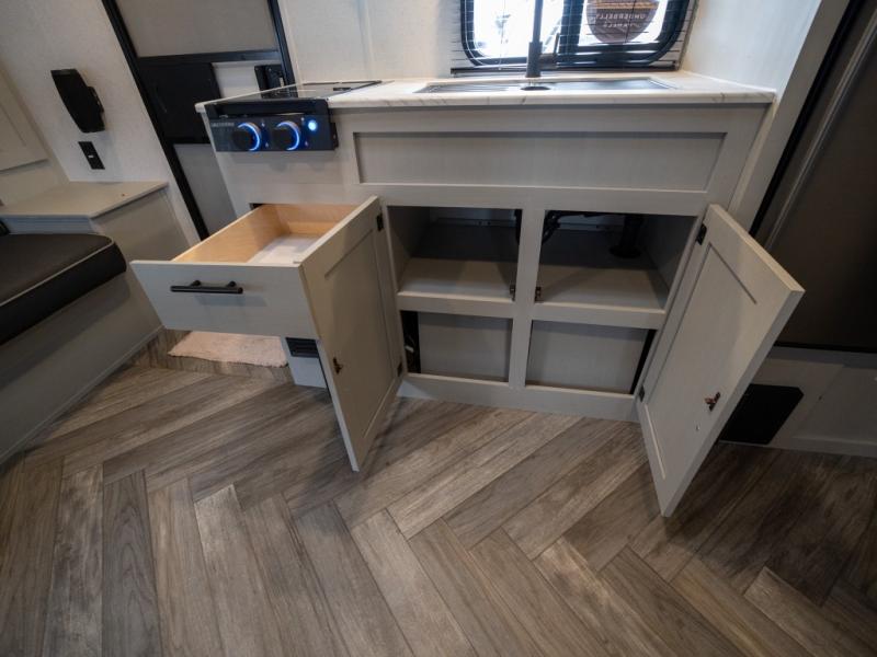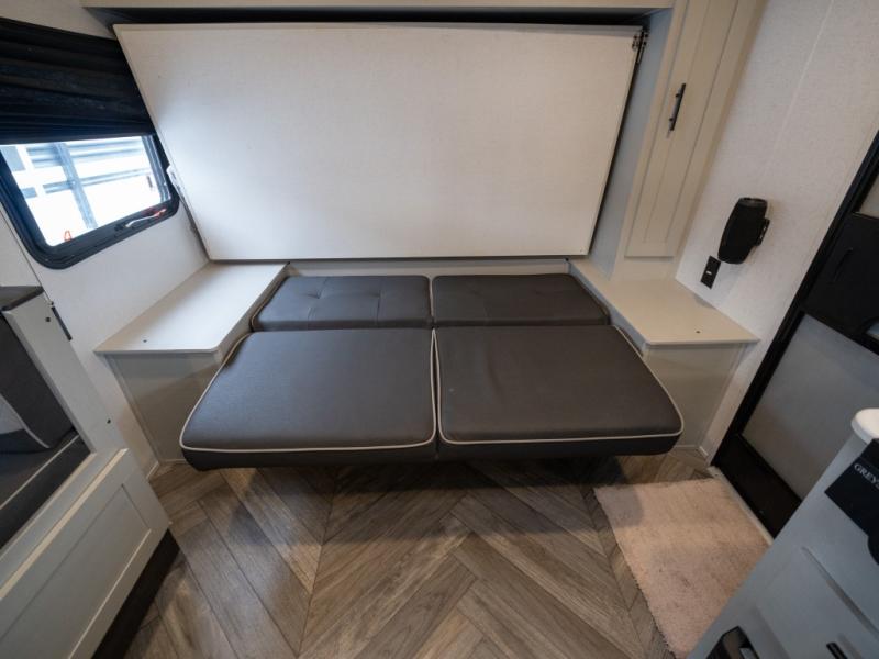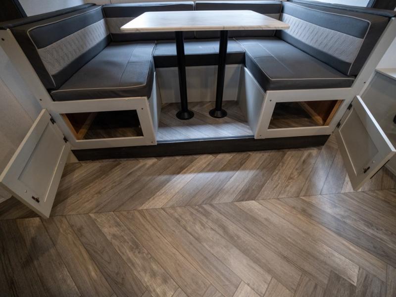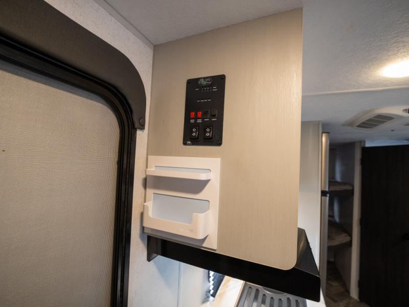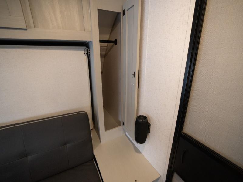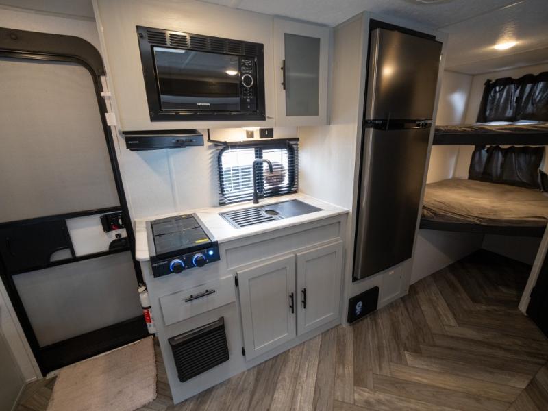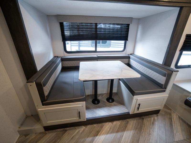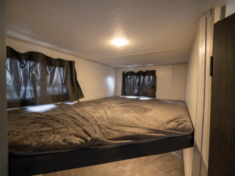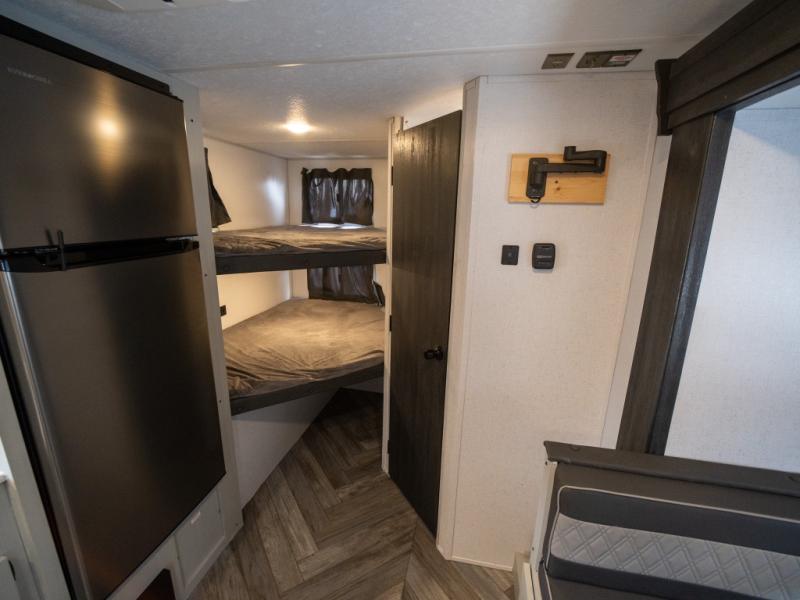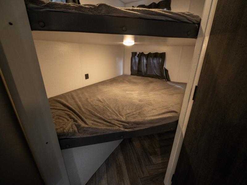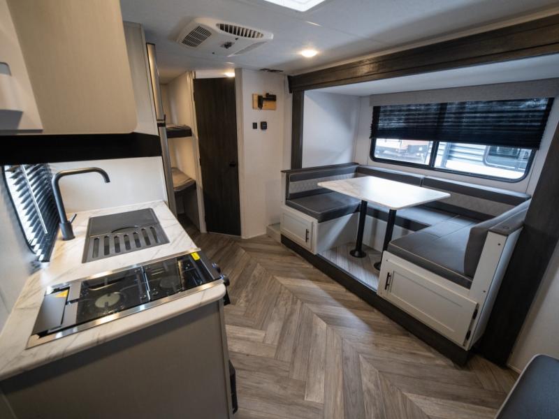 Take all of your family vacations in this travel trailer! The front Murphy bed offers versatility with a 56" sofa to sit on during the day and a 60" x 74" queen bed to lay on at night, plus there are end tables and wardrobes on either side for your items. The kiddos can sleep on the set of 46" x 74" bunk beds and will appreciate how close the rear corner bathroom is to them at night. You can prepare your best home cooked meals either indoors with the two burner cooktop or breathe in some fresh air while you cook at the outside camp kitchen and stay protected by the 15' awning. The U-shaped dinette slide is not only great for eating meals and playing games, but also for transforming into an extra sleeping space too!