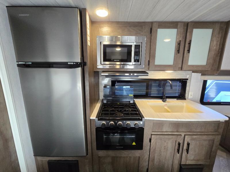 This Wildwood X-Lite travel trailer is a lightweight unit that offers you a spacious rear bathroom with a residential vanity so that you can stay comfortable while you get clean! You will appreciate the fact that you can fold away the bed in this trailer to reveal a Jiffy sofa for afternoon relaxation, and the booth dinette is another piece of furniture that you can use for settling in with a good book and a hot cup of coffee. The seamless countertops in the kitchen are both stylish and functional, and the microwave and three-burner cooktop will help you prepare a meal any time of the day.