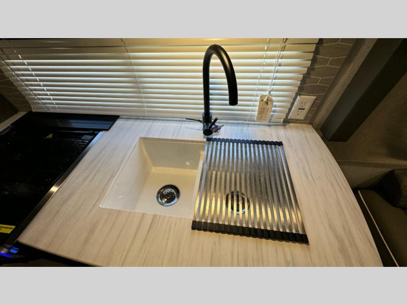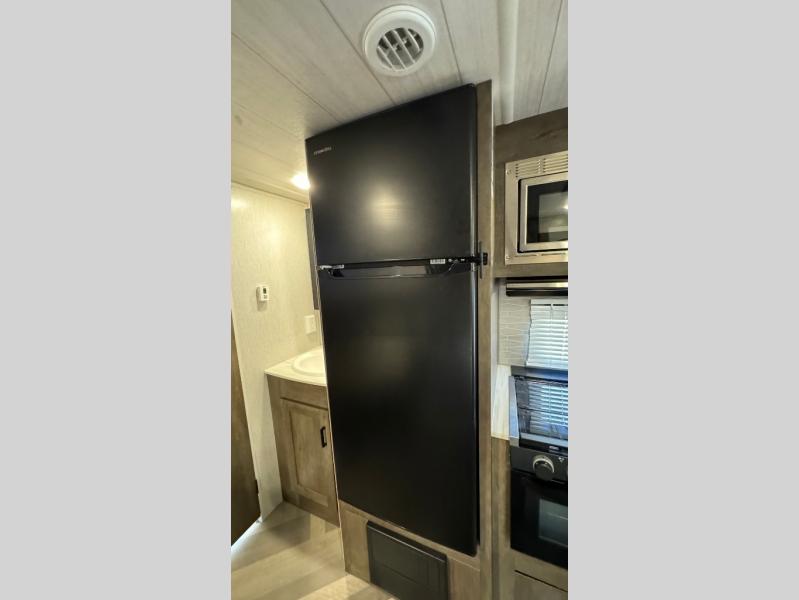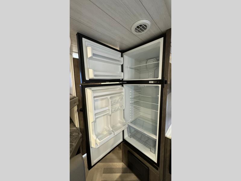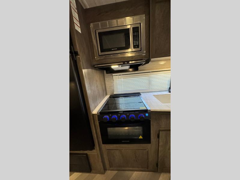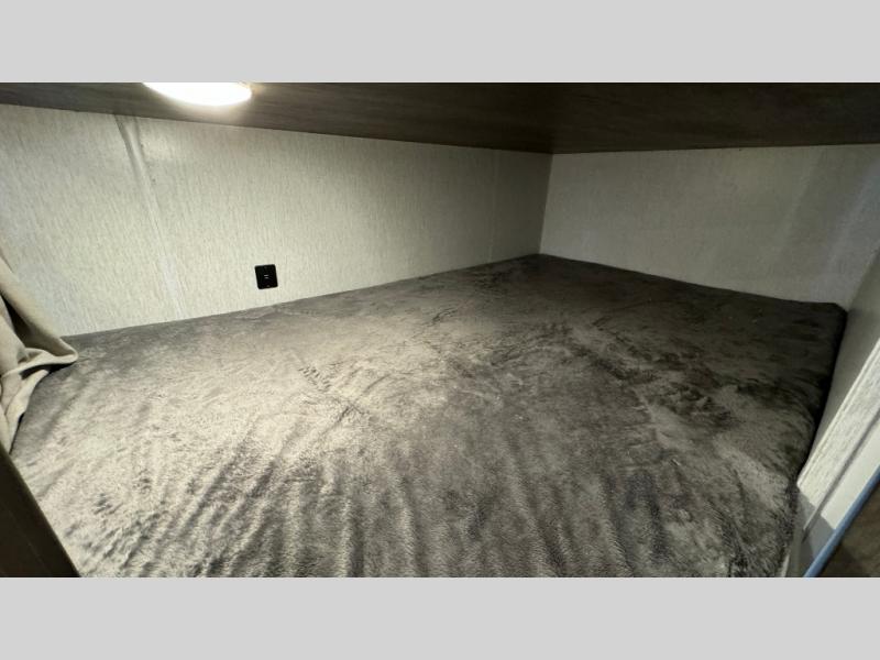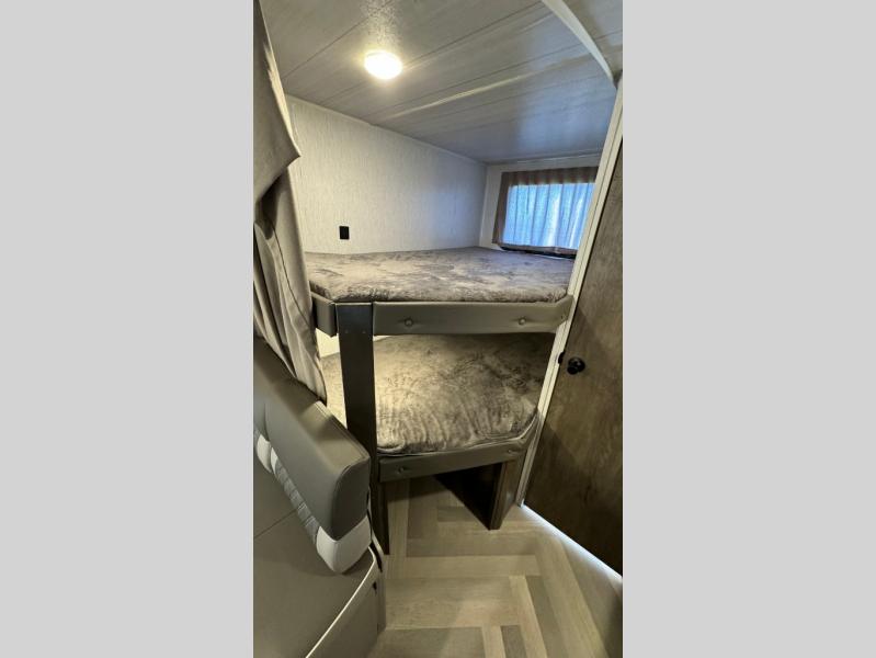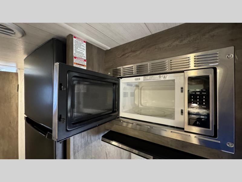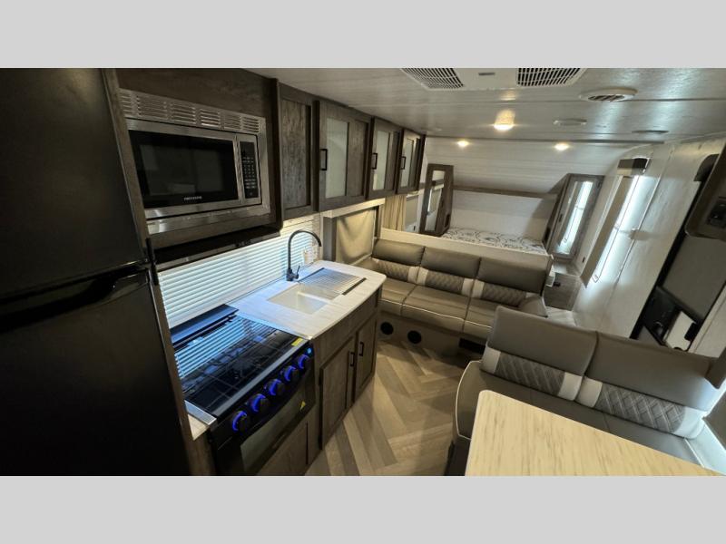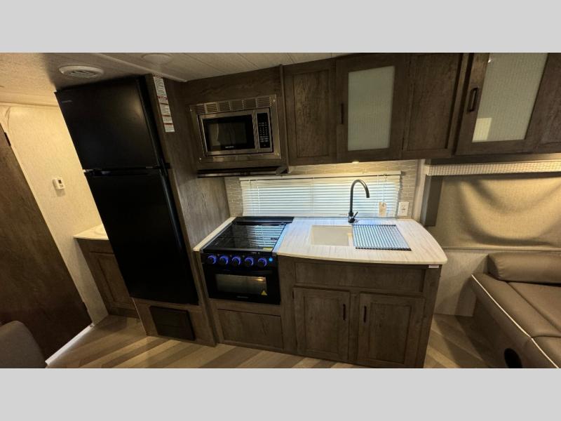 This Wildwood X-Lite travel trailer is packed with features! There is a walk-around bed up at the front that can be sectioned off from the rest of the trailer with a privacy curtain, and the double-size bunks in the back of this trailer will provide you with a compact sleeping space for your little ones. The booth dinette is going to be a great place to sit down together and have a meal when the bugs are too bad outside to sit at the picnic table, and there is also a sofa for relaxation while inside. You will also appreciate the look and function of the seamless countertops in the kitchen, and the 11-cubic foot refrigerator will easily keep your perishable items fresh. There is also an outside camp kitchen for more choices when cooking for the family.