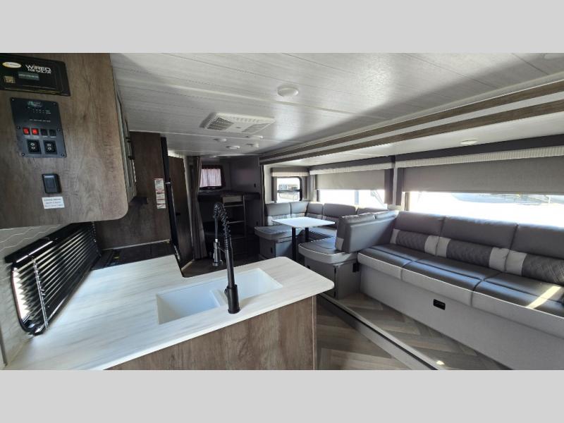 The Forest River Wildwood X-Lite travel trailers are comfortable enough to make any destination feel like home! The Wildwood X-Lite has a one-piece SuperFlex roof, a powder-coated I-beam frame, nitrogen-filled tires, a triple-seal slide system, and a cambered chassis as the base for all of its luxurious additions. Within the reliable construction, you will find excellent interior amenities, like a herringbone luxury vinyl flooring, a shiplap wall board, a huge kitchen window, USB ports, a Bluetooth stereo, and upgraded designer furniture. The Wildwood X-Lite also comes with a pass-through storage compartment so that you can make the most of every adventure by bringing along the essentials.