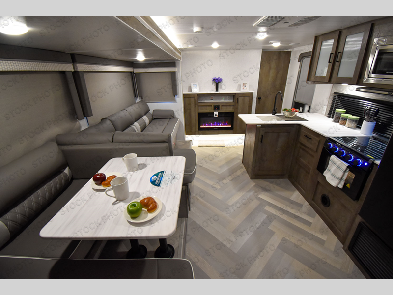 If you need a trailer that will enhance your family getaways, this Wildwood X-Lite travel trailer is it! Because of the double-size bunks in the back and the walk-around bed in the front private bedroom, your family can stretch out and sleep comfortably, and the Versa Lounge, which is made up of a U-shaped dinette and sofa, can also transform into extra sleeping space if needed. The whole family will enjoy how accessible the full bathroom is because it contains both an interior and exterior entry door, and the entertainment center with fireplace is certainly going to enrich your time spent indoors. Enjoy breakfast outdoors with the outside camp kitchen too!