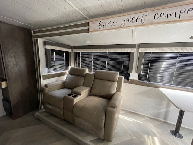 If you like to travel with a large crew, choose this Wildwood X-Lite travel trailer! This trailer has two private sleeping spaces with a private bedroom up front and a private bunkhouse in the back. Not only does the bunkhouse have three bunk beds, but it also has a closet for storage and a jiffy sofa for lounging. In the main living area, there is a large slide that holds the U-shaped dinette and sofa. These pieces of furniture are a part of the Versa Lounge, and you can customize them to function as you need them to. The panoramic windows surround the dinette and sofa so that you can take in the scenic views while you relax. You even have an outdoor camp kitchen to make it more convenient.