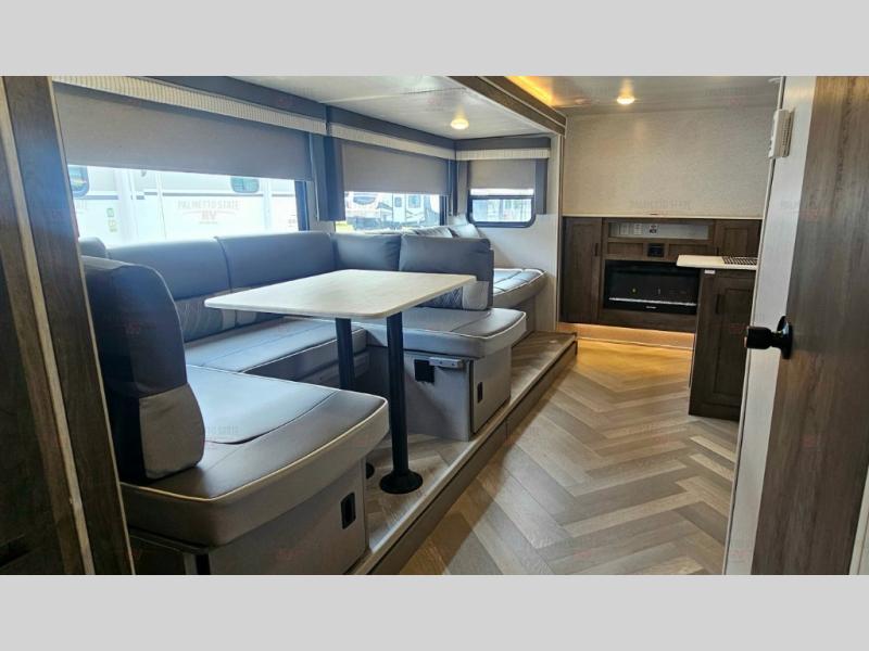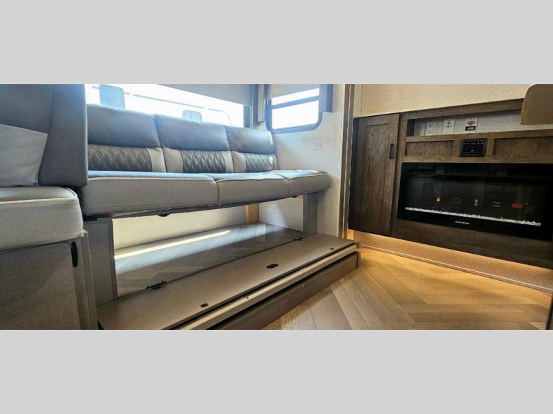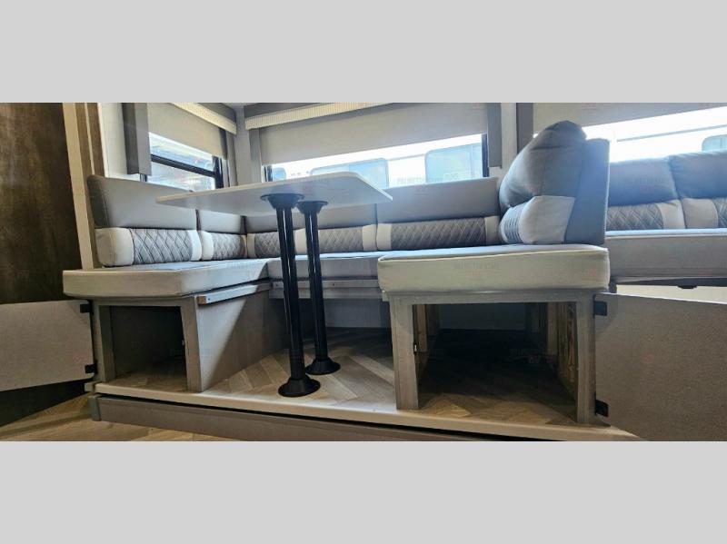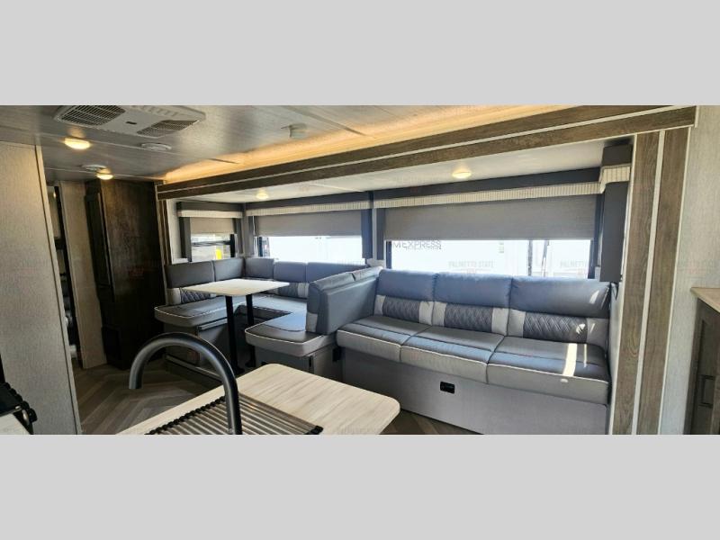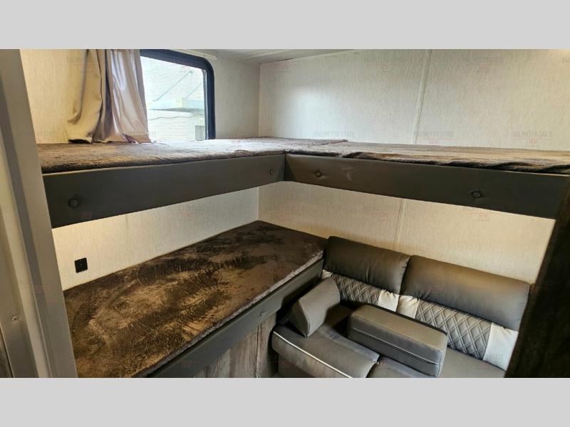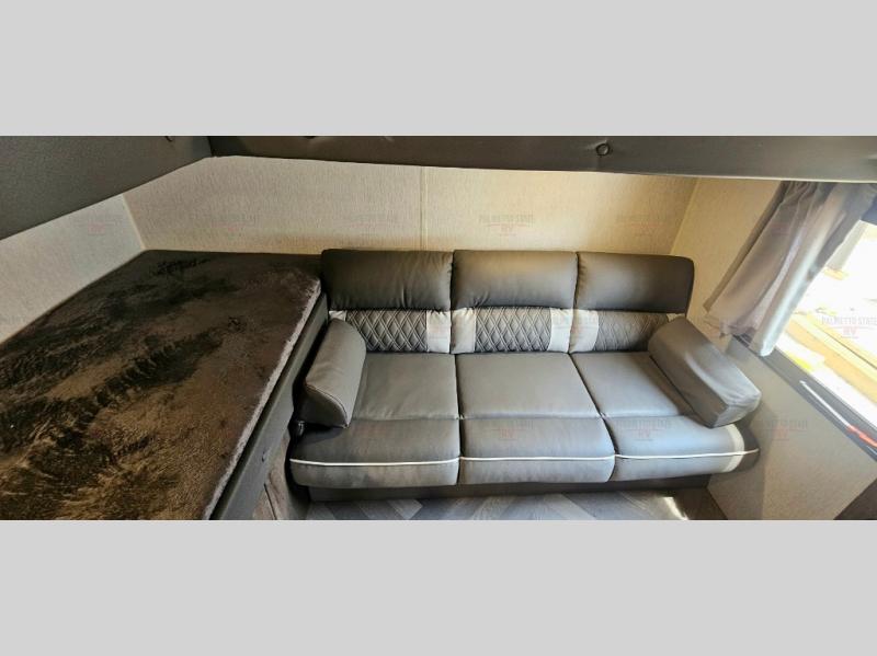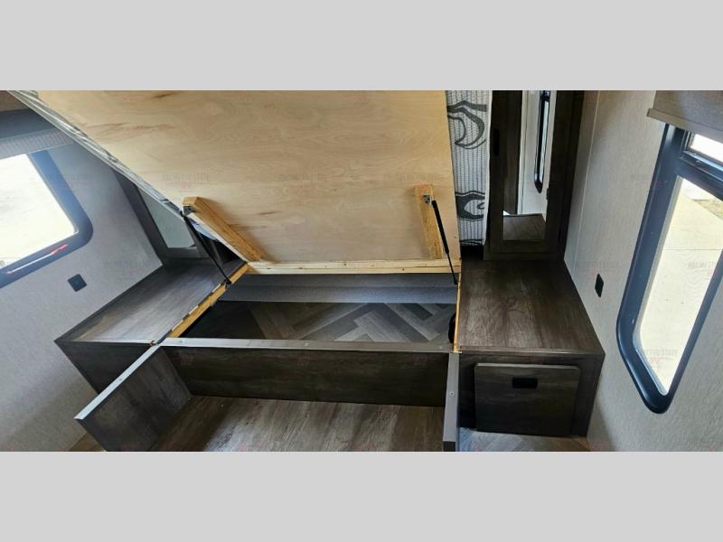 If you like to travel with a large crew, choose this Wildwood X-Lite travel trailer! This trailer has two private sleeping spaces with a private bedroom up front and a private bunkhouse in the back. Not only does the bunkhouse have three bunk beds, but it also has a closet for storage and a jiffy sofa for lounging. In the main living area, there is a large slide that holds the U-shaped dinette and sofa. These pieces of furniture are a part of the Versa Lounge, and you can customize them to function as you need them to. The panoramic windows surround the dinette and sofa so that you can take in the scenic views while you relax. You even have an outdoor camp kitchen to make it more convenient.