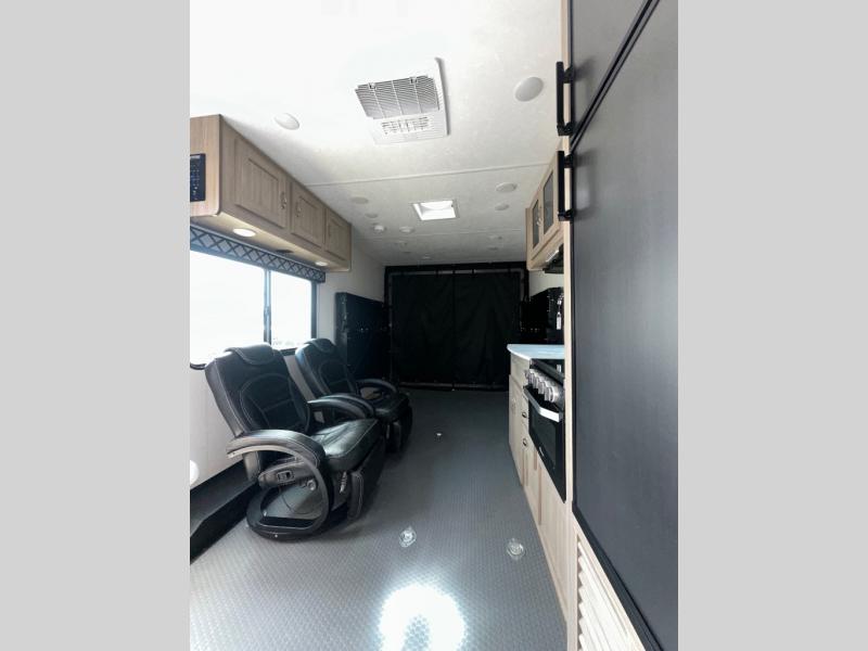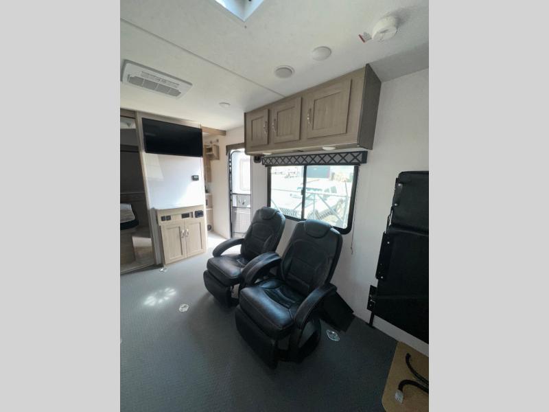 You can have the best of both worlds with this toy hauler; a little work and a little play! Once you unload your bikes from the ramp door, relax on the roll-over sofas while the chef of your group prepares lunch on the three burner cooktop. There are also two Euro recliners and an entertainment center with a 39" LED HDTV that will make it feel more like home. The dual entry bath will create a master suite you are sure to love. Here, you will sleep soundly on the queen bed slide out, and there is a dresser to store your clothes for the week. It's time to load up and head out! This LT model has a few options you can choose from to further customize your camping experience, like the optional electric queen bed, the optional 30 gallon fuel station, and the optional second 15K BTU A/C!
