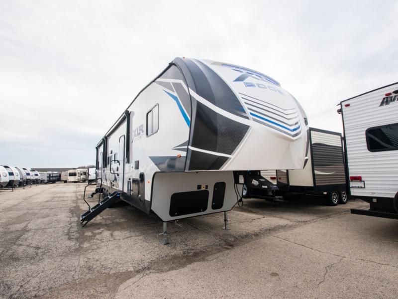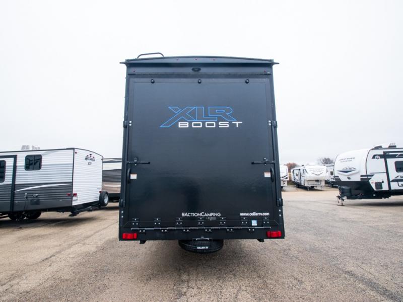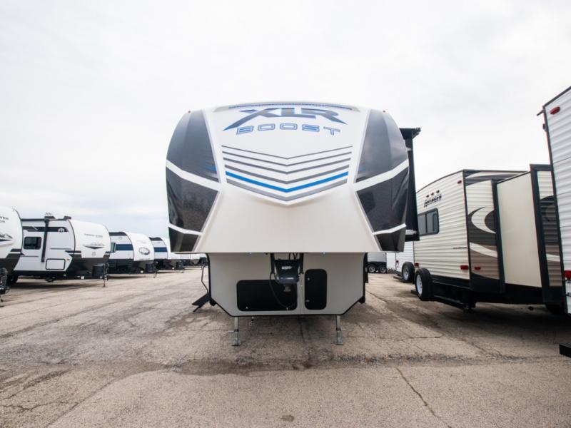 Boost into action camping with one of these Forest River XLR Boost fifth wheel toy haulers or travel trailer toy haulers! The 102" wide body not only provides ample walking around space, but also packs in all of the luxurious features to make your trips great. A seamless PVC roof system prevents water from leaking inside, and the moisture barrier floor enclosure and the oil and gas resistant residential linoleum throughout keeps your unit from falling apart. You can easily load and unload your toys with the laminated aluminum framed weather proof ramp door. Keep the dirt outside where it belongs with the outside hot/cold shower box and enjoy the perfect view of your beautiful surroundings even indoors through the large panoramic windows. Come find the model that best fits your needs today!