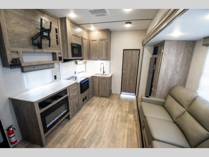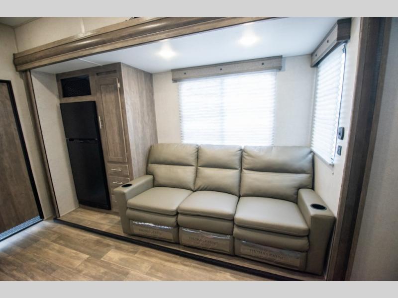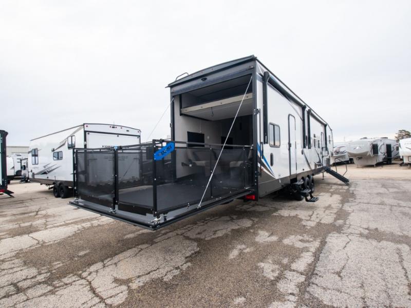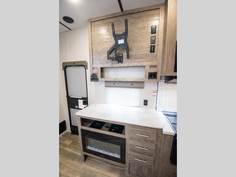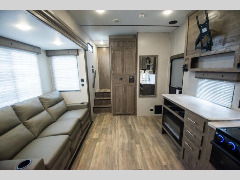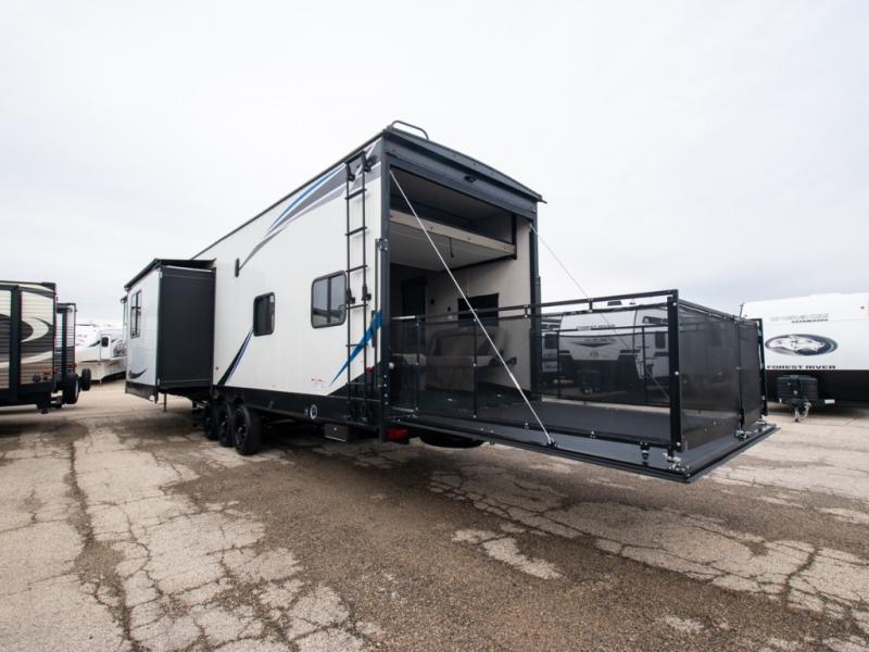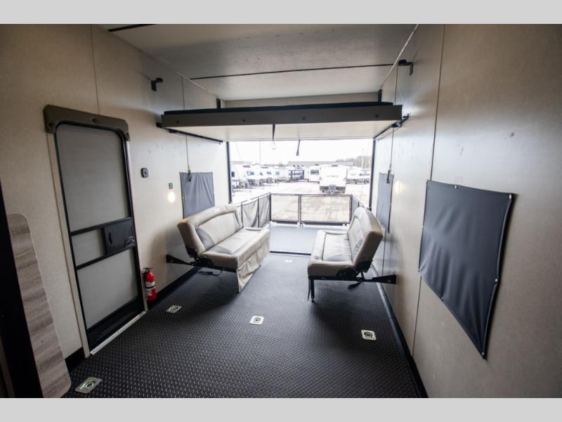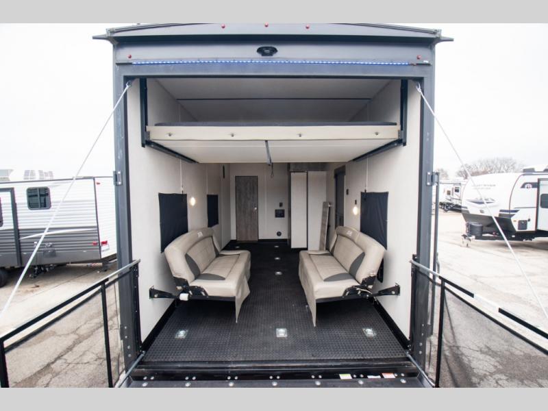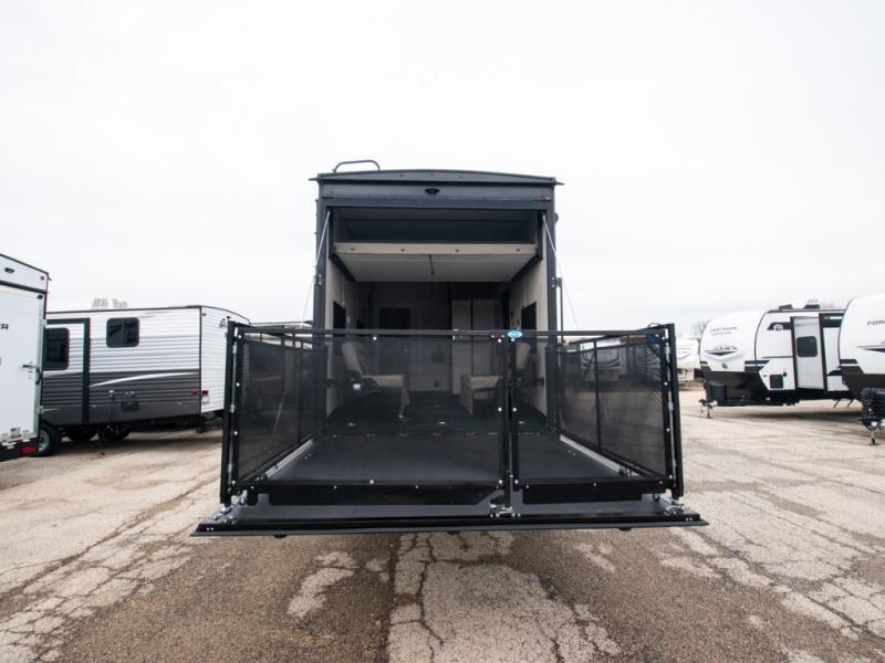 Pack your bags and load up your favorite toys into the 16' garage area of this toy hauler! Once you have arrived, you can set up the Sit N Sleep with quick release sofas that have a table in between and a Sleep N Store manual bed system above them, plus there is a half bathroom, one of the dual entry doors to the unit, and a patio deck. Get a good night's rest each night on the RV king bed in the front private bedroom and rinse the mud out of your hair after each trail ride in the dual entry bathroom with the radius shower that has a skylight above for more headroom and natural lighting. The fully equipped kitchen has everything you need to prepare your best home cooked meals, and you can relax in true comfort on the theater sofa across from the fireplace at the entertainment center with TV prep!