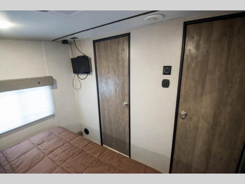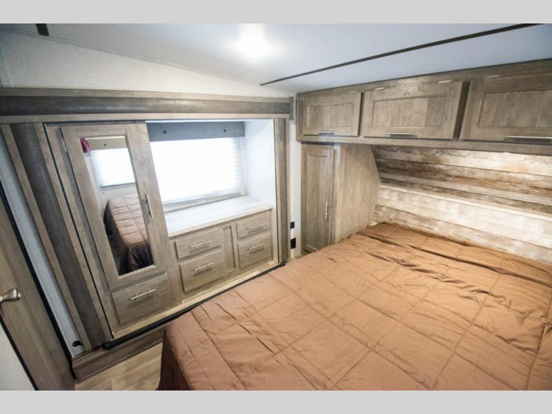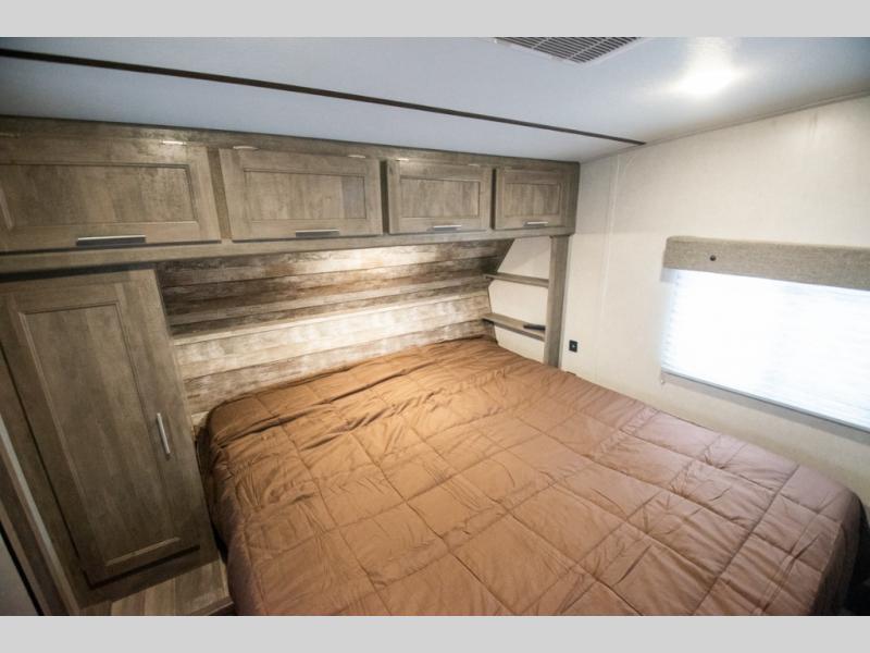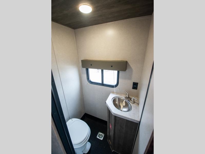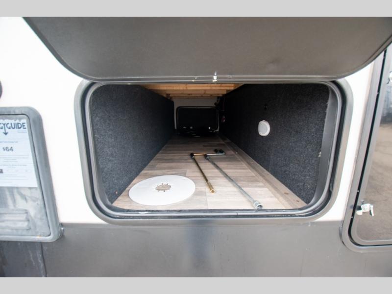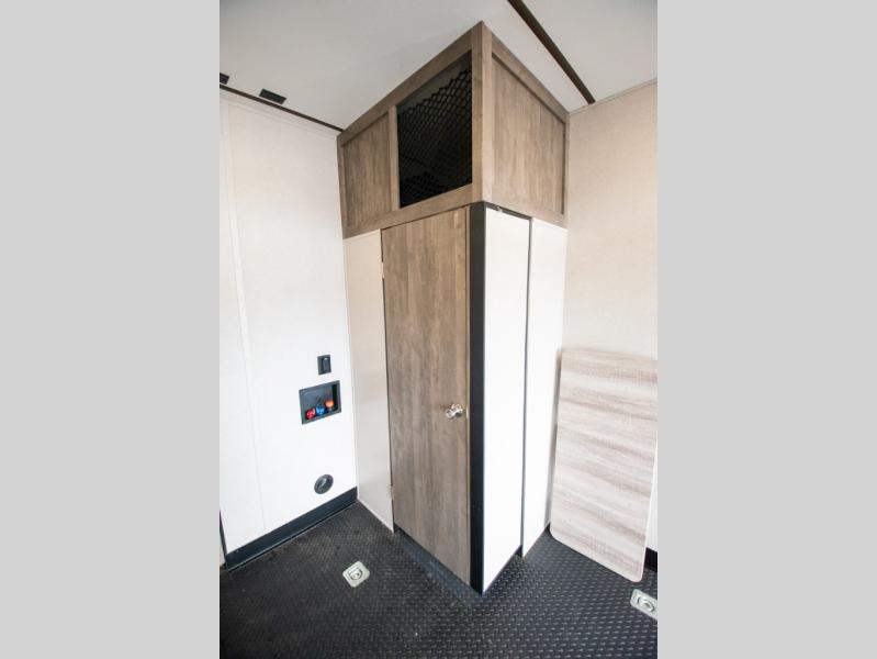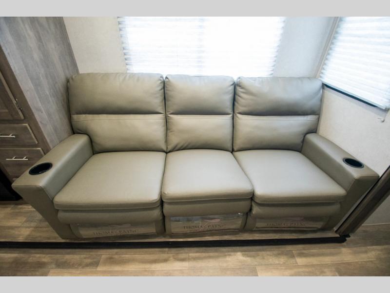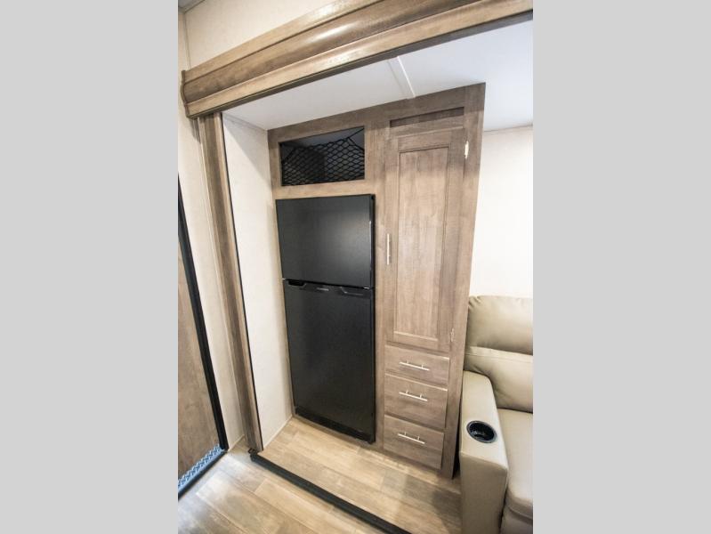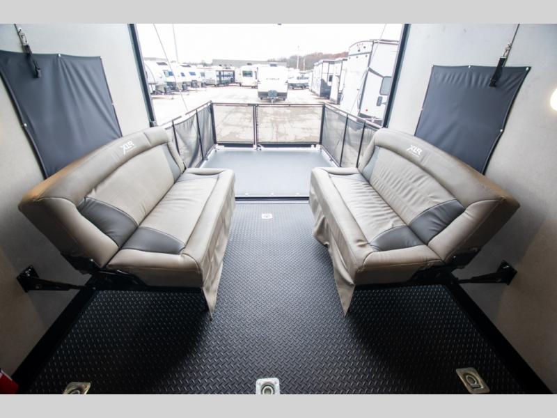 Pack your bags and load up your favorite toys into the 16' garage area of this toy hauler! Once you have arrived, you can set up the Sit N Sleep with quick release sofas that have a table in between and a Sleep N Store manual bed system above them, plus there is a half bathroom, one of the dual entry doors to the unit, and a patio deck. Get a good night's rest each night on the RV king bed in the front private bedroom and rinse the mud out of your hair after each trail ride in the dual entry bathroom with the radius shower that has a skylight above for more headroom and natural lighting. The fully equipped kitchen has everything you need to prepare your best home cooked meals, and you can relax in true comfort on the theater sofa across from the fireplace at the entertainment center with TV prep!