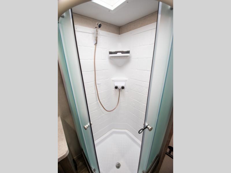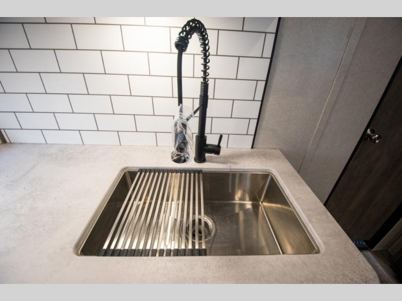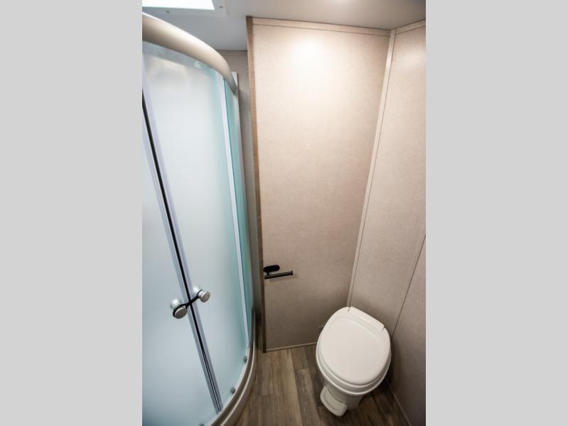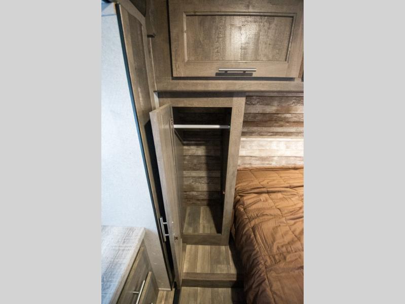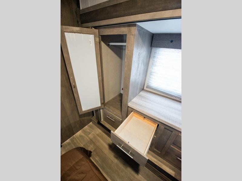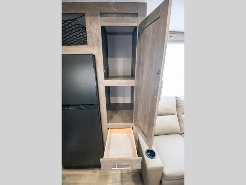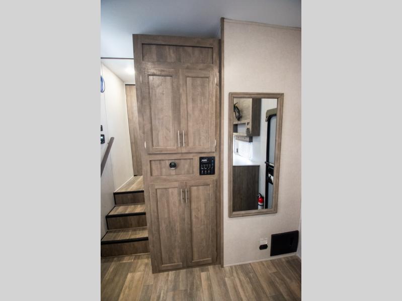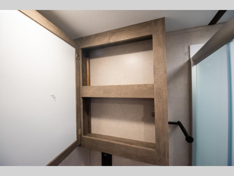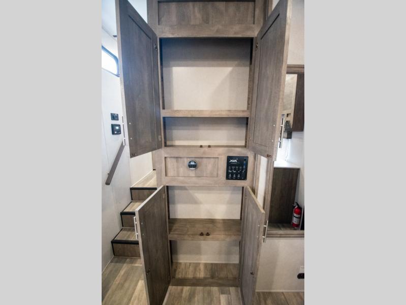 Pack your bags and load up your favorite toys into the 16' garage area of this toy hauler! Once you have arrived, you can set up the Sit N Sleep with quick release sofas that have a table in between and a Sleep N Store manual bed system above them, plus there is a half bathroom, one of the dual entry doors to the unit, and a patio deck. Get a good night's rest each night on the RV king bed in the front private bedroom and rinse the mud out of your hair after each trail ride in the dual entry bathroom with the radius shower that has a skylight above for more headroom and natural lighting. The fully equipped kitchen has everything you need to prepare your best home cooked meals, and you can relax in true comfort on the theater sofa across from the fireplace at the entertainment center with TV prep!