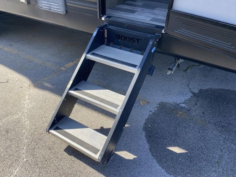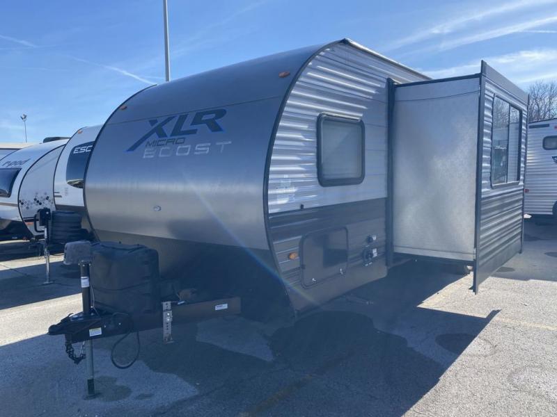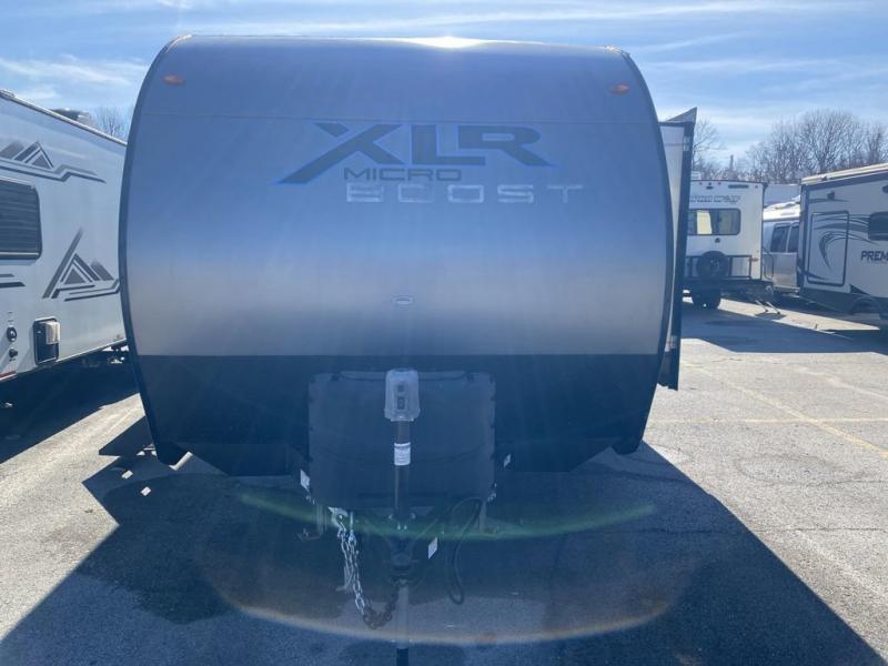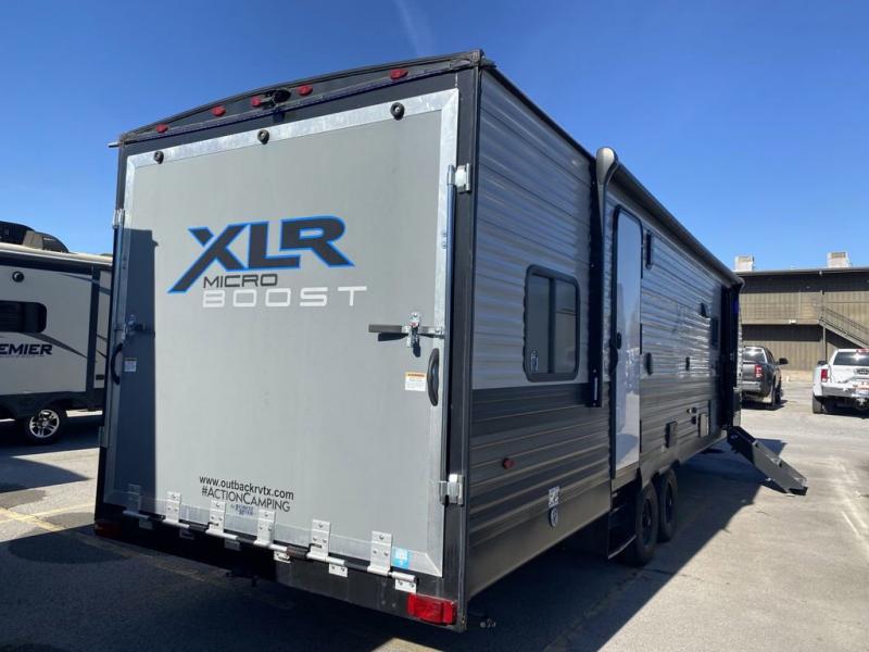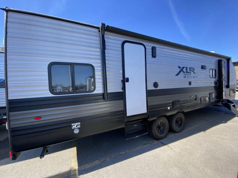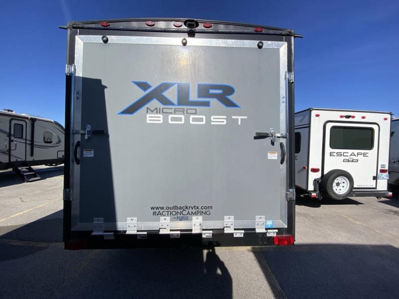 Each XLR Micro Boost toy hauler is made to last through years of use thanks to the seamless PVC roof system, the diamond plate front rock guard, and the Body Armor enclosed and insulated underbelly. You will appreciate the oil and gas resistant residential linoleum and the moisture barrier floor enclosure to keep your space clean, and the lightweight design will be perfect for smaller tow vehicles. Each model includes residential stainless steel sinks, decorative kitchen backsplash, solid core cabinet stiles, and large panoramic windows for breathtaking outdoor views. The exterior includes many convenient features to make camping easier than ever, including a pet leash for your furry friends, insulated storage doors, a hot and cold exterior shower, plus a friction hinge entry door. There is even a power awning with blue LED lights and two exterior speakers for the ultimate outdoor living space.