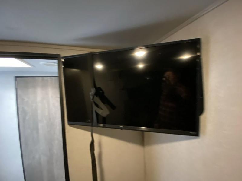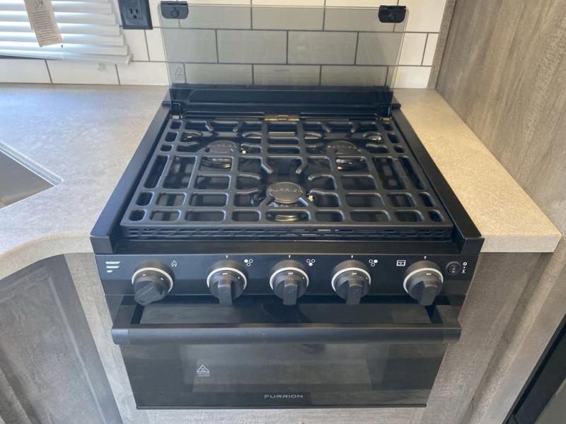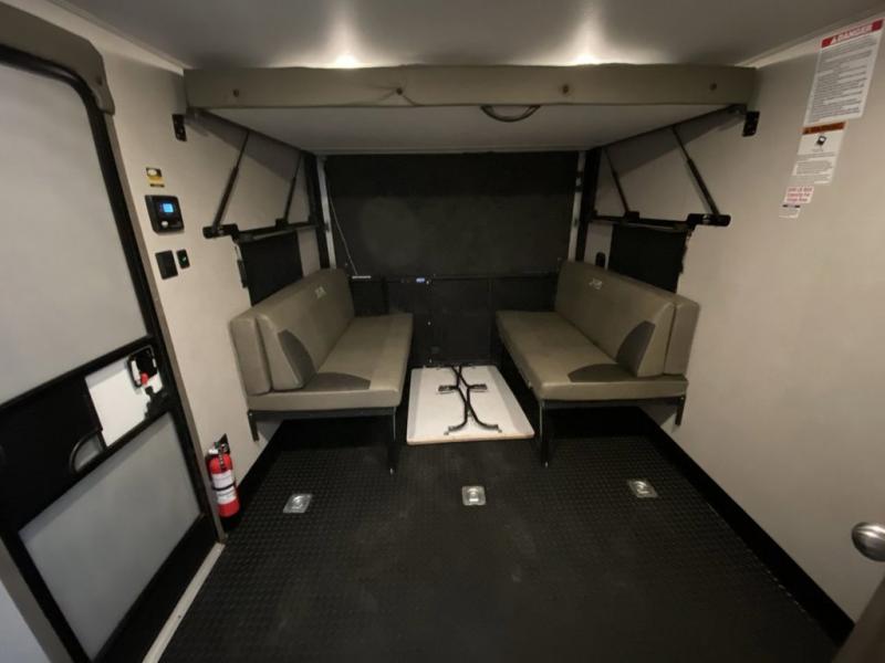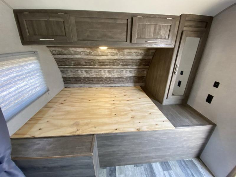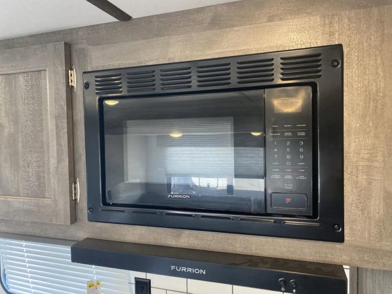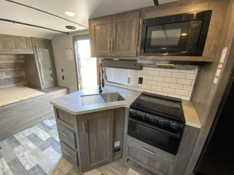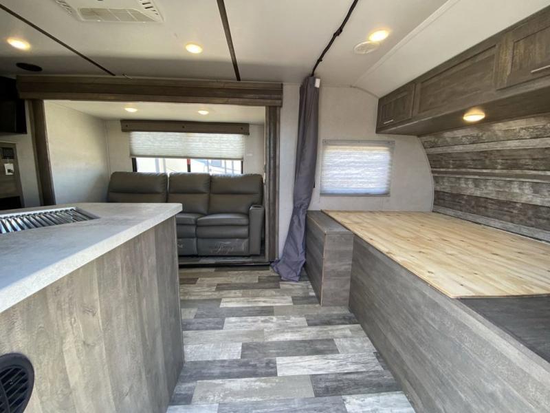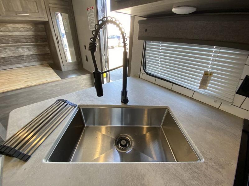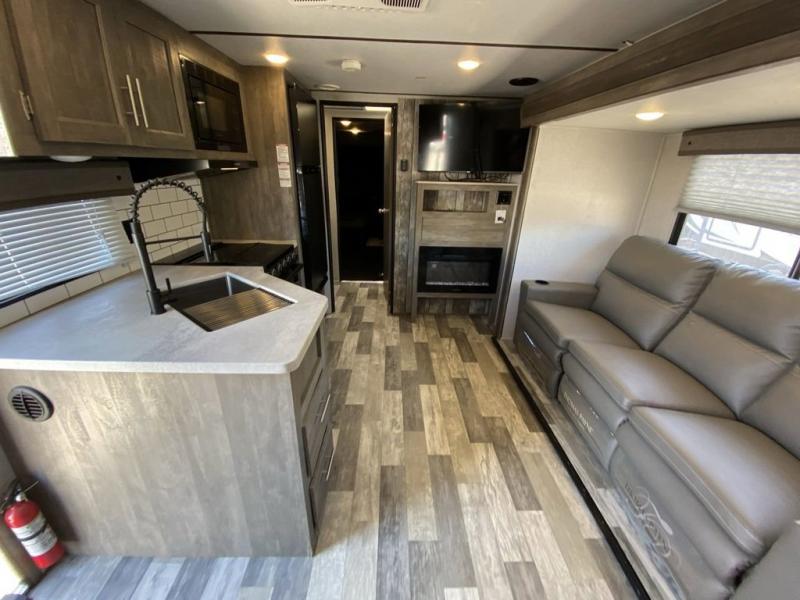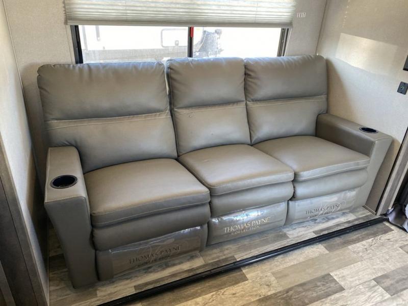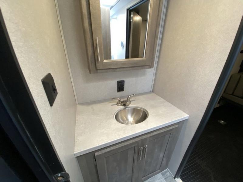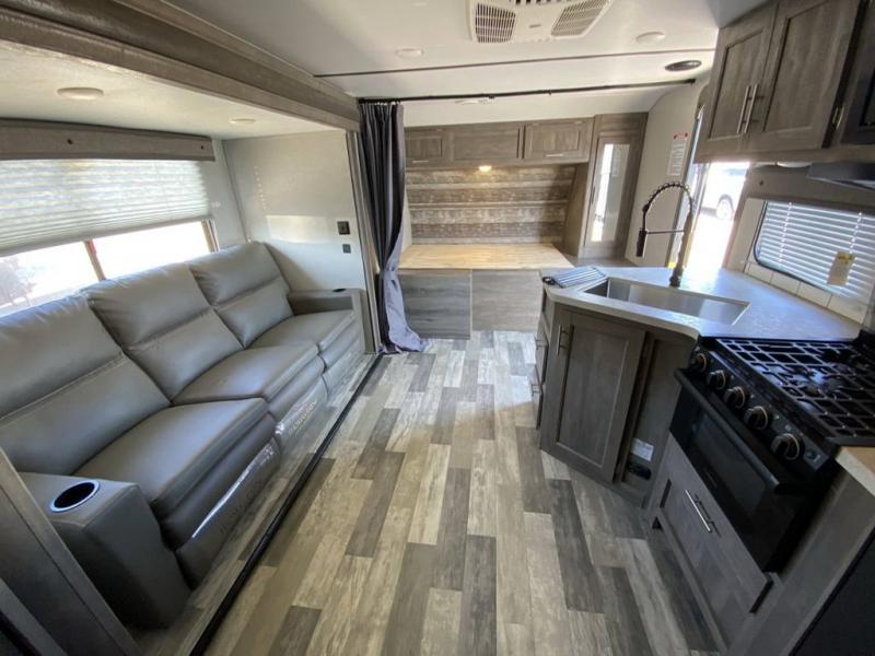 Dual entry doors in this travel trailer will make camping at your favorite state park easier than ever. Once your toys are unloaded, set up the patio deck for a cold drink. There is also Sit N Sleep sofas here and a Sleep N Store manual bed system for your guests to sleep on. Step into the walk-through bath to freshen up, then head to the full kitchen to prepare lunch on the three burner cooktop. You can relax on the theater sofa slide out, or take your plate outdoors to sit under the 15' power awning with LED lights. The RV queen bed in the front private bedroom will be calling your name after a day of fun, while your guests sleep in the separate garage. You can't beat this travel trailer!