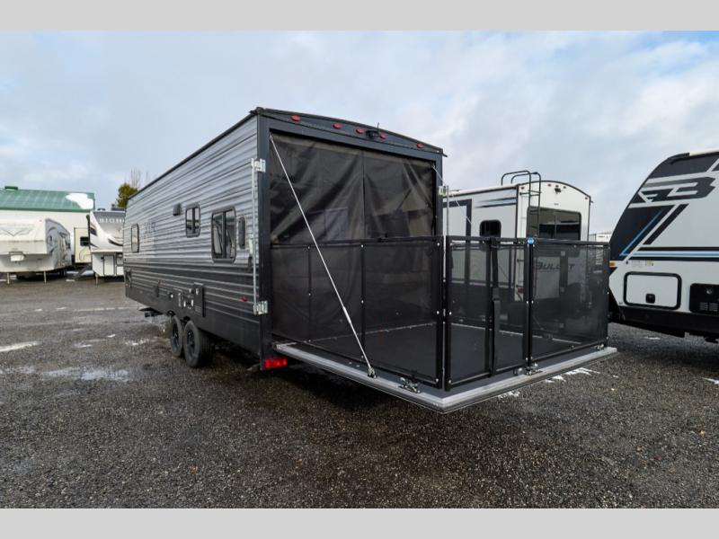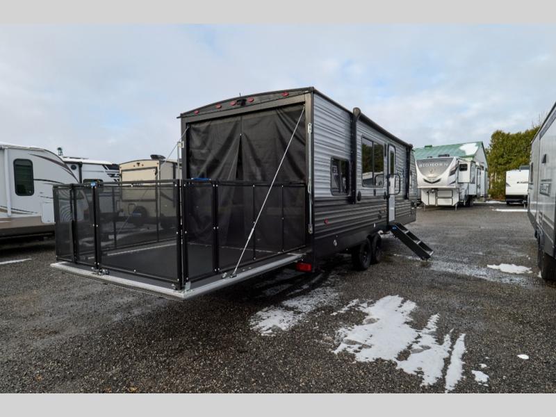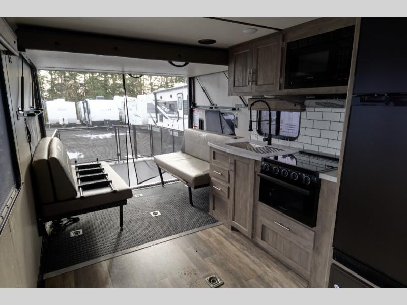 With 14' 6" total garage space, you can bring along your favorite ride-on toys for trail riding fun! Once the bikes are unloaded, set up the patio deck and relax with a cold drink. You'll also find Sit N Sleep sofas below the Sleep N Store manual bed system for more seating and sleeping space. Since this model doesn't include chairs in the main living area, you'll have more space to cook in the full kitchen, and easily head to the walk-through bath to freshen up. An RV queen bed will provide a great night's rest, and you'll find plenty of storage space for your belongings. This model also includes a 5,000 BTU fireplace, making it feel a little more like home!