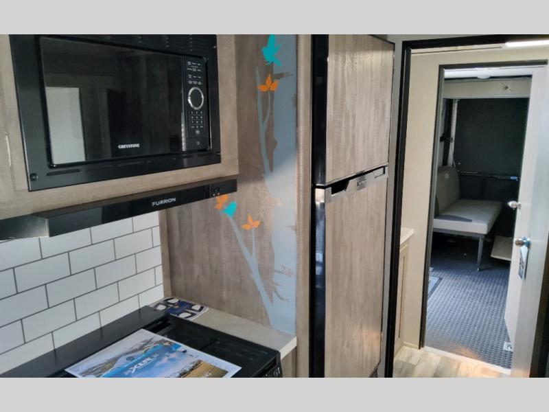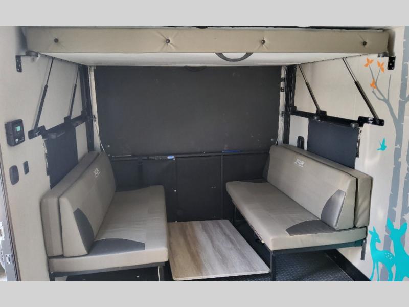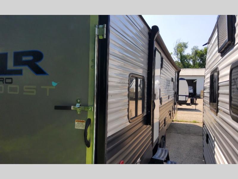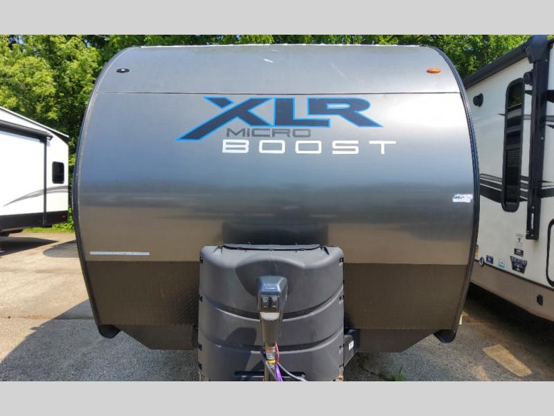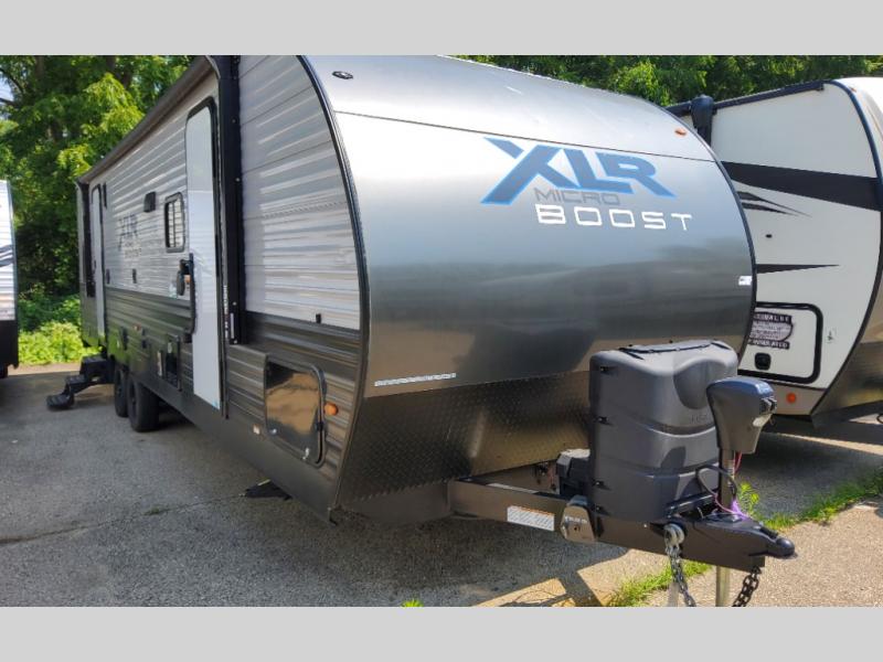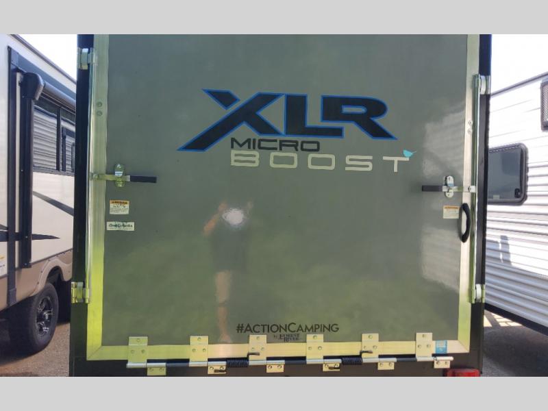 Each XLR Micro Boost toy hauler is made to last through years of use thanks to the seamless PVC roof system, the diamond plate front rock guard, and the Body Armor enclosed and insulated underbelly. You will appreciate the oil and gas resistant residential linoleum and the moisture barrier floor enclosure to keep your space clean, and the lightweight design will be perfect for smaller tow vehicles. Each model includes residential stainless steel sinks, decorative kitchen backsplash, solid core cabinet stiles, and large panoramic windows for breathtaking outdoor views. The exterior includes many convenient features to make camping easier than ever, including a pet leash for your furry friends, insulated storage doors, a hot and cold exterior shower, plus a friction hinge entry door. There is even a power awning with blue LED lights and two exterior speakers for the ultimate outdoor living space.