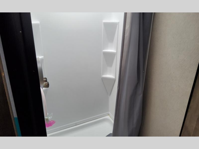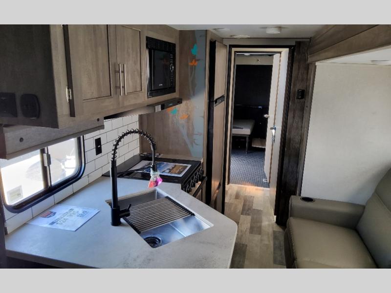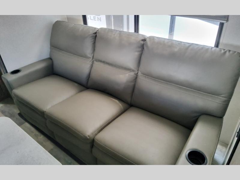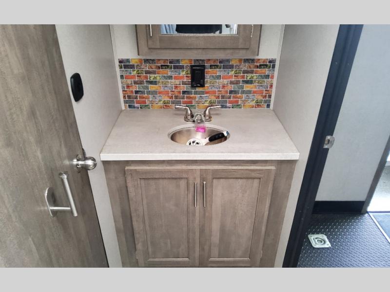Dual entry doors in this travel trailer will make camping at your favorite state park easier than ever. Once your toys are unloaded, set up the patio deck for a cold drink. There is also Sit N Sleep sofas here and a Sleep N Store manual bed system for your guests to sleep on. Step into the walk-through bath to freshen up, then head to the full kitchen to prepare lunch on the three burner cooktop. You can relax on the theater sofa slide out, or take your plate outdoors to sit under the 15' power awning with LED lights. The RV queen bed in the front private bedroom will be calling your name after a day of fun, while your guests sleep in the separate garage. You can't beat this travel trailer!