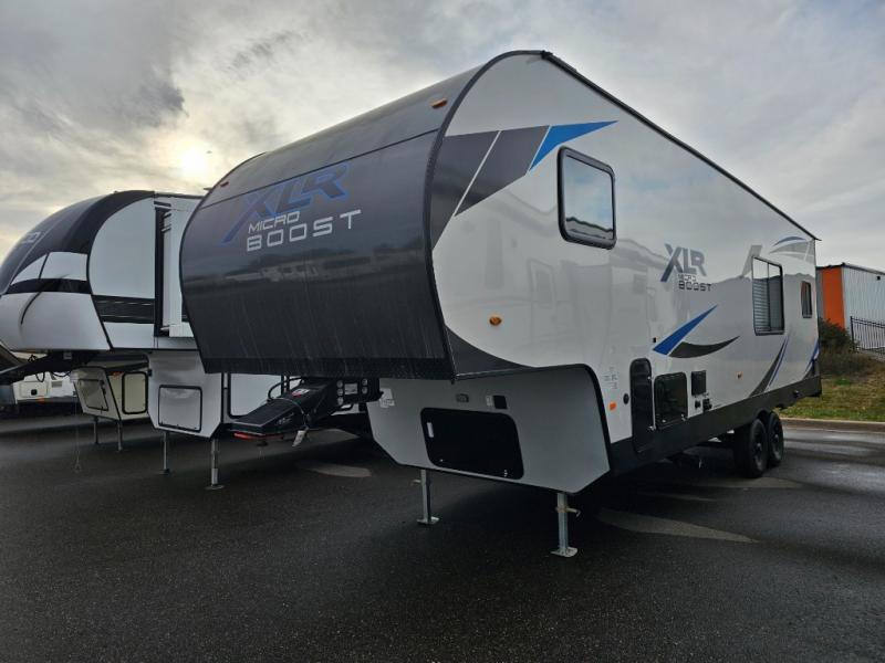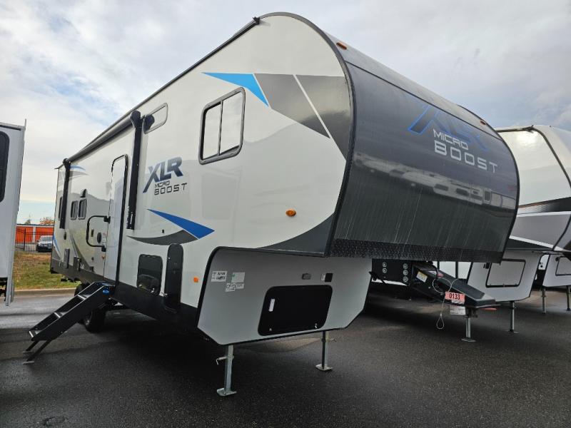 Each XLR Micro Boost toy hauler is made to last through years of use thanks to the seamless PVC roof system, the diamond plate front rock guard, and the Body Armor enclosed and insulated underbelly. You will appreciate the oil and gas resistant residential linoleum and the moisture barrier floor enclosure to keep your space clean, and the lightweight design will be perfect for smaller tow vehicles. Each model includes residential stainless steel sinks, decorative kitchen backsplash, solid core cabinet stiles, and large panoramic windows for breathtaking outdoor views. The exterior includes many convenient features to make camping easier than ever, including a pet leash for your furry friends, insulated storage doors, a hot and cold exterior shower, plus a friction hinge entry door. There is even a power awning with blue LED lights and two exterior speakers for the ultimate outdoor living space.