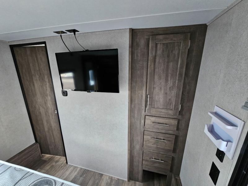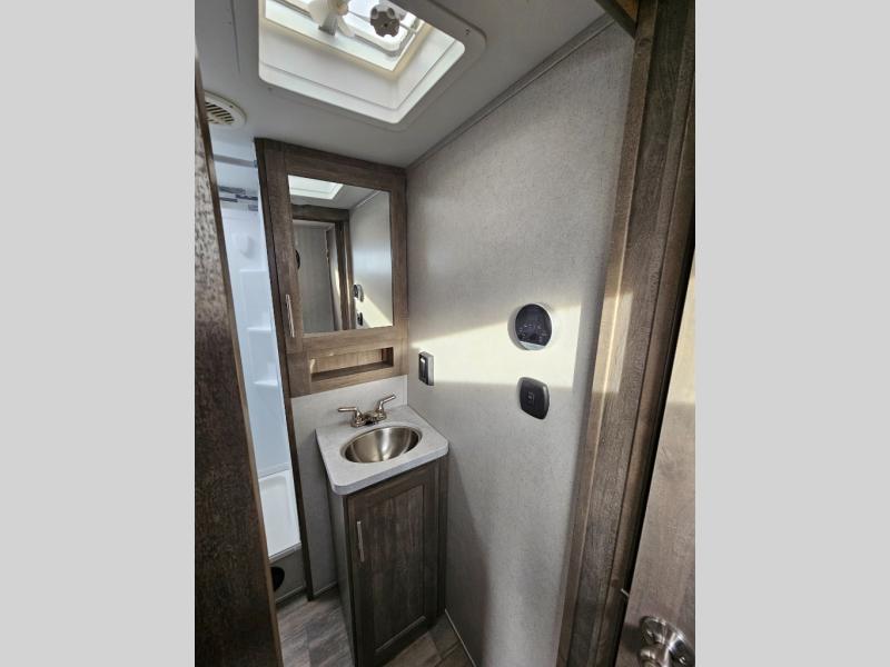 Pack your bags and head to your favorite camping spot in this fifth wheel for seven. The patio deck will be a big hit when entertaining guests, and if they decide to stay over, they can sleep on the Sleep N Store manual bed system. There are also Sit N Sleep sofas under the drop-down bed for even more sleeping space. While the chef of your group is preparing a meal on the three burner cooktop, everyone else can visit on the rollover sofa or the two barrel chairs. If you want a little more comfort, just choose the optional Euro recliners in place of the barrel chairs and you're good to go! The front private bedroom with an RV queen bed, night stands and beside shelves is sure to bring comfort, and you can clean up in the full bath before ending your day!