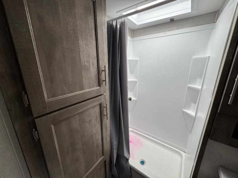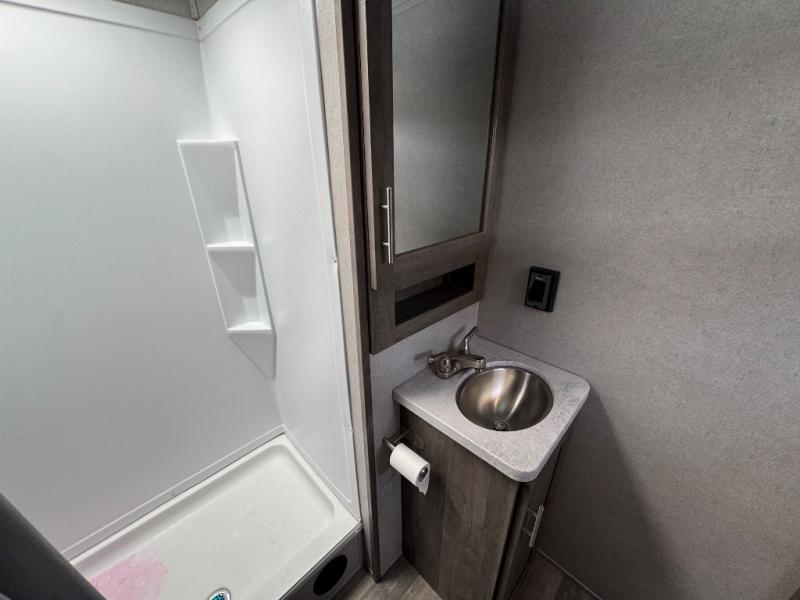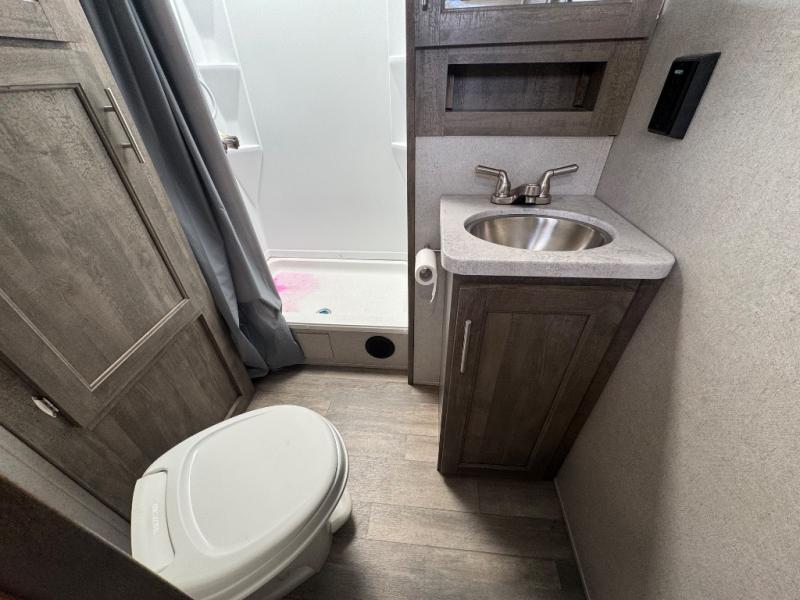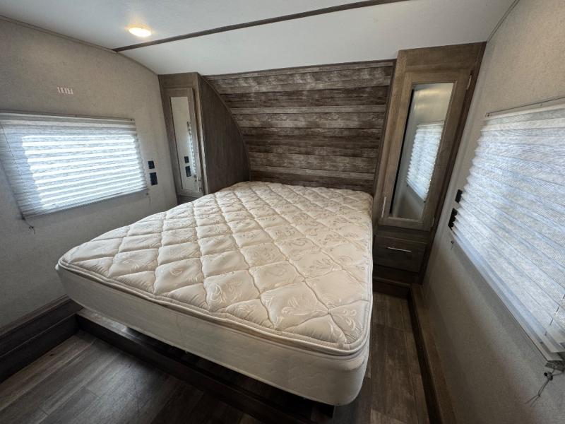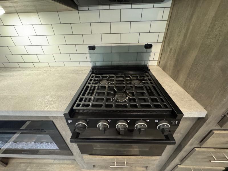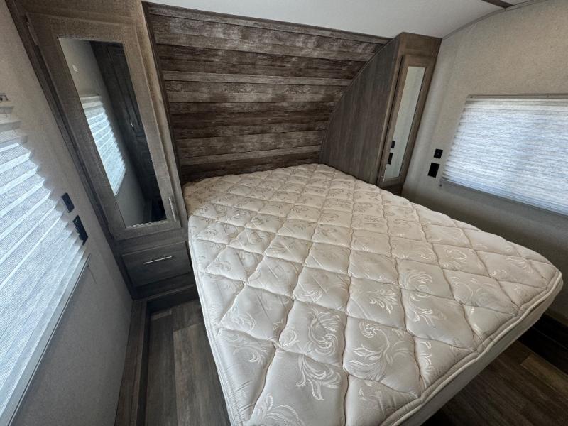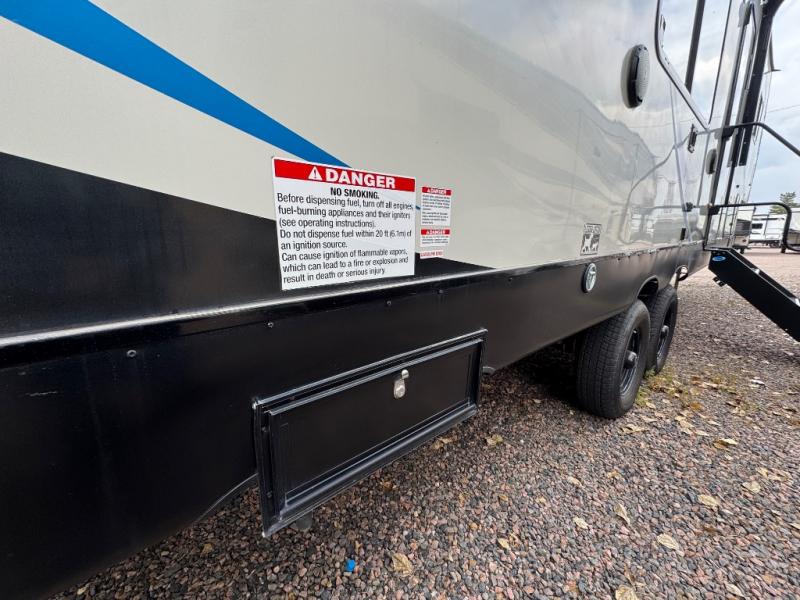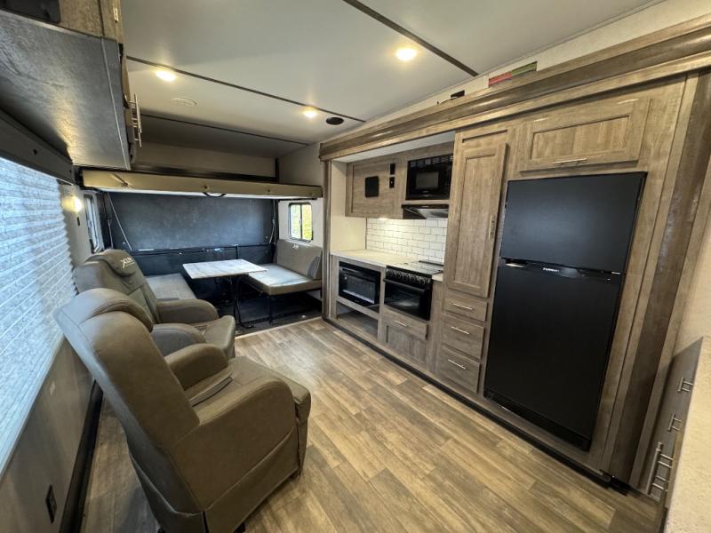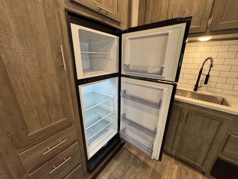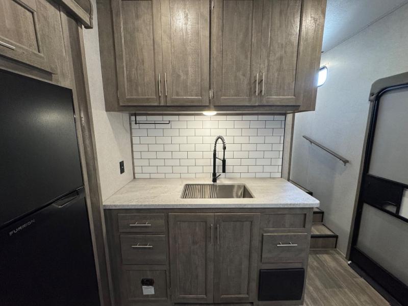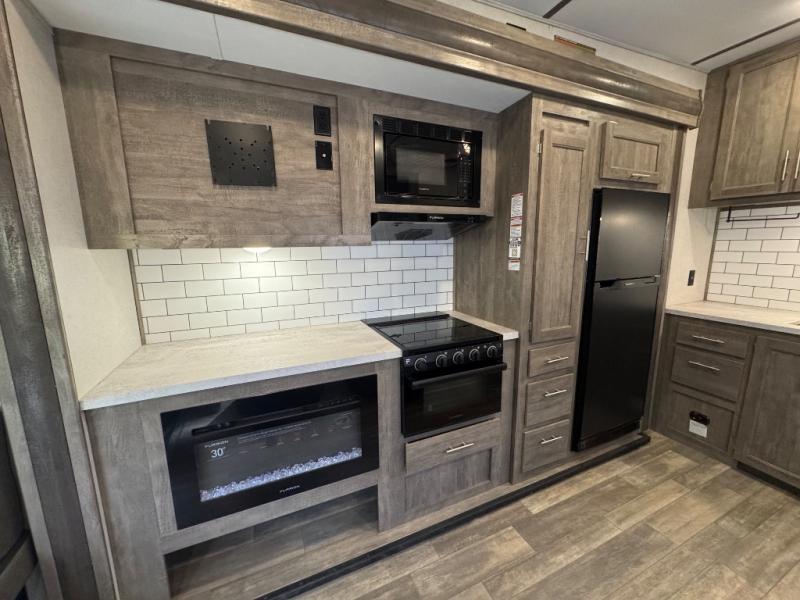 This fifth wheel features 16' total garage space for dirt bikes, a four-wheeler, or kayaks! The patio deck will provide a place to relax once your toys are unloaded, and there is additional seating on the Sit N Sleep sofas and the two barrel chairs inside. A 5,000 BTU fireplace will make this model feel more like home, and there is convenient TV prep if you want to enjoy movie nights. Having a fully-equipped kitchen with a 17" oven and a three burner cooktop means you won't have to cook over an open flame each night, and the residential walk-in shower will allow you to clean up after a trail ride. When it's time to get some shut-eye, you'll find an RV queen bed in the front private bedroom, and your guests can sleep on the Sleep N Store manual bed system and the Sit N Sleep sofas.