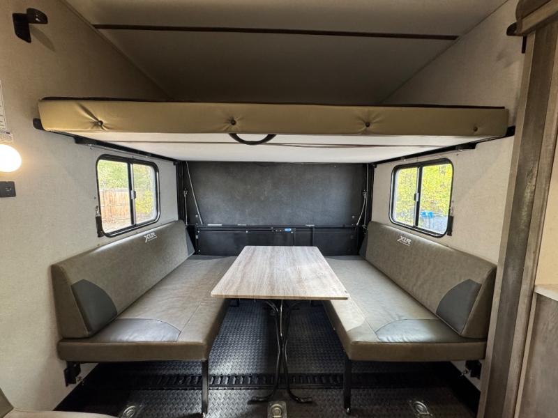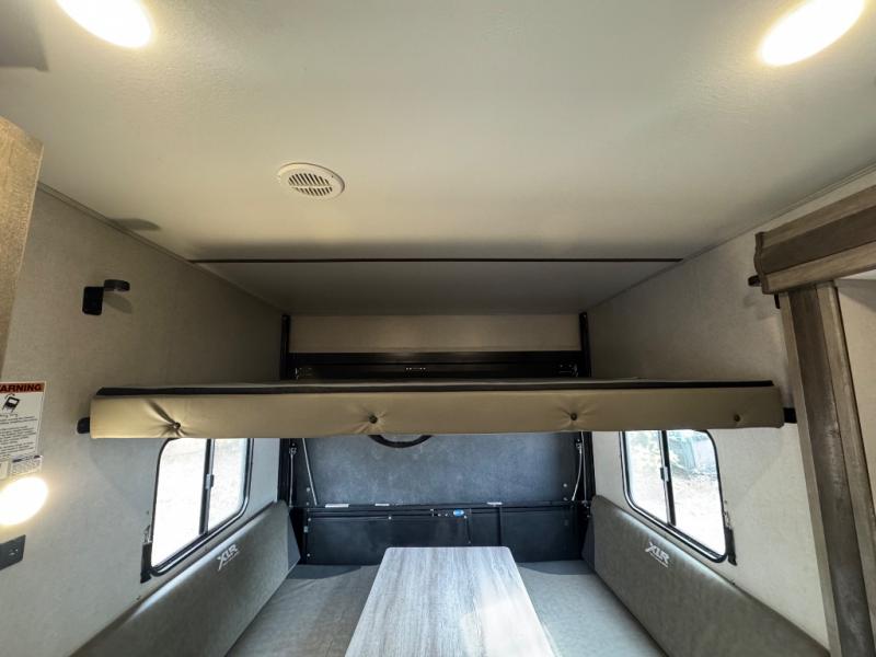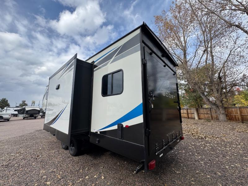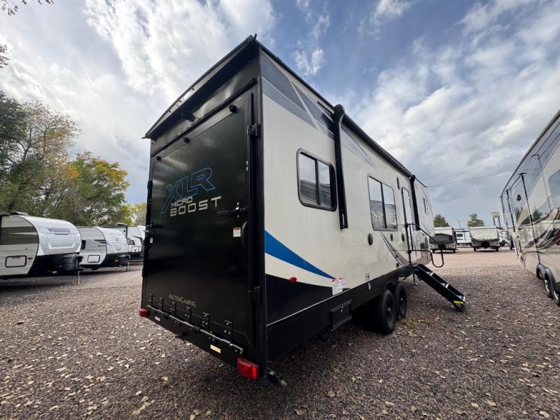 Each XLR Micro Boost toy hauler is made to last through years of use thanks to the seamless PVC roof system, the diamond plate front rock guard, and the Body Armor enclosed and insulated underbelly. You will appreciate the oil and gas resistant residential linoleum and the moisture barrier floor enclosure to keep your space clean, and the lightweight design will be perfect for smaller tow vehicles. Each model includes residential stainless steel sinks, decorative kitchen backsplash, solid core cabinet stiles, and large panoramic windows for breathtaking outdoor views. The exterior includes many convenient features to make camping easier than ever, including a pet leash for your furry friends, insulated storage doors, a hot and cold exterior shower, plus a friction hinge entry door. There is even a power awning with blue LED lights and two exterior speakers for the ultimate outdoor living space.