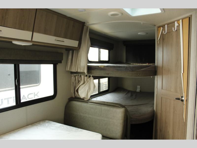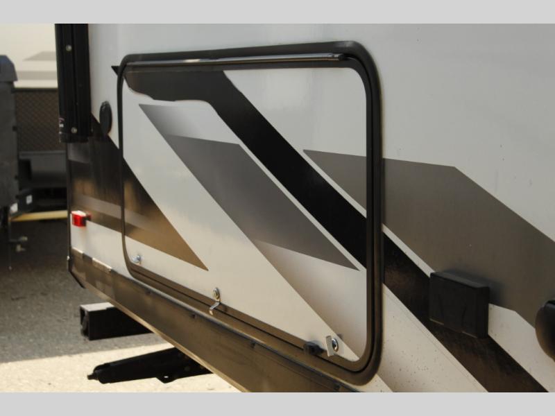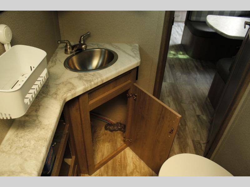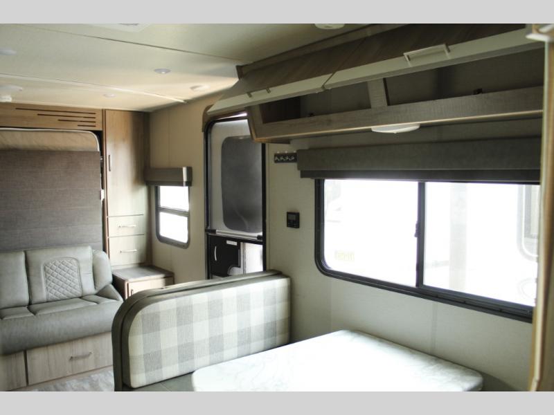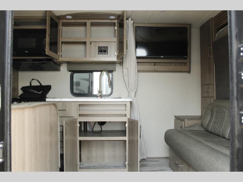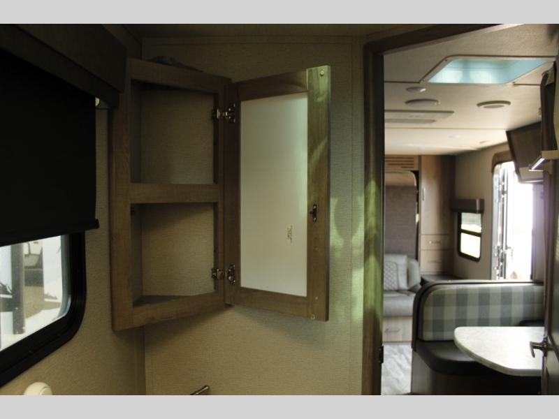 There are plenty of overhead cabinets throughout the trailer, as well as a large exterior pass thru storage area.