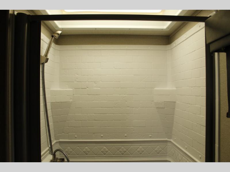 The side aisle bath offers a corner shower with an optional glass door, sink, and a toilet. Plus the bath is right across from the entry door for easy access when playing outside.