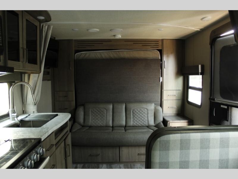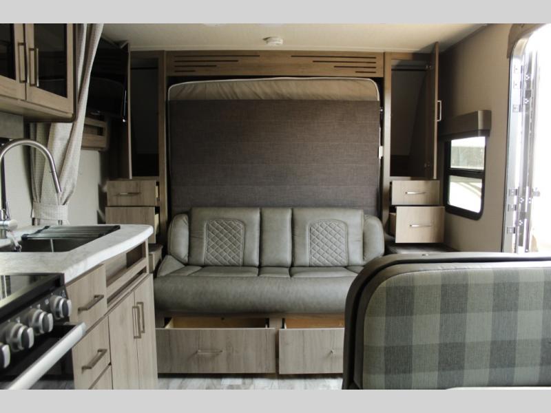 As you enter the travel trailer, to the left is a shelf and sofa including overhead storage as well.