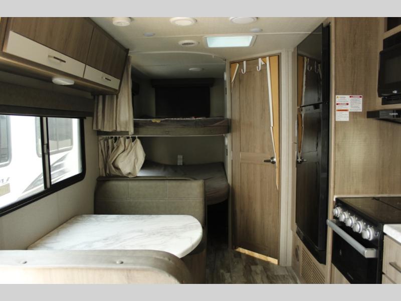 The rear kitchen features a sink and countertop beginning on the curb side wall. The counter continues along the rear wall. Plus there is a three burner range, microwave, refrigerator, and a pantry. The U-shaped dinette slide out provides more floor space in the kitchen and living area. Next to the dinette you will find an entertainment center on the interior wall for your enjoyment.