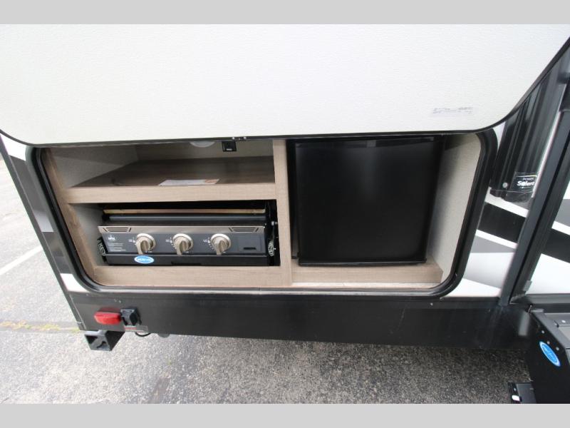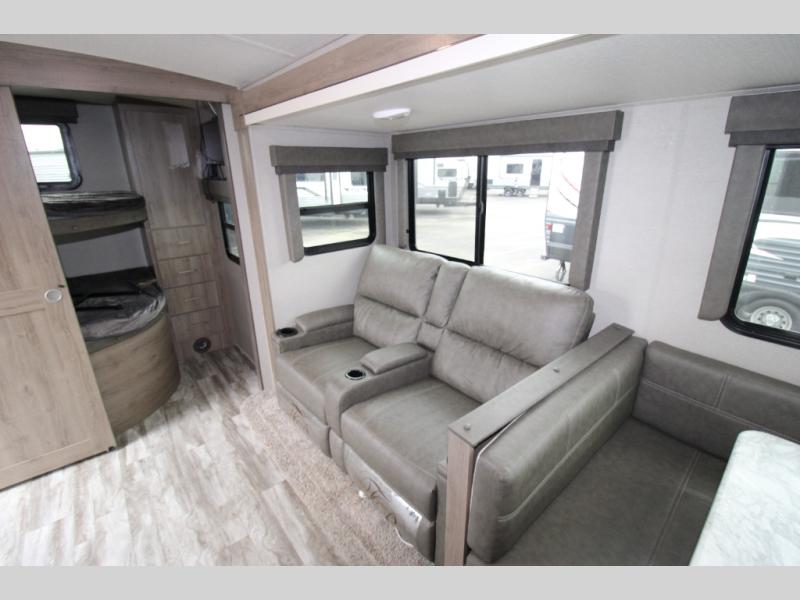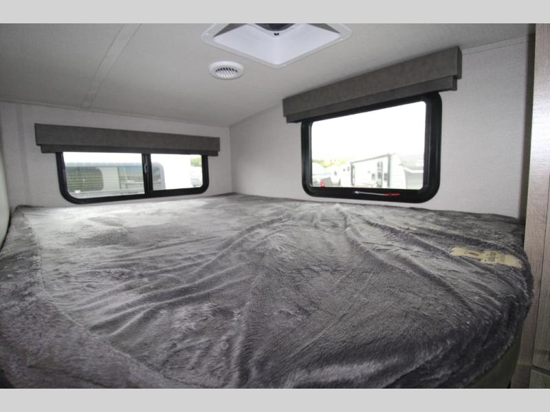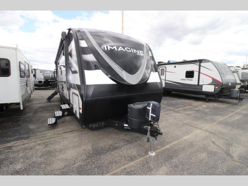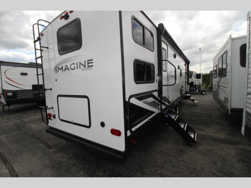 With this Imagine travel trailer, you won't have to imagine what a great camping trip will be like because you can live it! The kitchen includes everything you will need to prepare a meal for everyone, like a 10-cubic foot refrigerator, three-burner range with oven, microwave, stainless steel sink, and flip-up countertop extension. There is a pet dish below the refrigerator, and the LED HDTV sits across from the tri-fold sofa and U-shaped dinette with removable ottoman so that you can watch a movie or the big game in comfort. Another great addition is the private bunkhouse because it provides you with a second secluded sleeping space. This bunkhouse includes a wardrobe, drawers, and an area prepped for a TV.