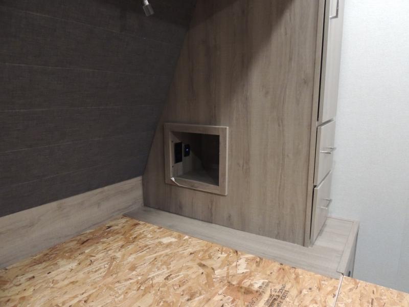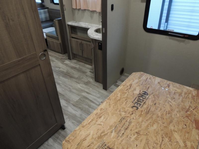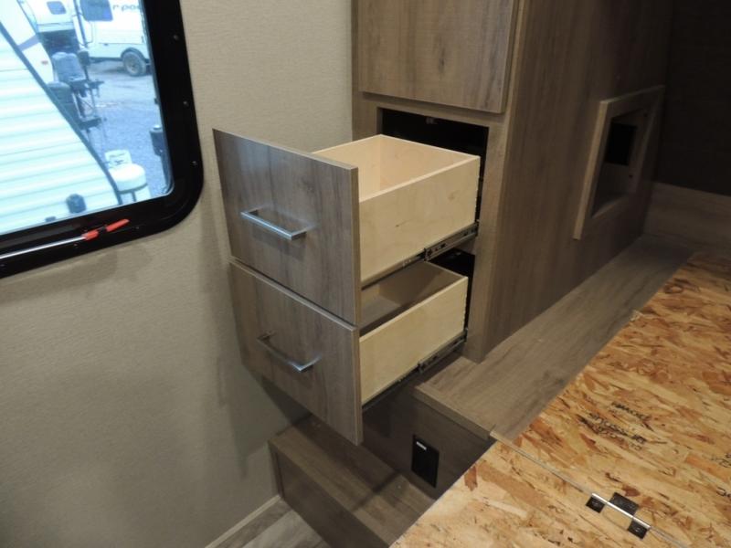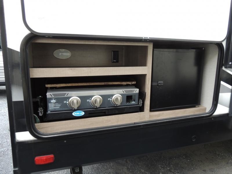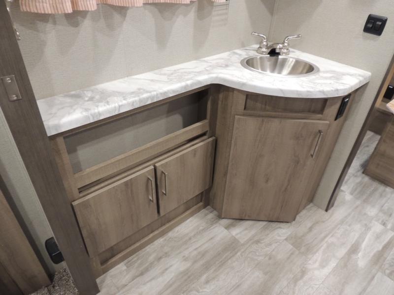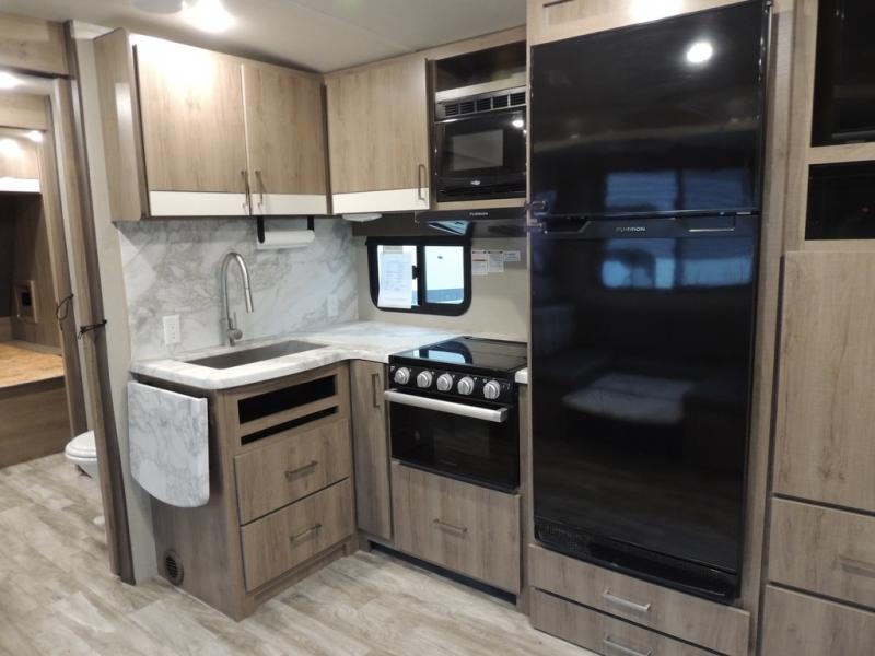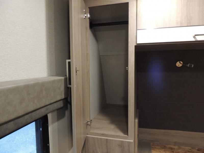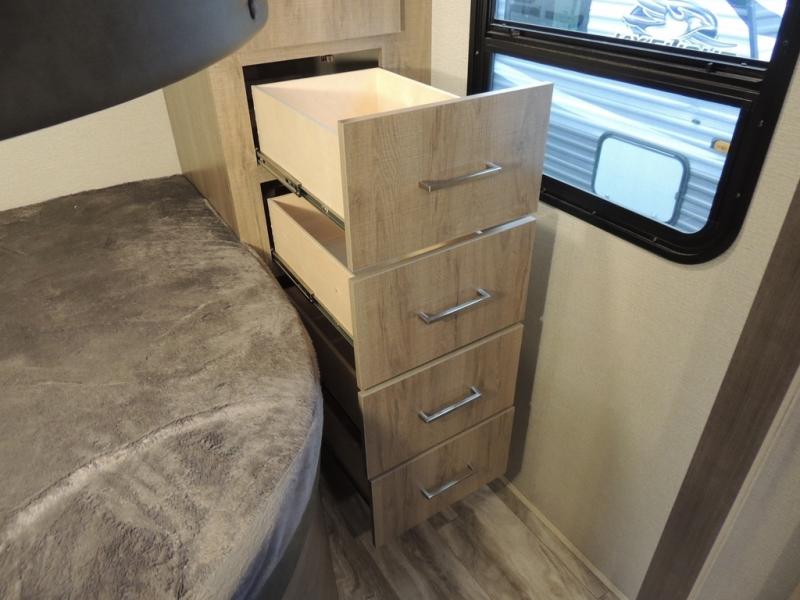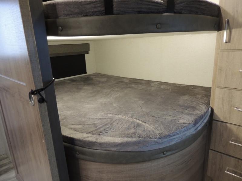 With this Imagine travel trailer, you won't have to imagine what a great camping trip will be like because you can live it! The kitchen includes everything you will need to prepare a meal for everyone, like a 10-cubic foot refrigerator, three-burner range with oven, microwave, stainless steel sink, and flip-up countertop extension. There is a pet dish below the refrigerator, and the LED HDTV sits across from the tri-fold sofa and U-shaped dinette with removable ottoman so that you can watch a movie or the big game in comfort. Another great addition is the private bunkhouse because it provides you with a second secluded sleeping space. This bunkhouse includes a wardrobe, drawers, and an area prepped for a TV.