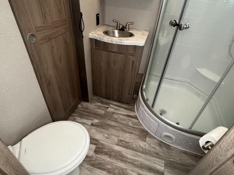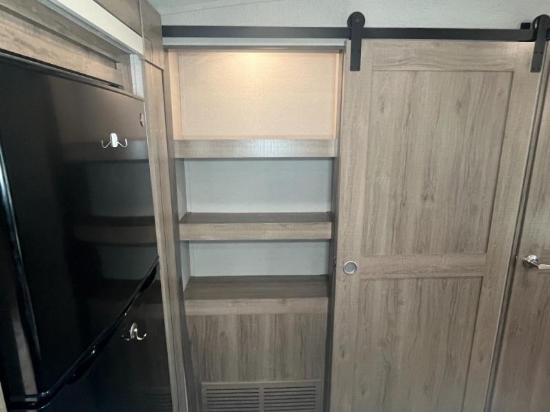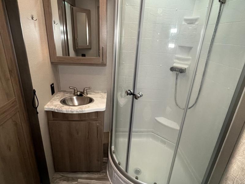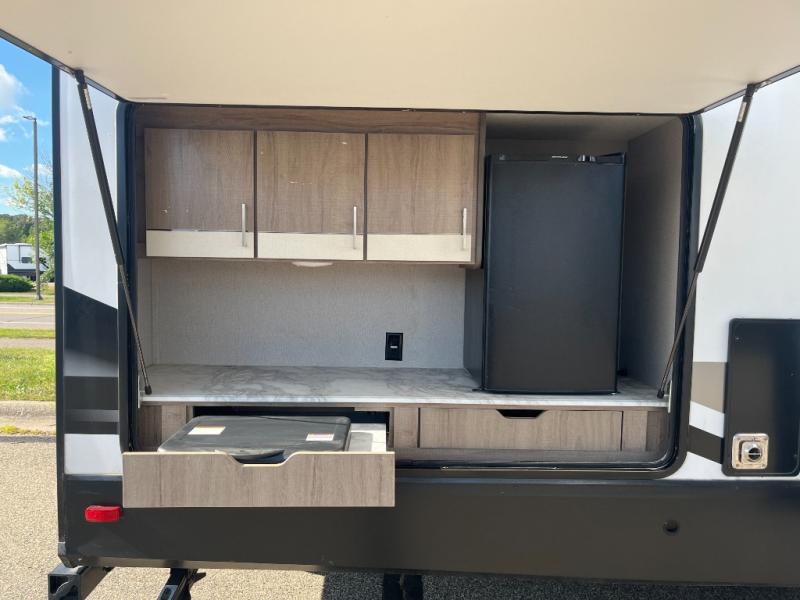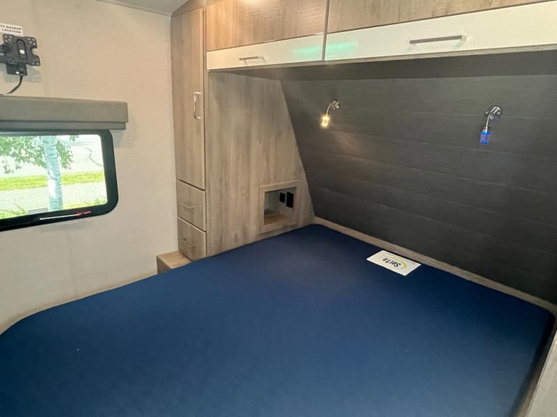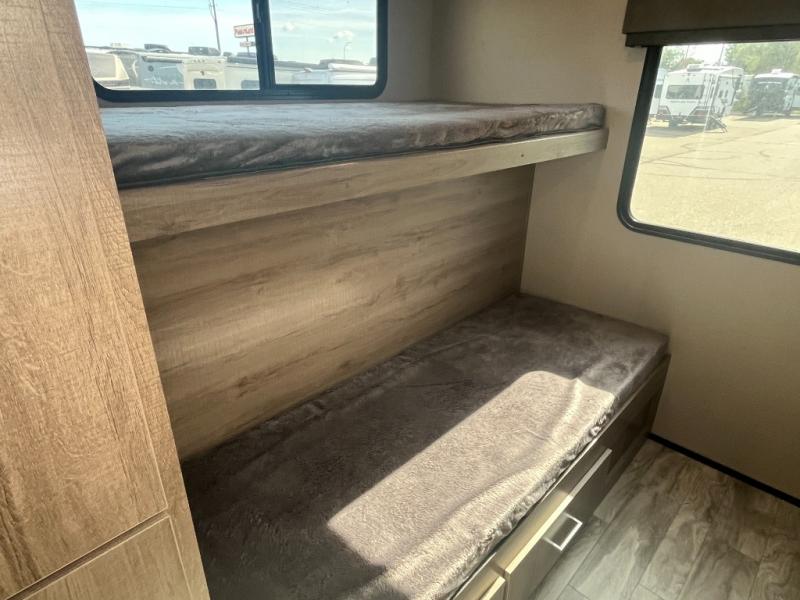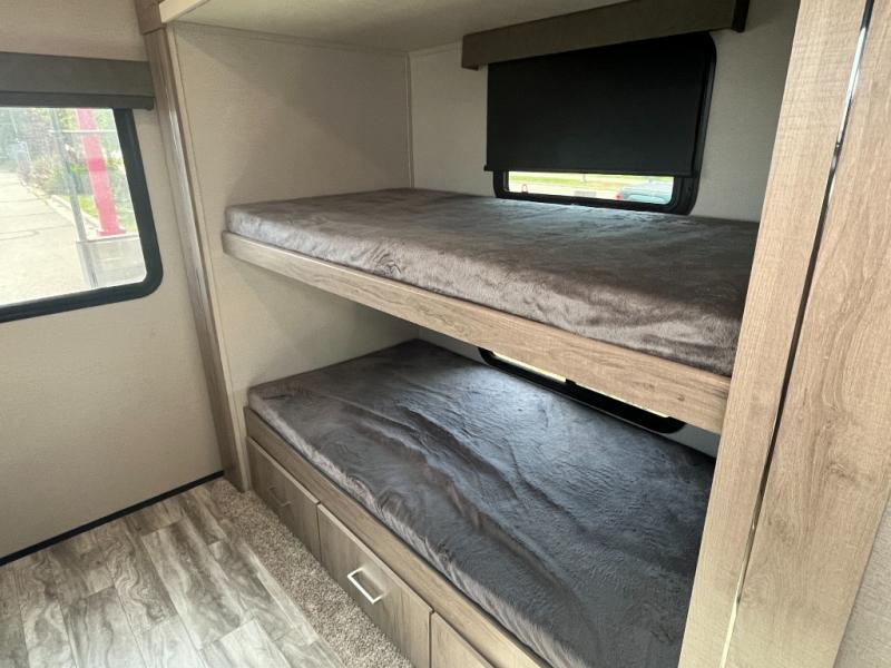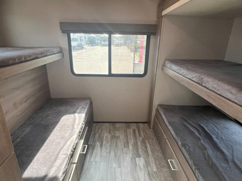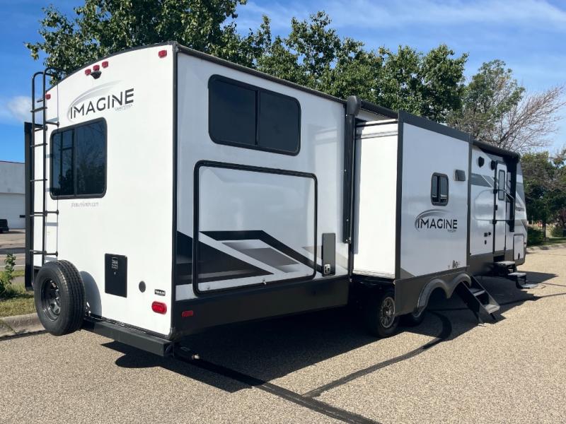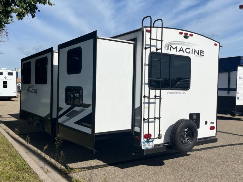 This Imagine travel trailer has an amazing amount of convenience with its two private sleeping spaces! There is a master suite in the front and a private bunkhouse in the back. The master suite contains a 60" x 80" bed with overhead cabinets and closets on either side of the bed. It also has the second exterior entry door as well as a private entrance into the dual-entry bathroom. The bunkhouse offers sleeping space for four with its four bunk beds, and it also has four drawers below the bottom bunks. The main living area has opposing slides which offer more space for all of these people to socialize in the evening, and the 40" LED HDTV on a swing arm will provide entertainment for everyone.