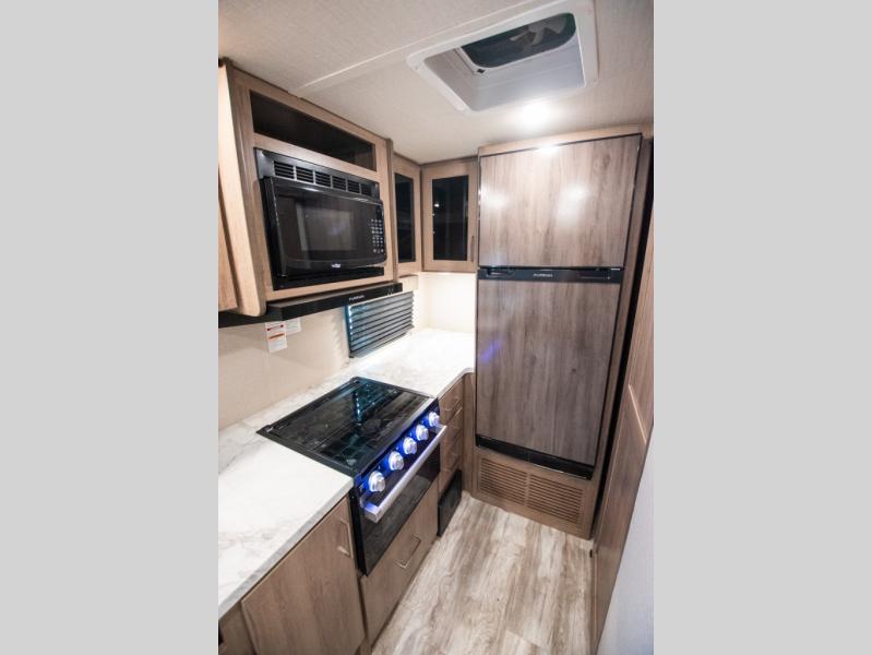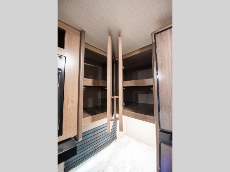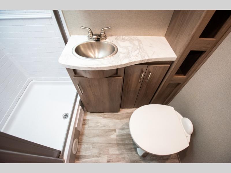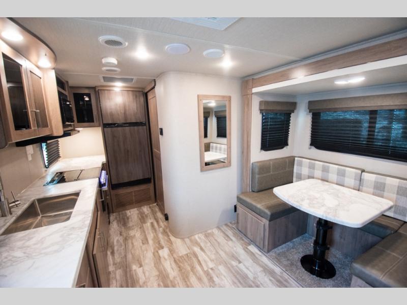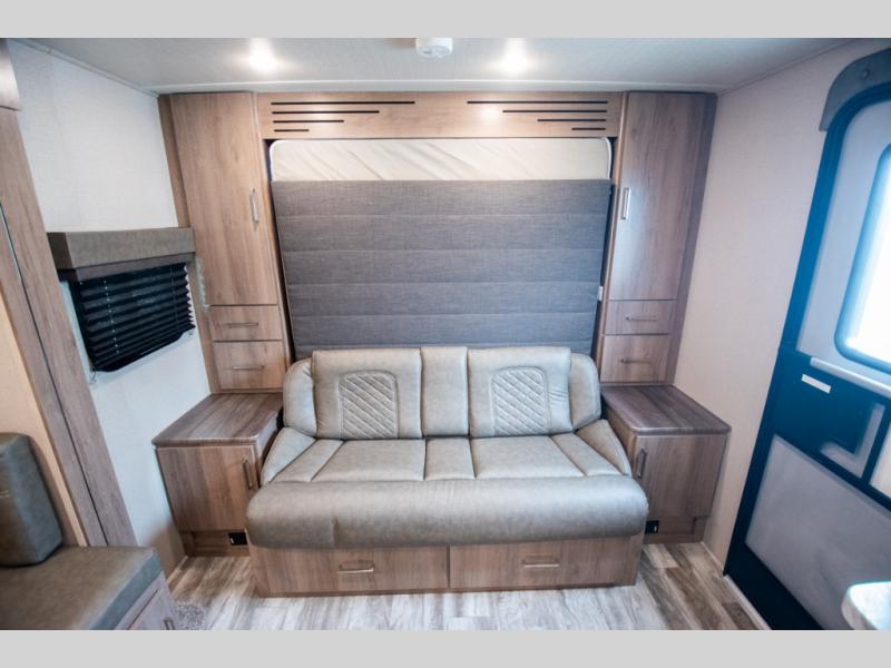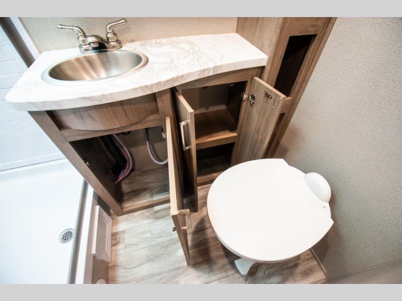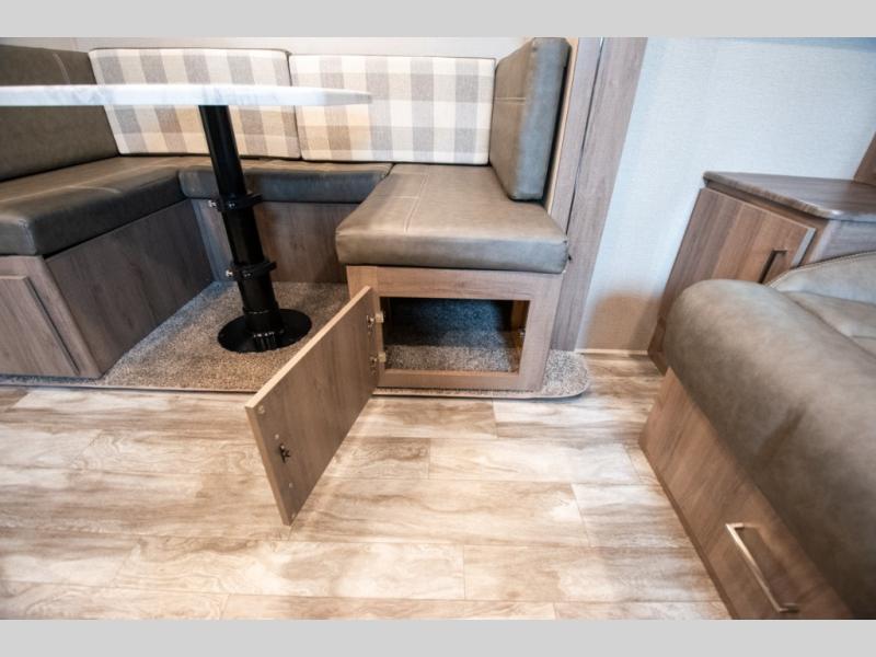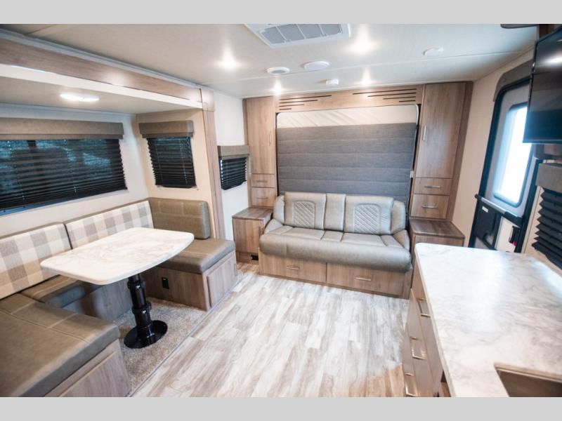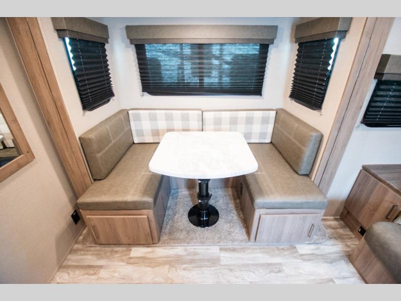 The Murphy bed is the eye-catching feature on this Imagine XLS travel trailer! Not only can it fold away in the morning to reveal a sofa for lounging, but it will also provide you with drawer storage under the sofa. Another functional feature is the theater dinette with a removable table in front. It rests on the single slide so that there is more floor space, and it offers you great comfort while you dine across from the LED HDTV. A full bathroom will keep you clean and fresh with its residential walk-in shower, skylight, linen closet, vanity, toilet, and power vent fan.