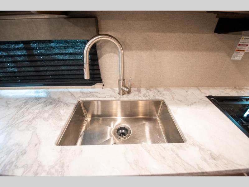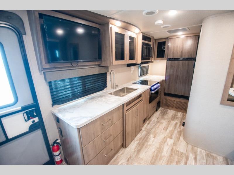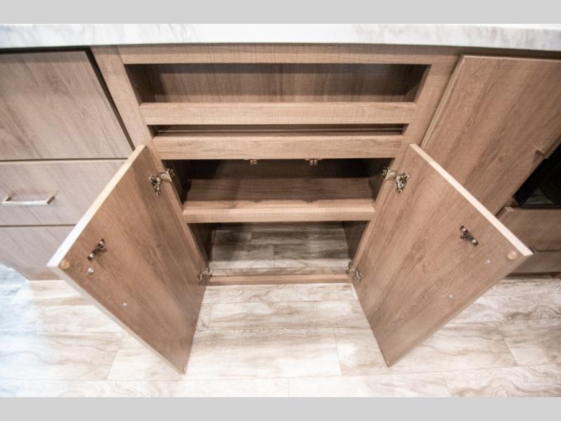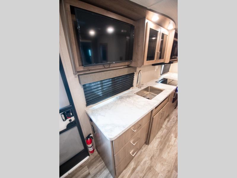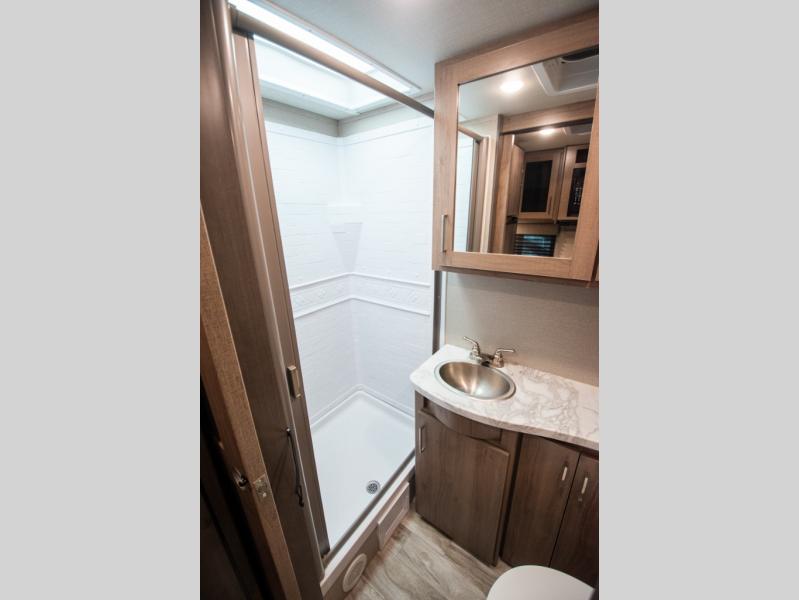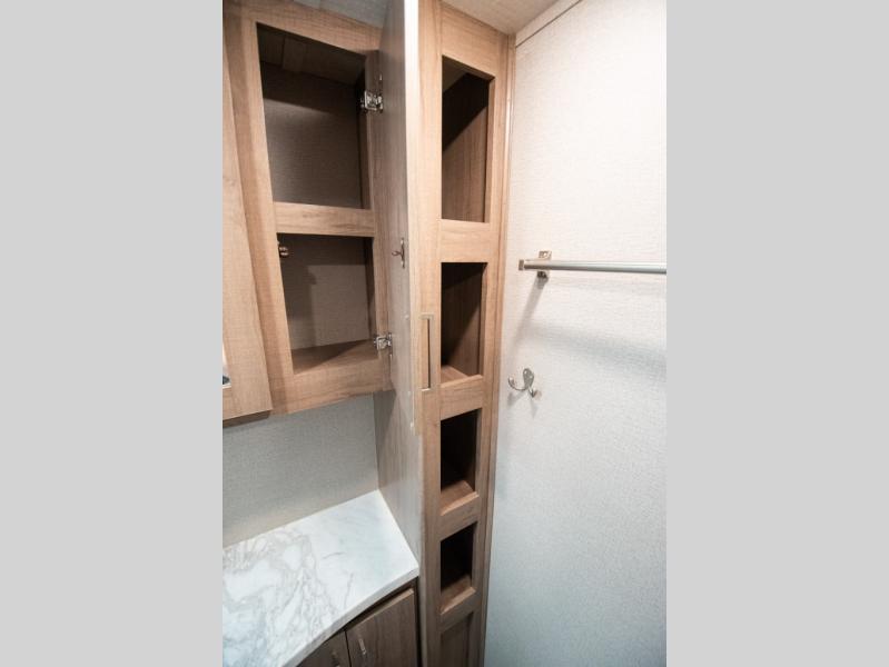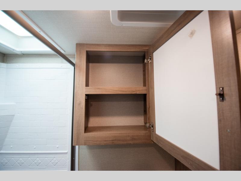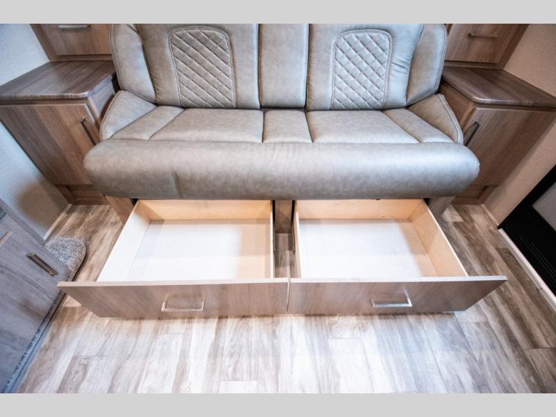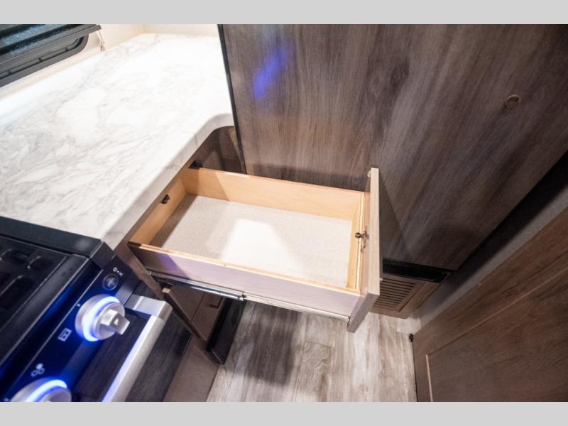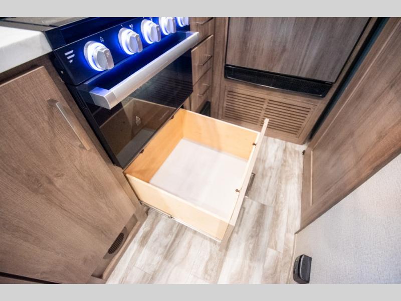 The Murphy bed is the eye-catching feature on this Imagine XLS travel trailer! Not only can it fold away in the morning to reveal a sofa for lounging, but it will also provide you with drawer storage under the sofa. Another functional feature is the theater dinette with a removable table in front. It rests on the single slide so that there is more floor space, and it offers you great comfort while you dine across from the LED HDTV. A full bathroom will keep you clean and fresh with its residential walk-in shower, skylight, linen closet, vanity, toilet, and power vent fan.
