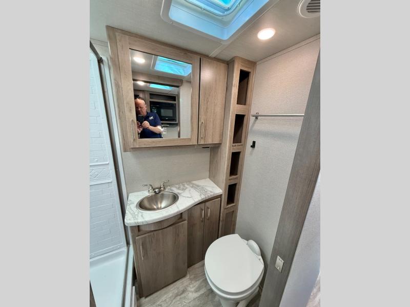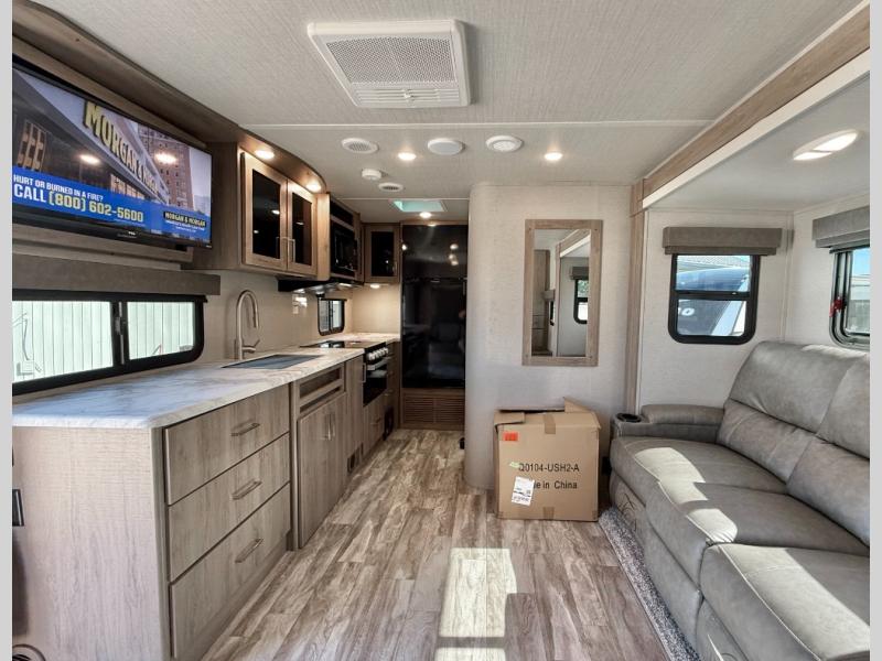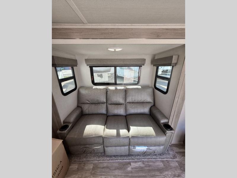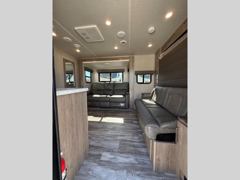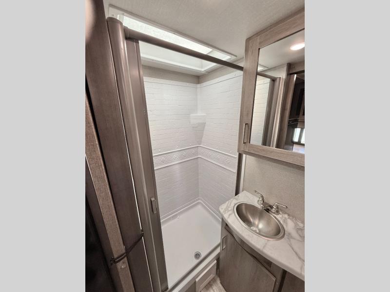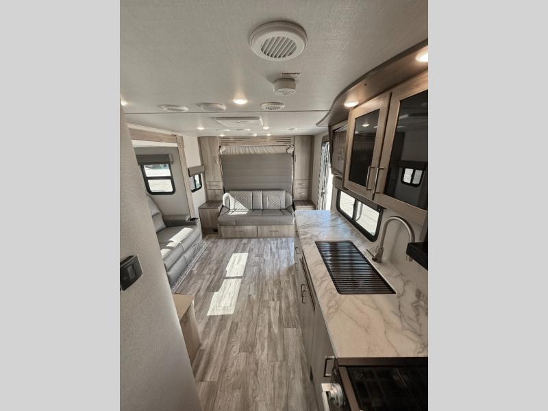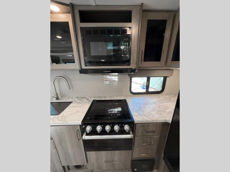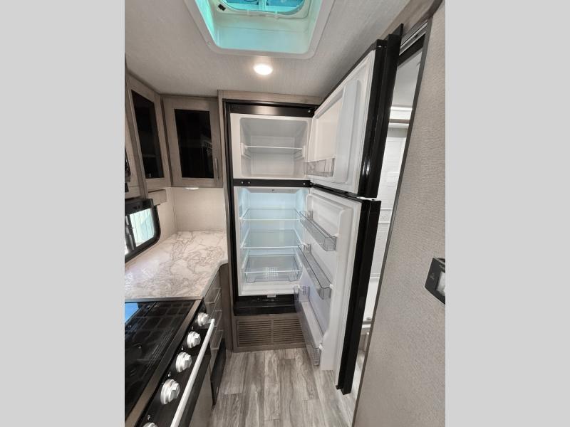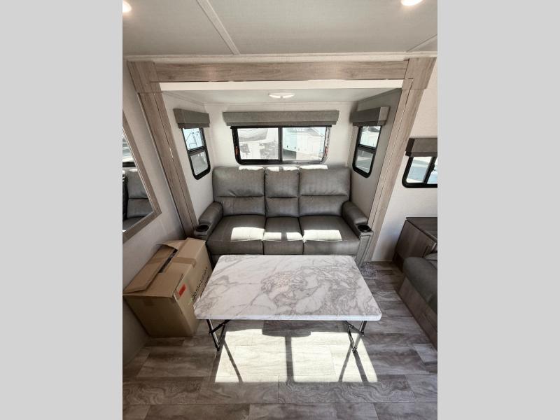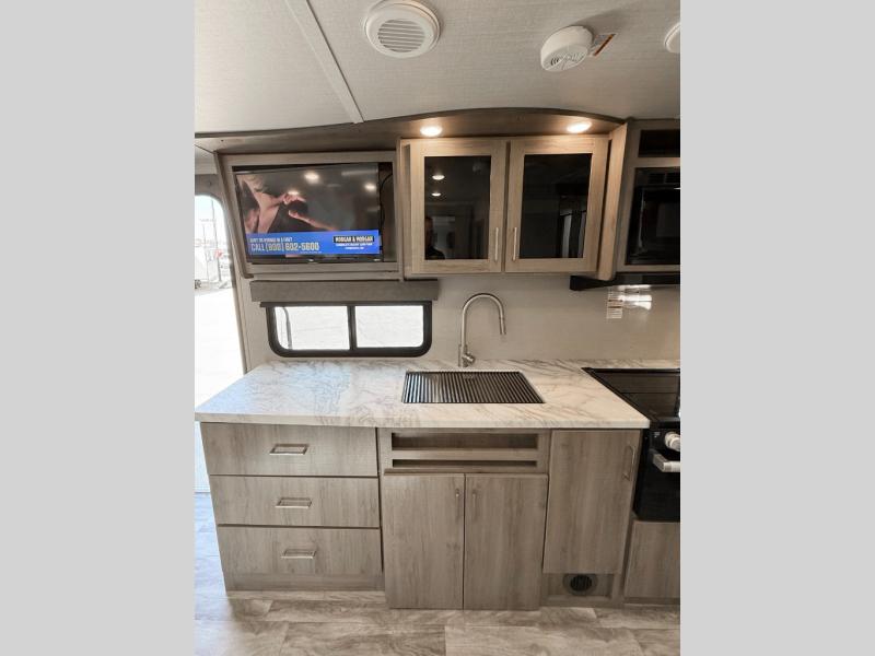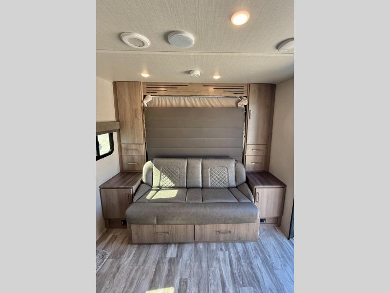 The Murphy bed is the eye-catching feature on this Imagine XLS travel trailer! Not only can it fold away in the morning to reveal a sofa for lounging, but it will also provide you with drawer storage under the sofa. Another functional feature is the theater dinette with a removable table in front. It rests on the single slide so that there is more floor space, and it offers you great comfort while you dine across from the LED HDTV. A full bathroom will keep you clean and fresh with its residential walk-in shower, skylight, linen closet, vanity, toilet, and power vent fan.