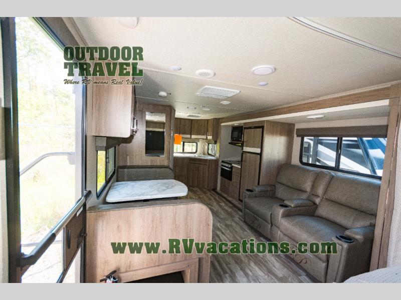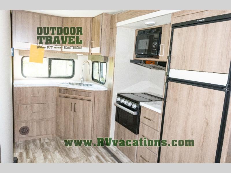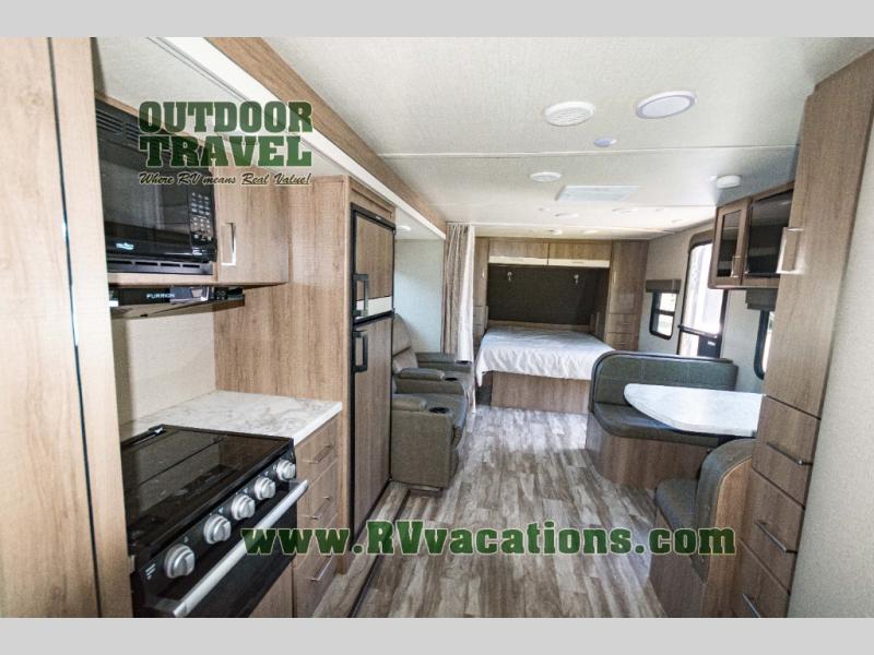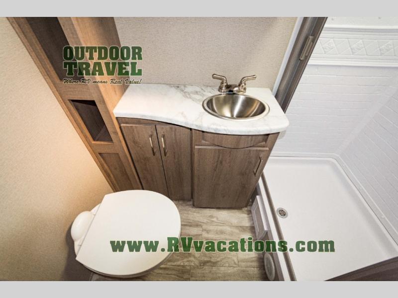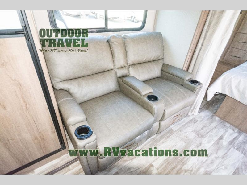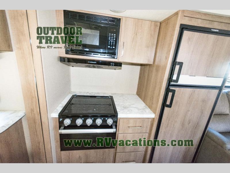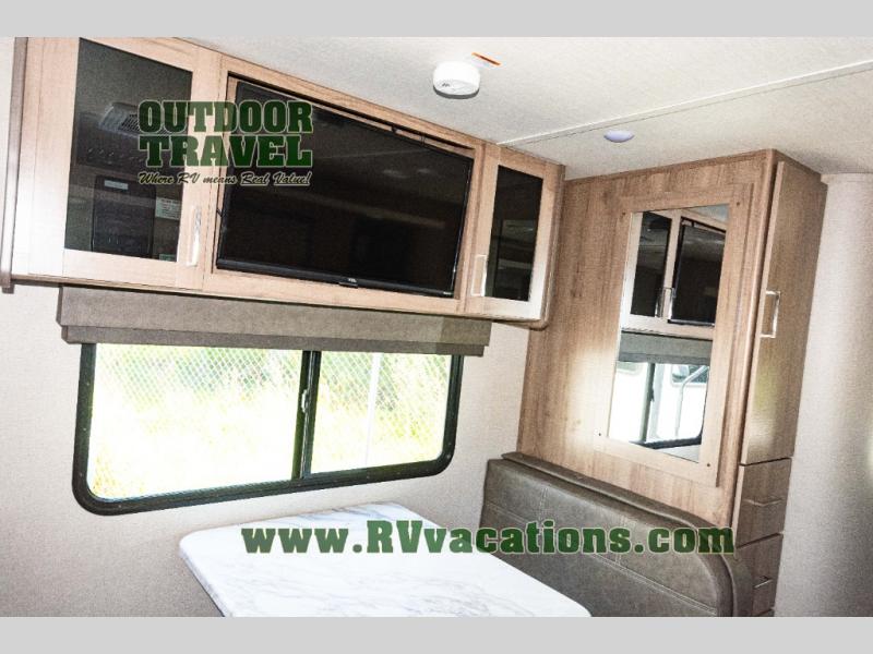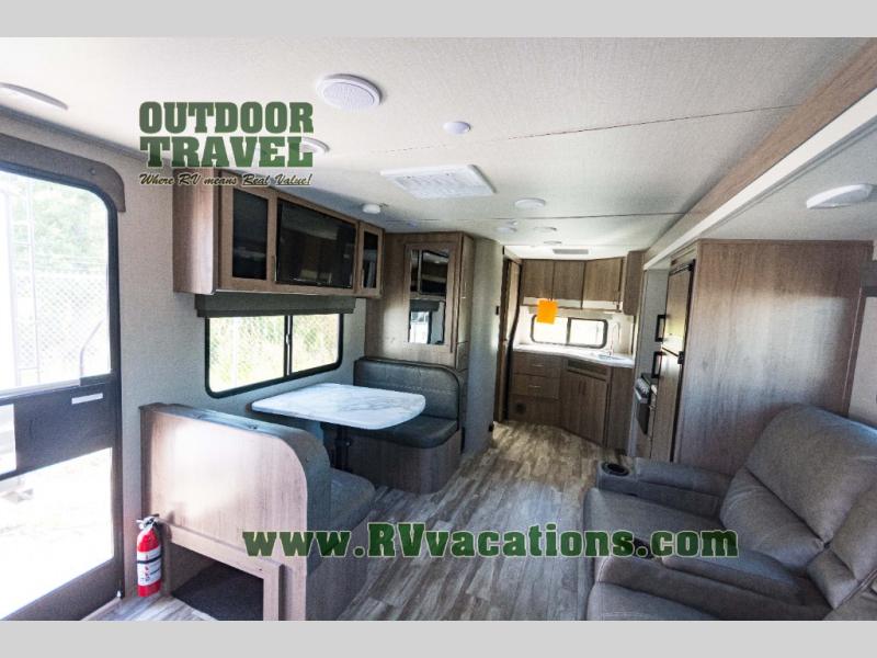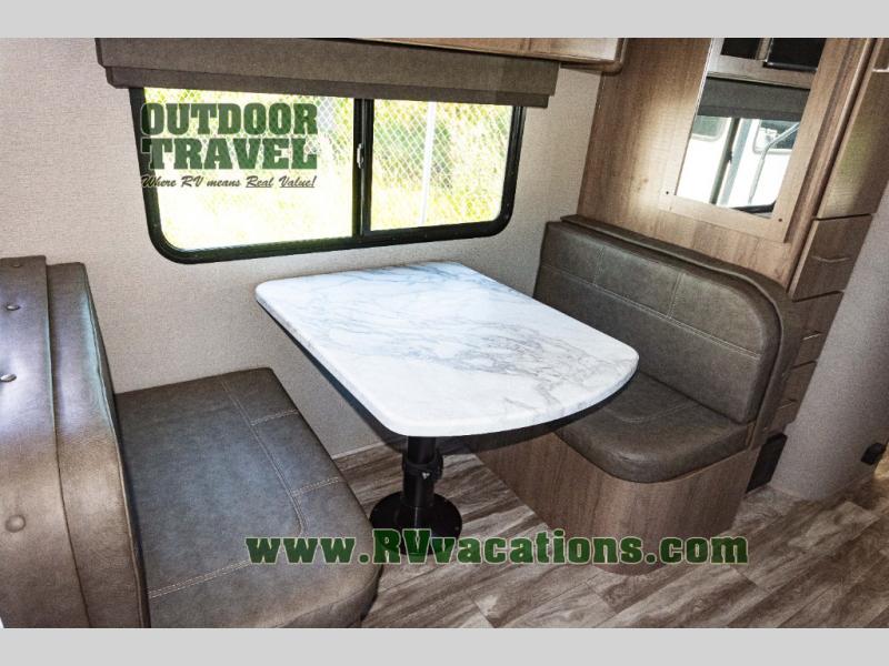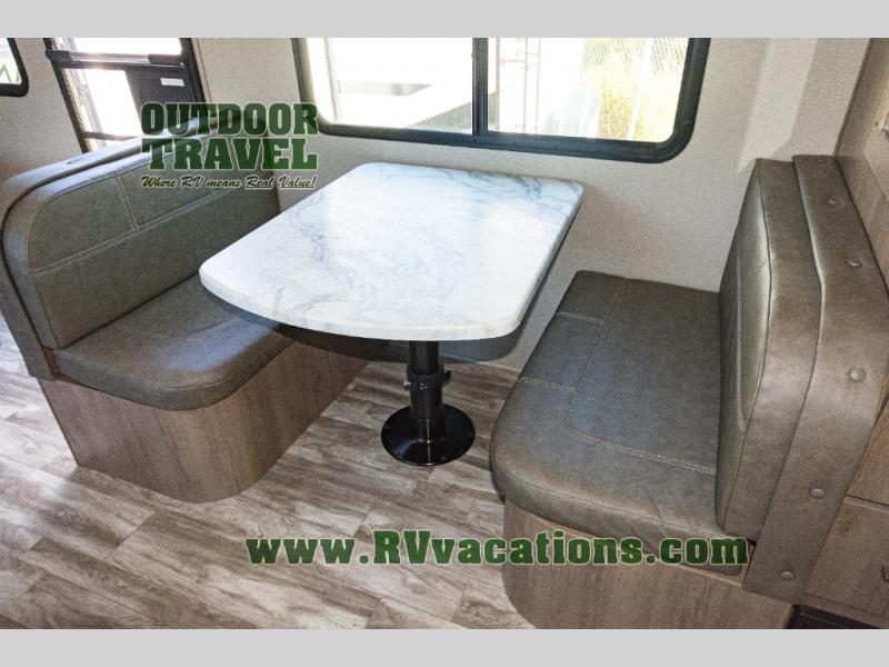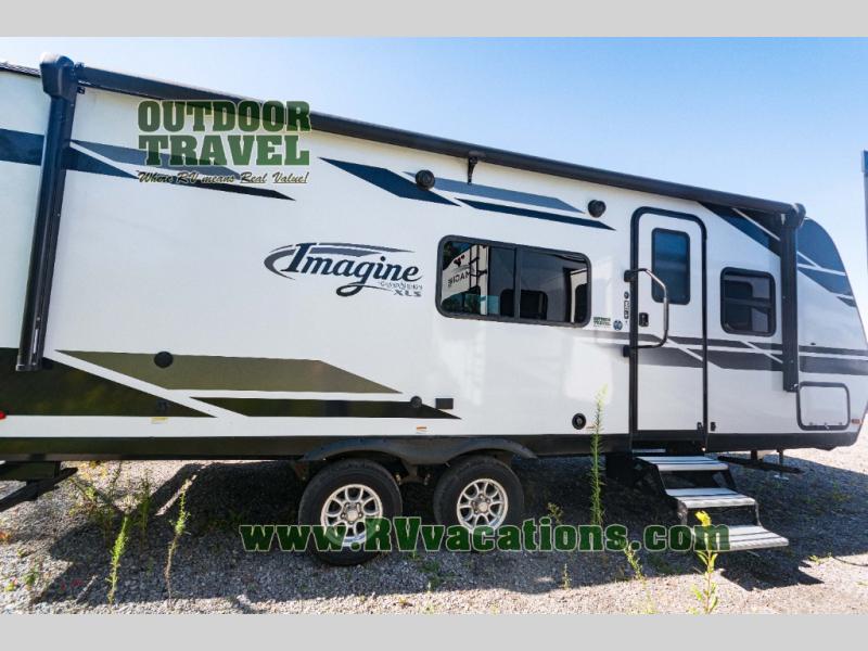 This Imagine XLS travel trailer has theater seating and a booth dinette that you can use any time you need a little break from the outdoors. If you want to come in and grab a coffee, put together a puzzle, or work on your itinerary for the week, just put up your feet and relax. You could even switch on the LED HDTV if you want a little entertainment. The front queen-size bed has a privacy curtain that you can draw to create a semi-private bedroom, and in the back of the trailer you will find the rest of your amenities, like the kitchen and the bathroom. The large slide makes it easy to enjoy spending your time indoors, but if you do want to get back outside, you can sit underneath the 18' electric awning for some shade.