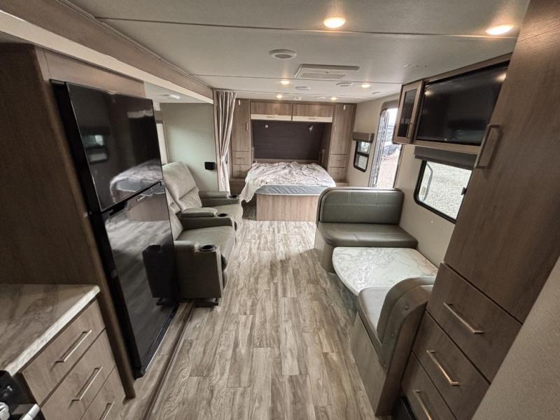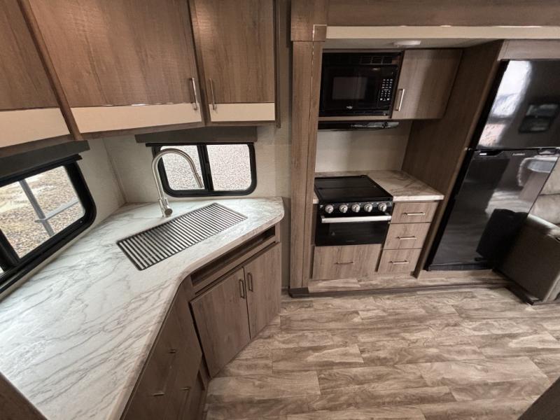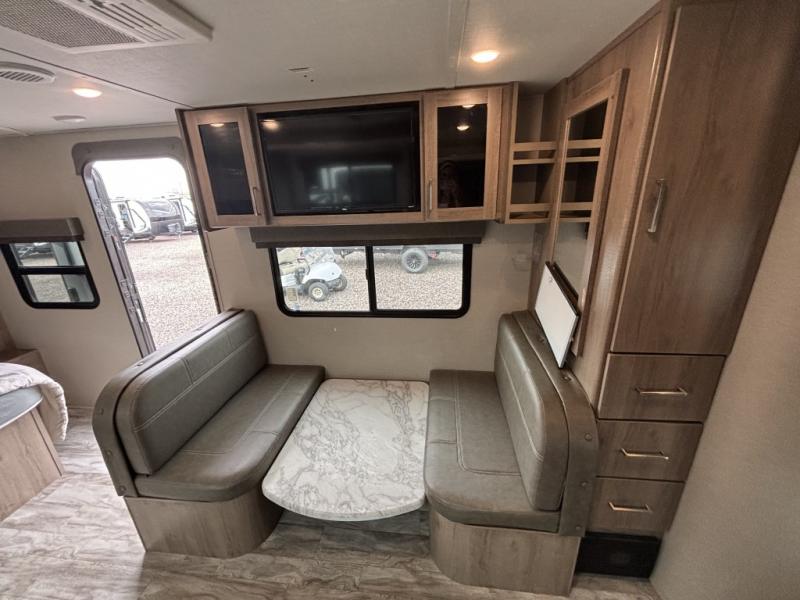 This Imagine XLS travel trailer has theater seating and a booth dinette that you can use any time you need a little break from the outdoors. If you want to come in and grab a coffee, put together a puzzle, or work on your itinerary for the week, just put up your feet and relax. You could even switch on the LED HDTV if you want a little entertainment. The front queen-size bed has a privacy curtain that you can draw to create a semi-private bedroom, and in the back of the trailer you will find the rest of your amenities, like the kitchen and the bathroom. The large slide makes it easy to enjoy spending your time indoors, but if you do want to get back outside, you can sit underneath the 18' electric awning for some shade.