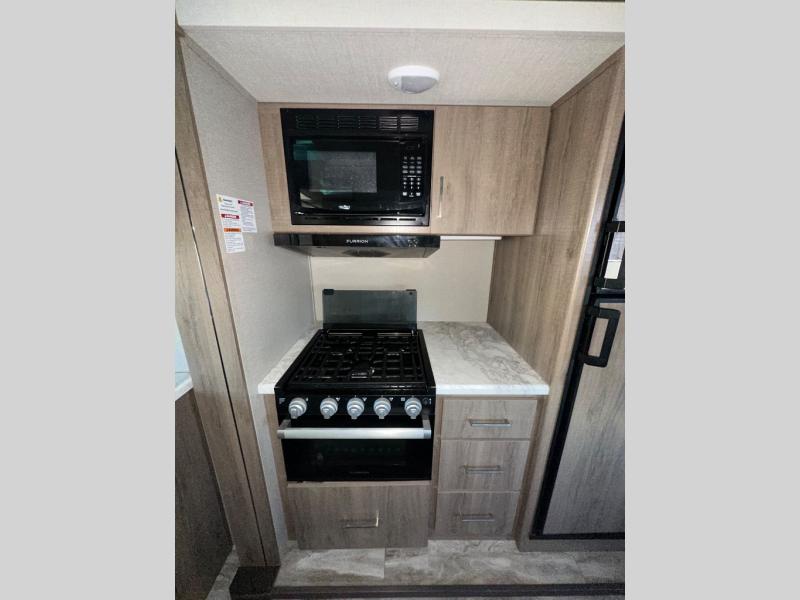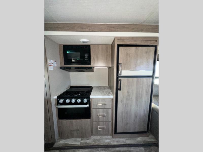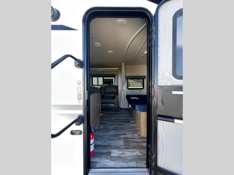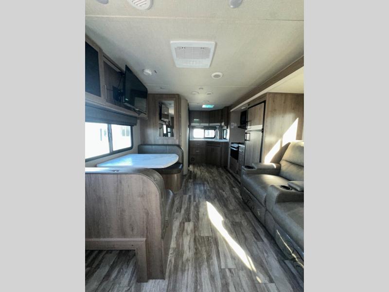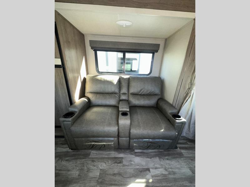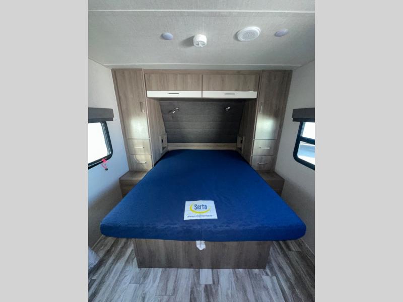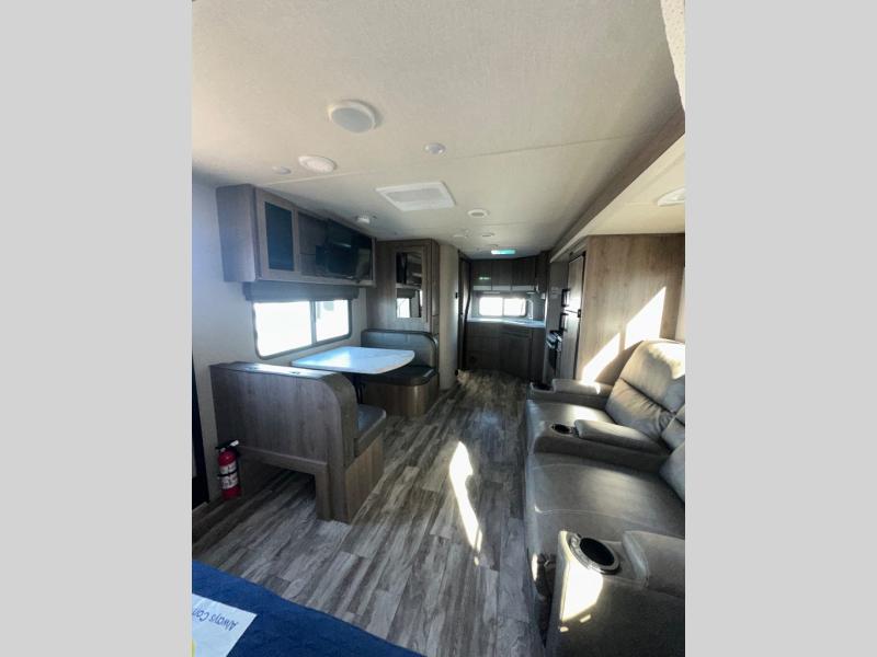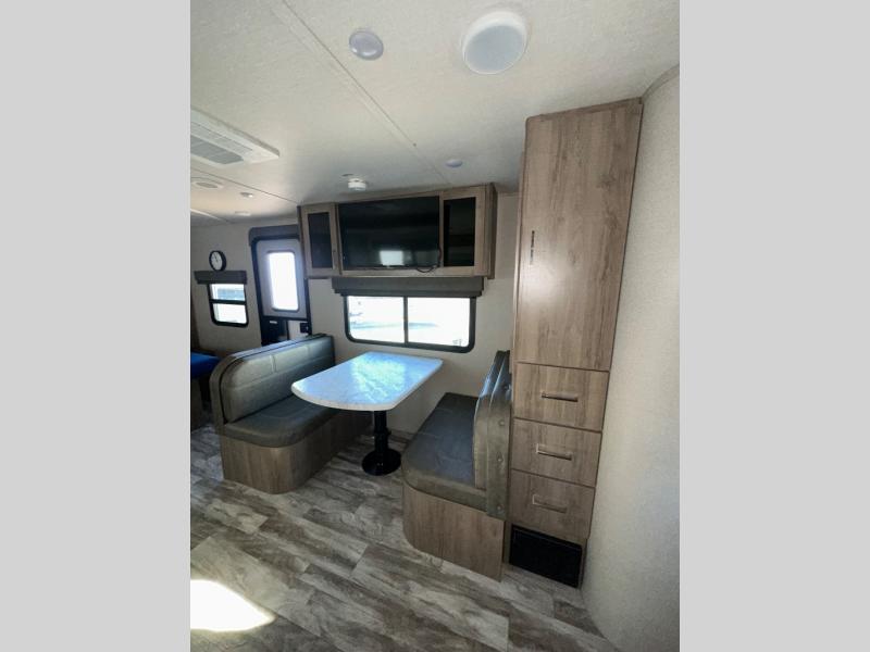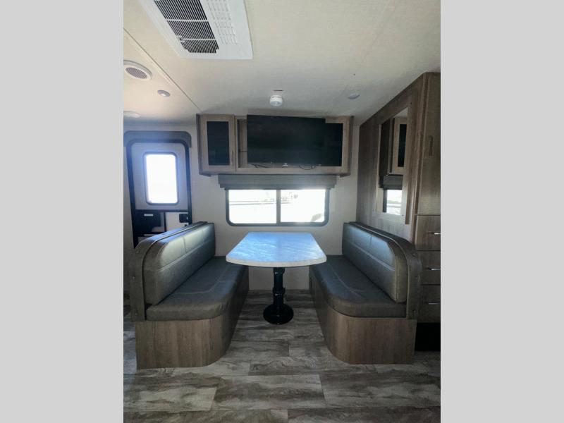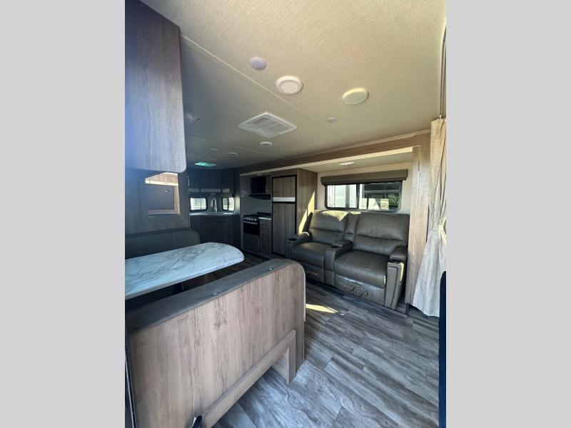 This Imagine XLS travel trailer has theater seating and a booth dinette that you can use any time you need a little break from the outdoors. If you want to come in and grab a coffee, put together a puzzle, or work on your itinerary for the week, just put up your feet and relax. You could even switch on the LED HDTV if you want a little entertainment. The front queen-size bed has a privacy curtain that you can draw to create a semi-private bedroom, and in the back of the trailer you will find the rest of your amenities, like the kitchen and the bathroom. The large slide makes it easy to enjoy spending your time indoors, but if you do want to get back outside, you can sit underneath the 18' electric awning for some shade.