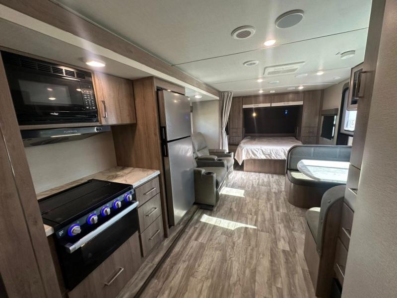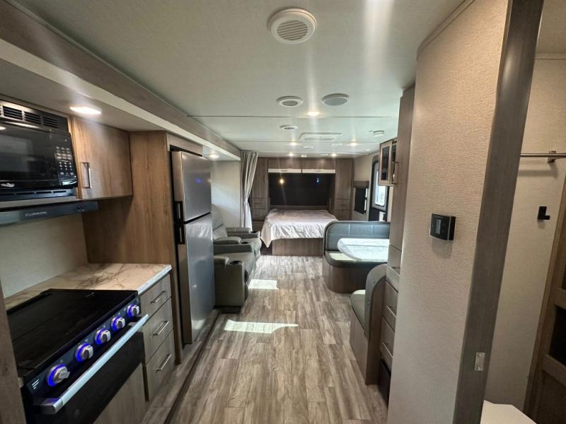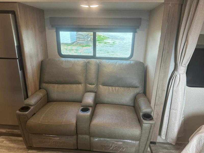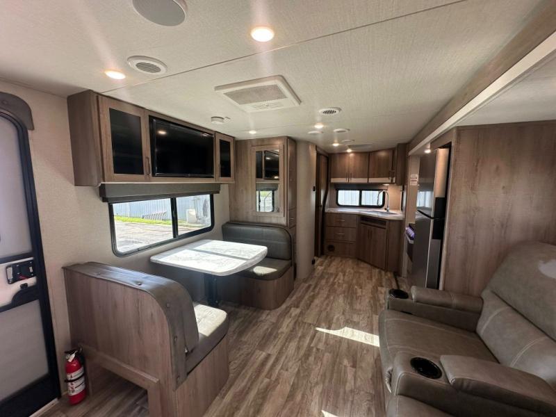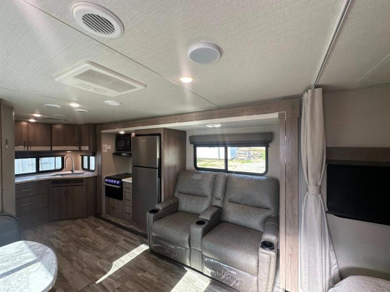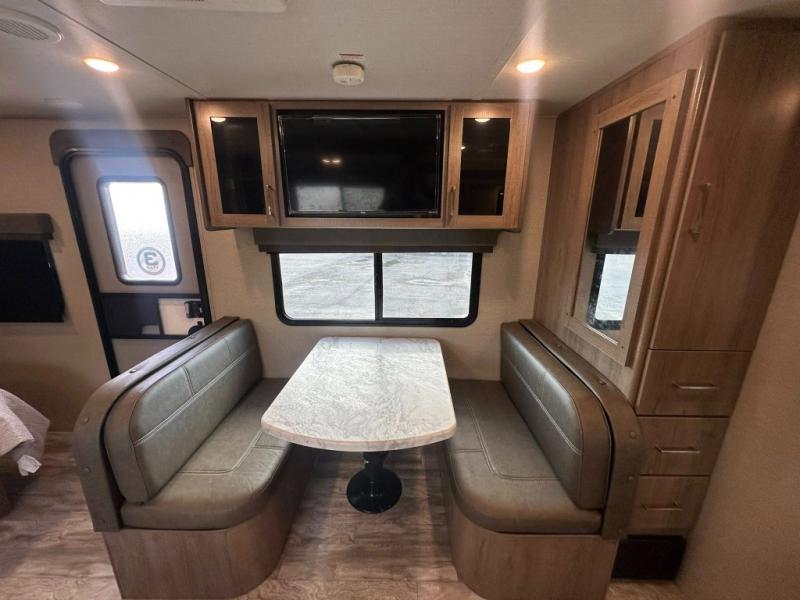 This Imagine XLS travel trailer has theater seating and a booth dinette that you can use any time you need a little break from the outdoors. If you want to come in and grab a coffee, put together a puzzle, or work on your itinerary for the week, just put up your feet and relax. You could even switch on the LED HDTV if you want a little entertainment. The front queen-size bed has a privacy curtain that you can draw to create a semi-private bedroom, and in the back of the trailer you will find the rest of your amenities, like the kitchen and the bathroom. The large slide makes it easy to enjoy spending your time indoors, but if you do want to get back outside, you can sit underneath the 18' electric awning for some shade.
